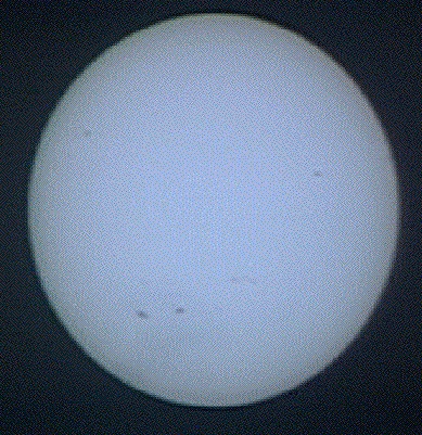 A test sequence of solar images was made with a professional TV camera and a special filter from outside the ESO building on July 29, 1999. Here is one of the frames, as an example. Several sunspots are seen. The Sun on July 29, 1999, at 12:30 UT. Test TV frame from ESO HQ (Garching, Germany) |