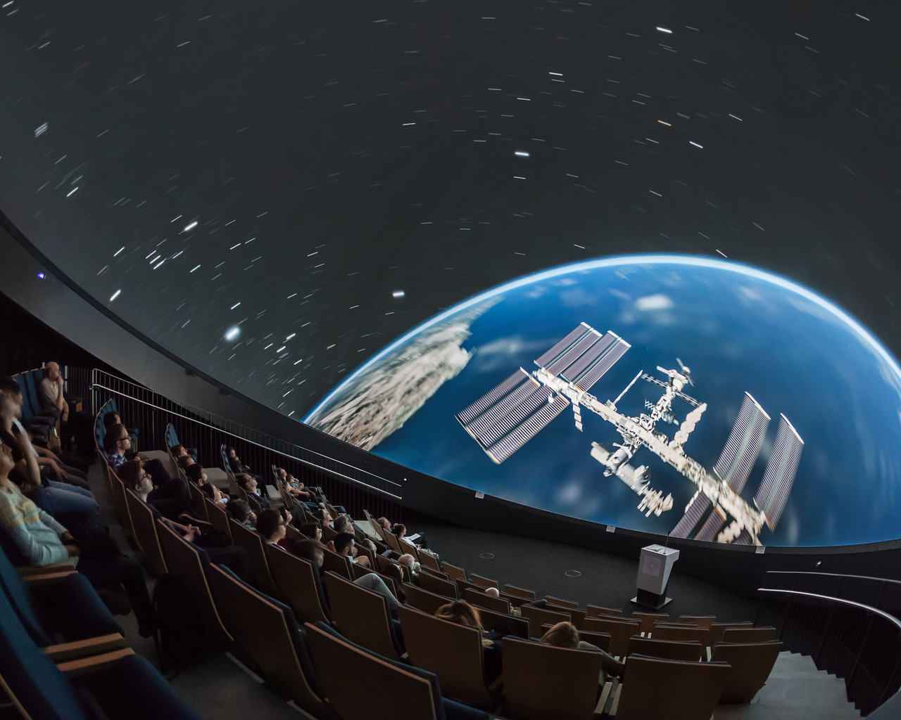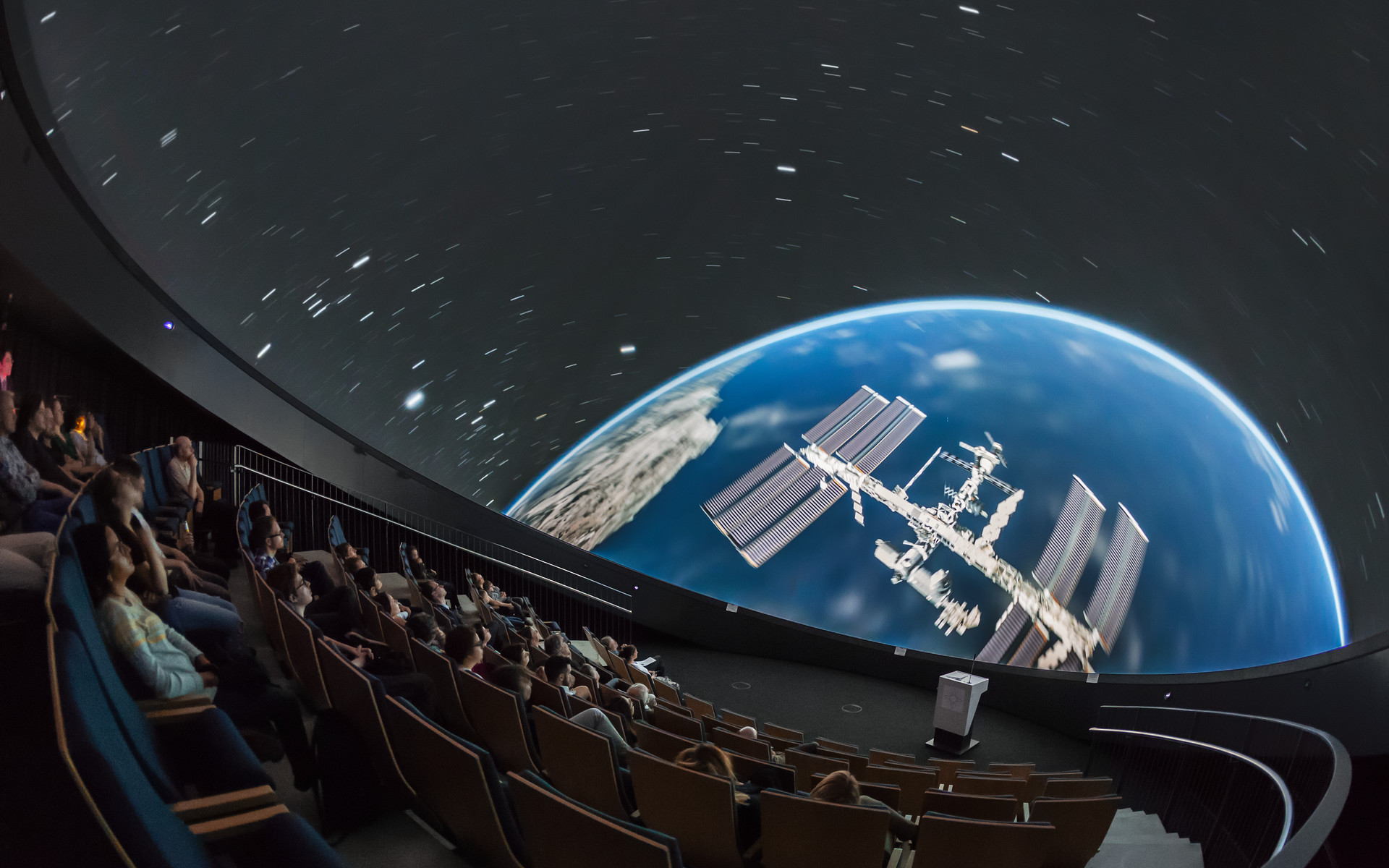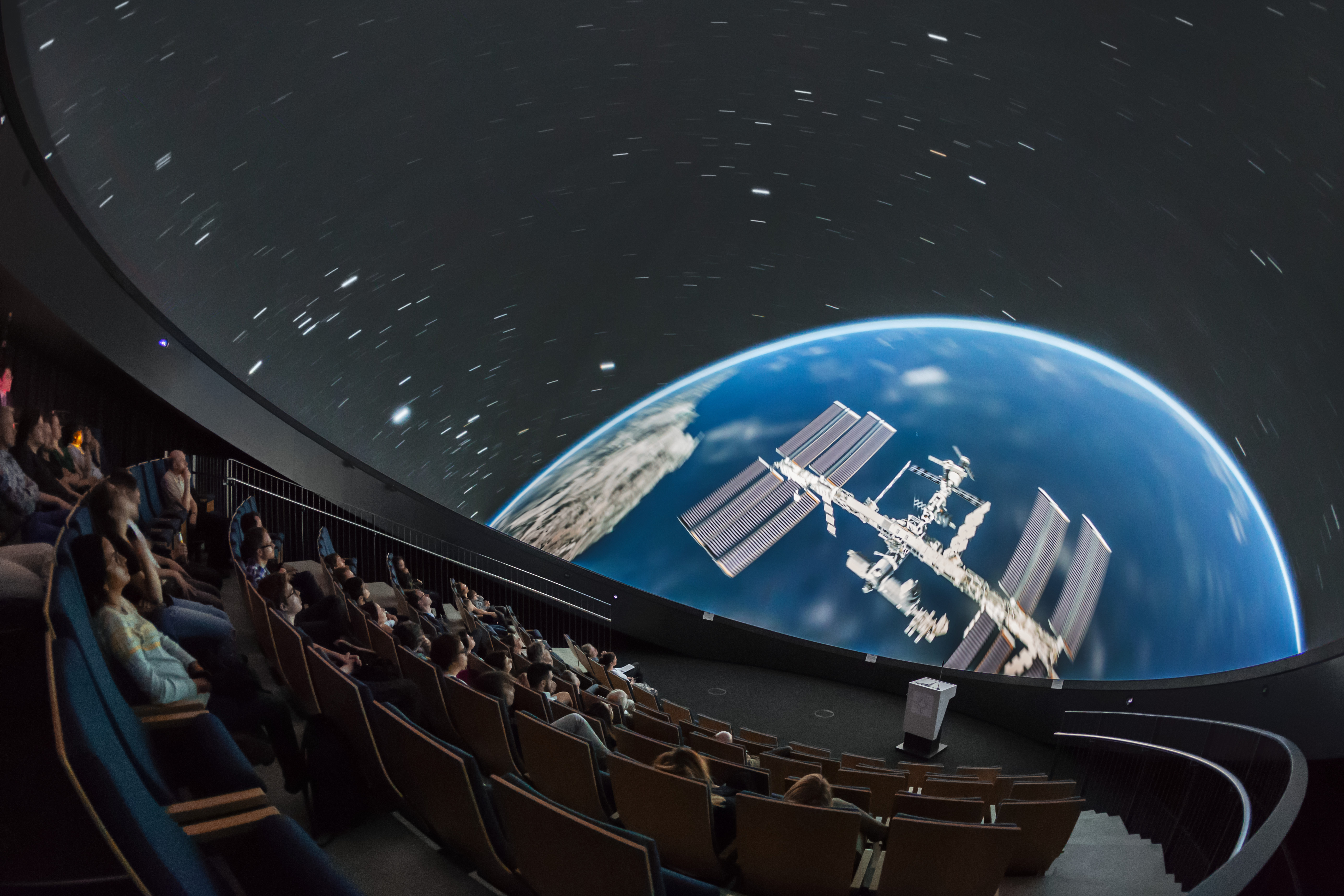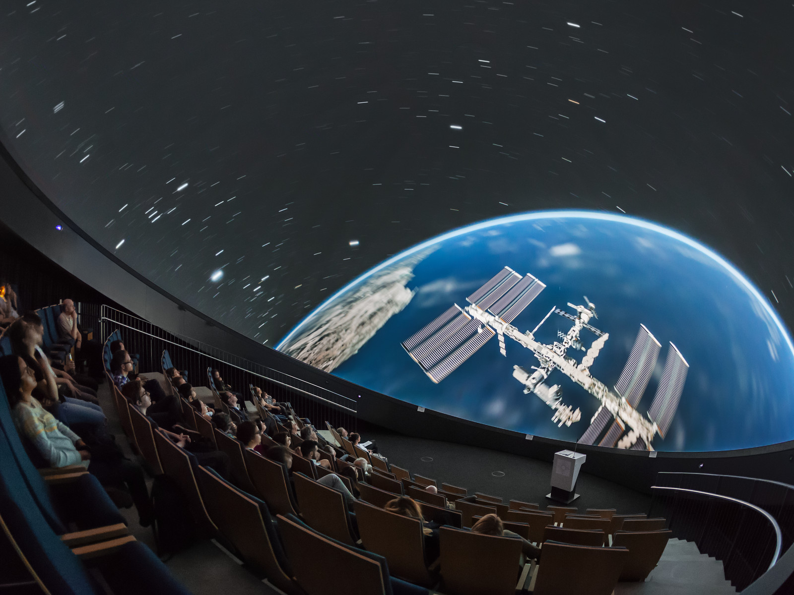 A view from inside the planetarium at the ESO Supernova Planetarium & Visitor Centre, which opened its doors to the public on Saturday 28 April 2018. The building is open five days a week and features planetarium screenings, tours and a permanent exhibition in both German and English. The 25-degree tilted planetarium dome does not just give the audience the sensation of watching the Universe, but of being immersed in it. The habitable artificial satellite, the International Space Station (ISS), appears to hang lazily in Space — although in fact it races along at a pace sufficient to orbit Earth within 90 minutes.