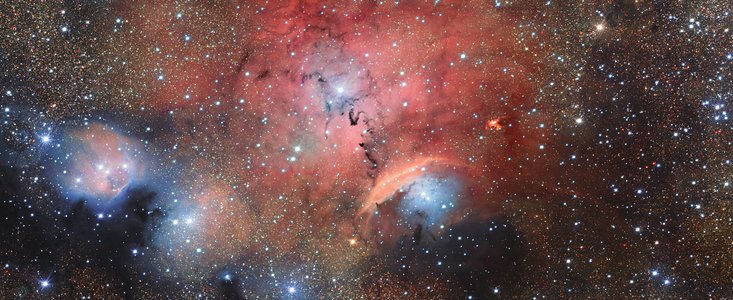 ESO:n VST-teleskoopin OmegaCAM-kamera on taltioinut tämän välkkyvän kuvan Sharpless 29 -nimisestä tähtien lastentarhasta. Tässä jättimäisessä kuvassa näkyy monia tähtitieteellisiä ilmiöitä, mukaanlukien kosmisen tomun ja kaasun pilviä, jotka heijastavat, absorboivat ja jälleensäteilevät sumun kuumien, nuorten tähtien valoa.