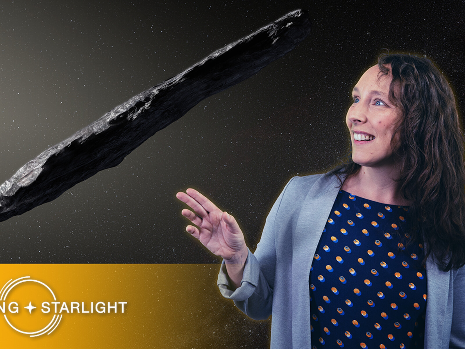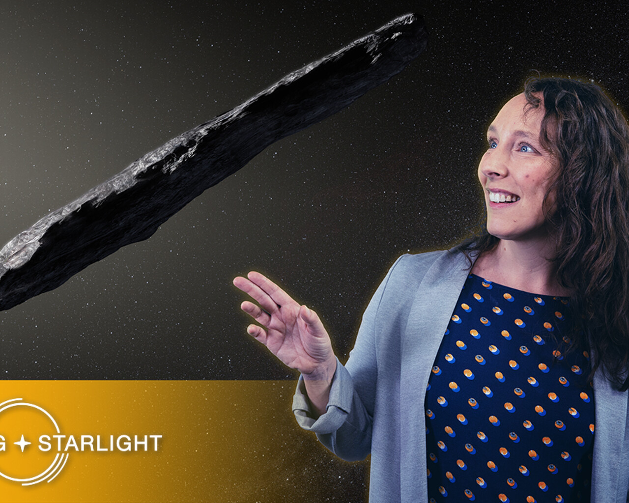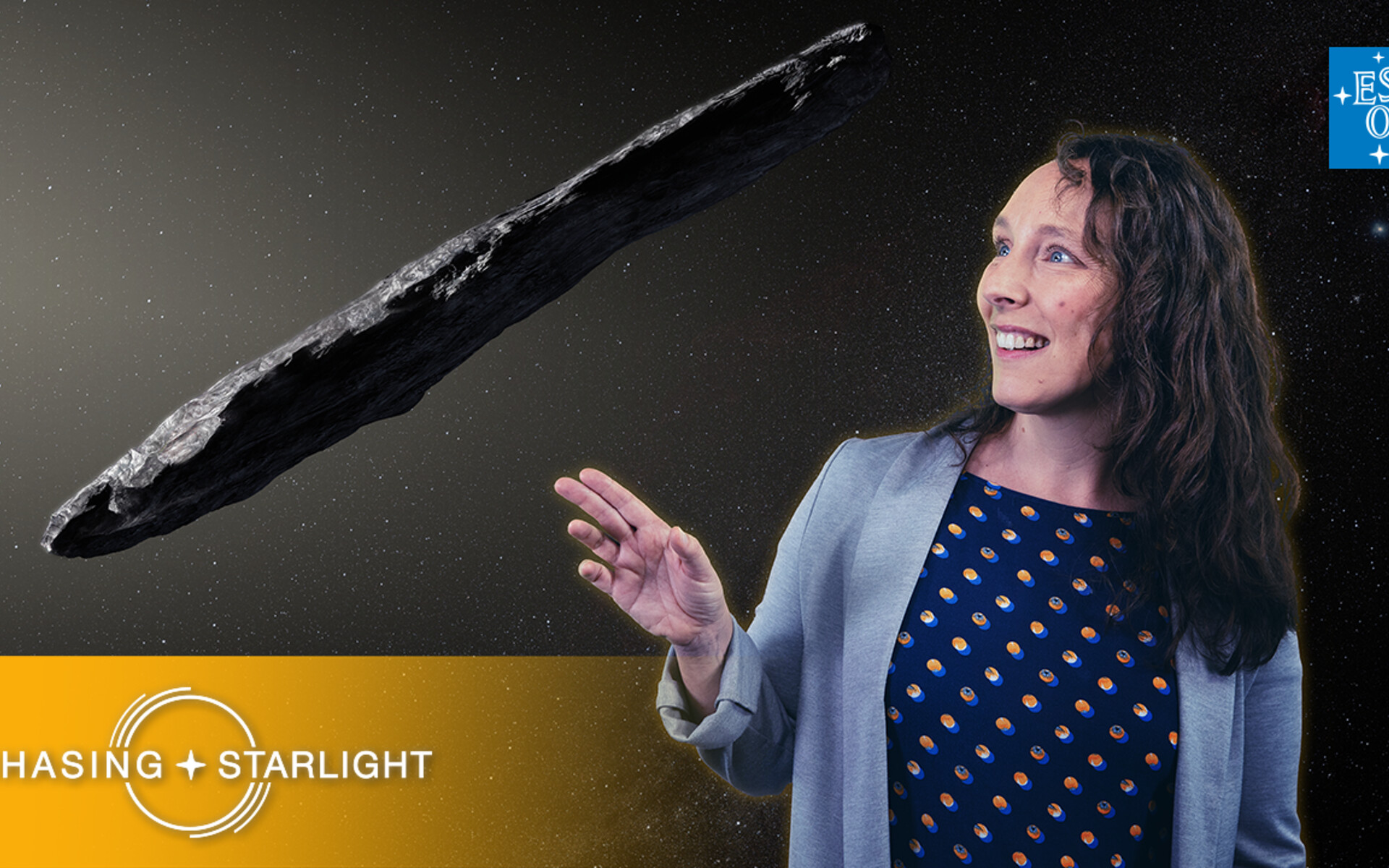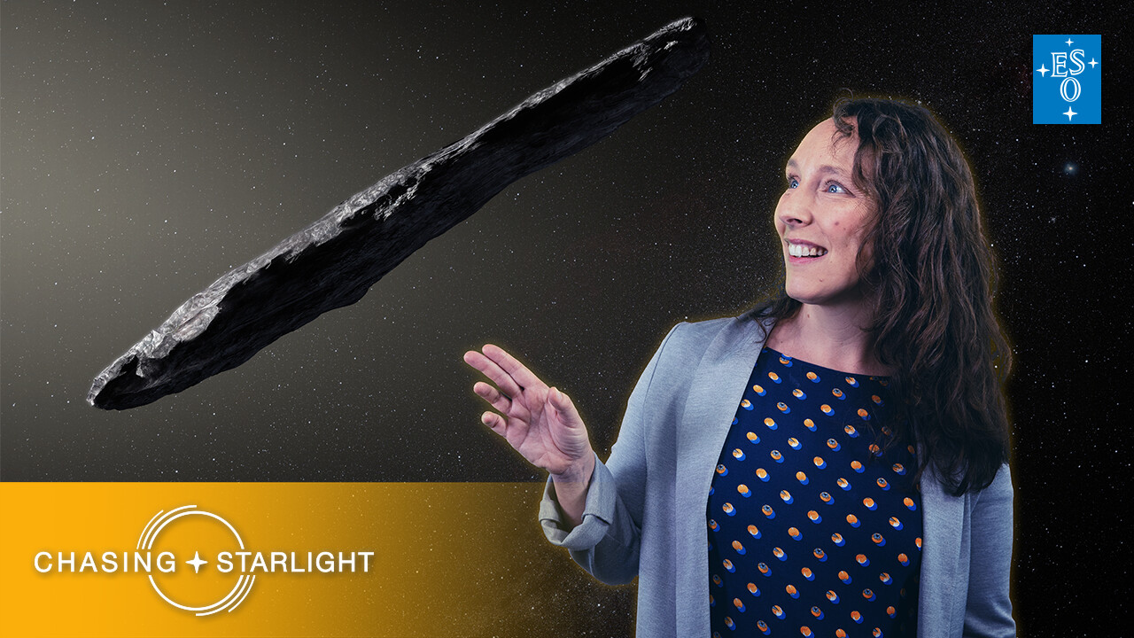 Cette image montre une capture d'écran du matériel promotionnel du premier épisode de Chasing Starlight, la nouvelle émission de l'ESO sur YouTube présentée par l'astronome Suzanna Randall. Ce premier épisode est consacré aux avancées scientifiques du VLT, parmi lesquelles l'étude d'objets interstellaires tels que ʻOumuamua', dont l'image est montrée à la gauche de Suzanna Randall.