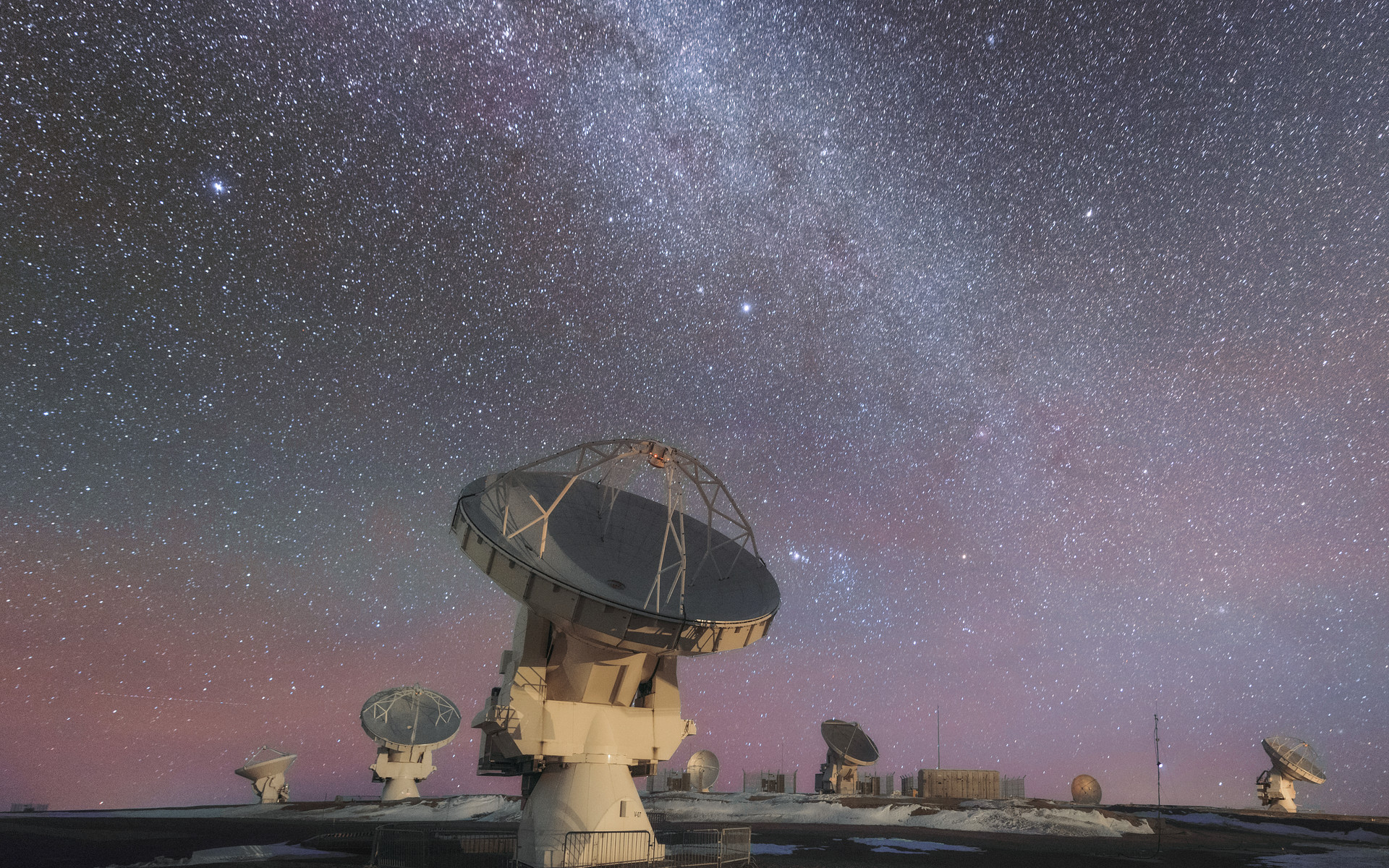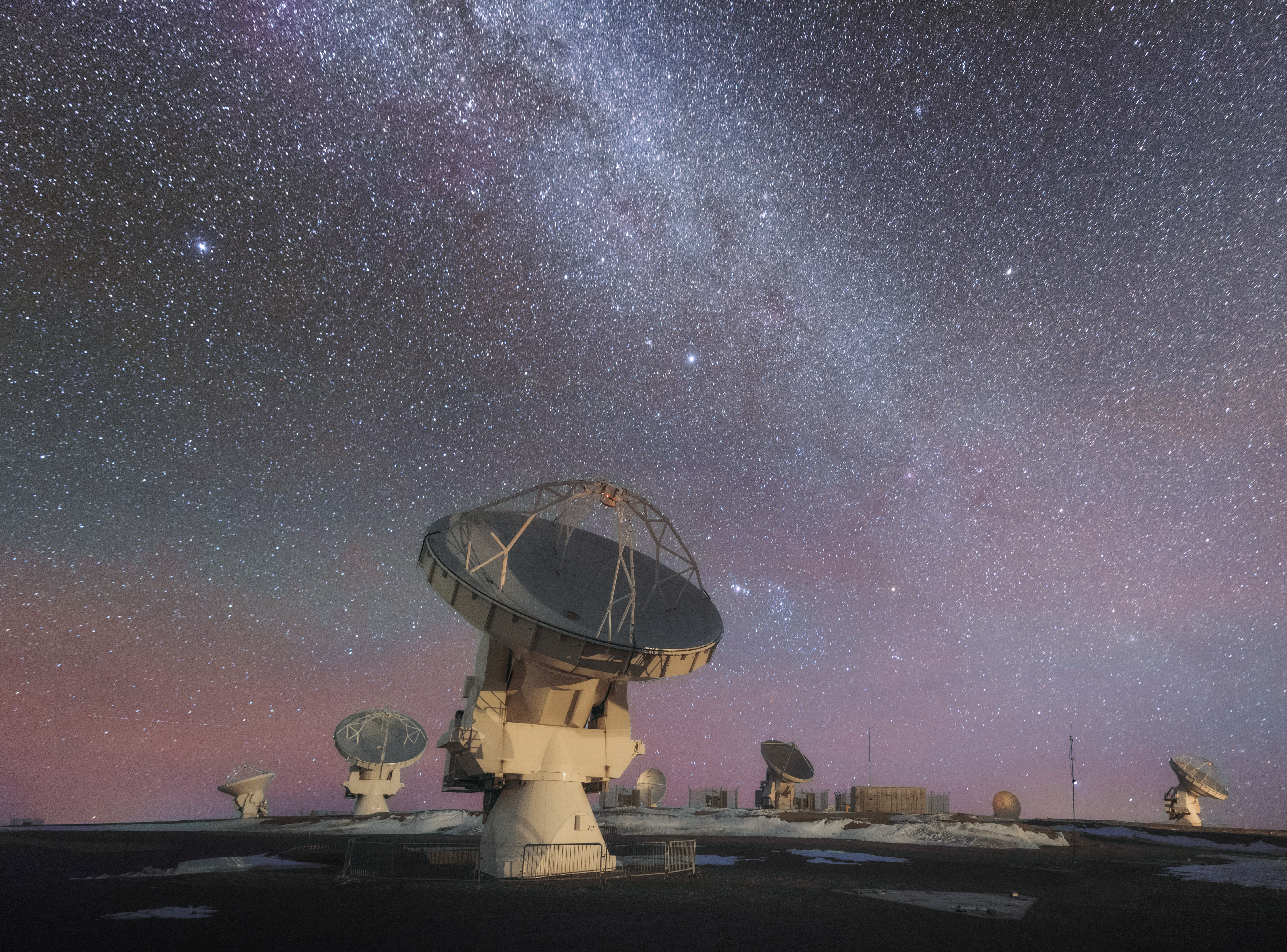 This photo shows ALMA hard at work in the Atacama desert, looking up at the Nights Sky. ALMA is the most powerful telescope for observing the cool Universe — molecular gas and dust as well the distant Universe. ALMA is studying the building blocks of stars, planetary systems, galaxies and life itself.