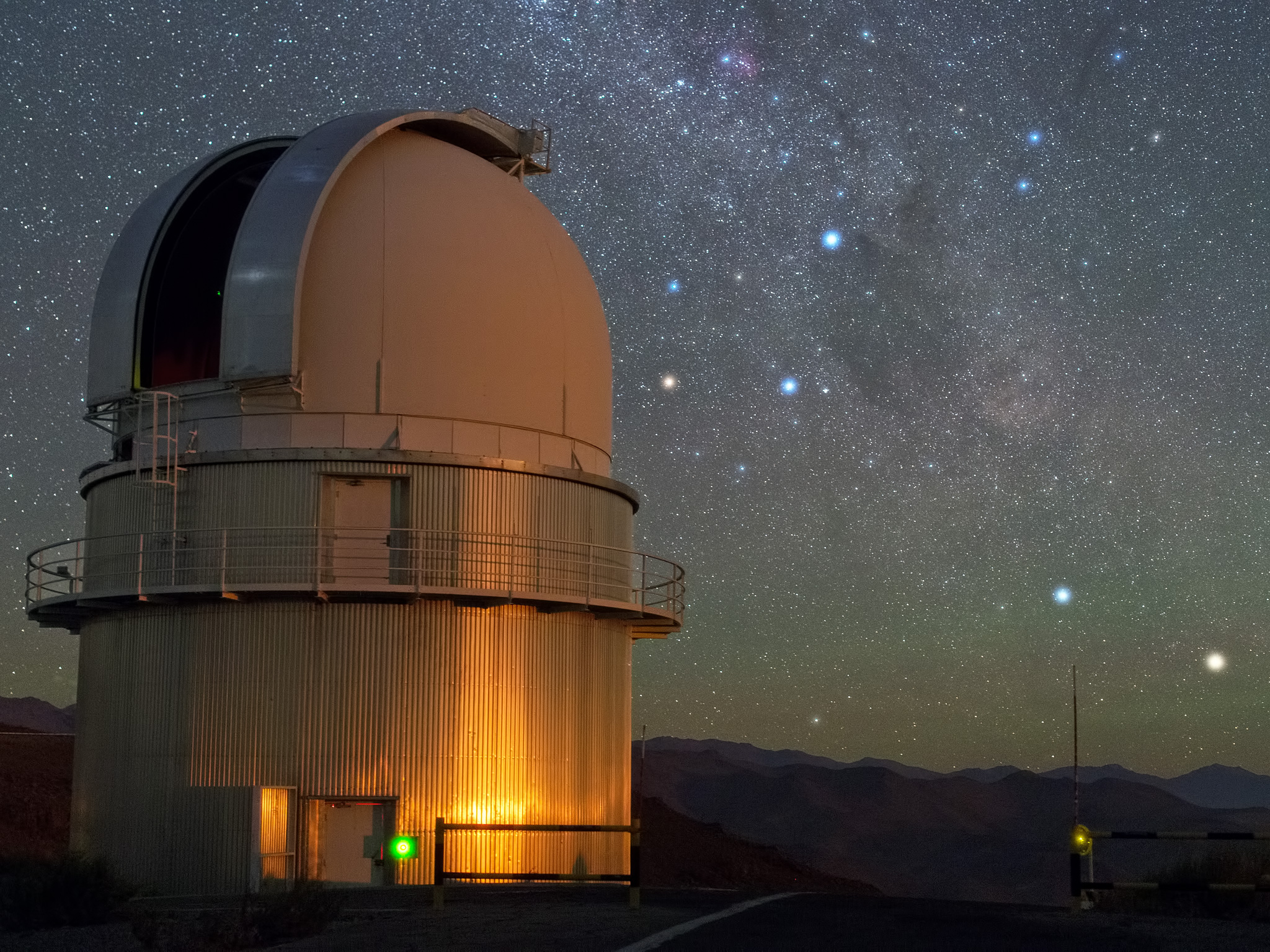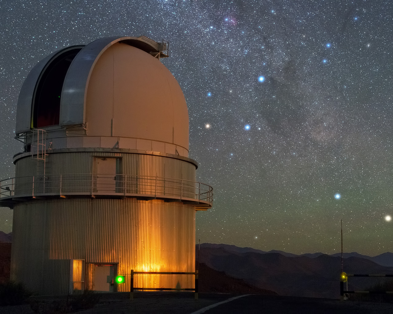 Dans le ciel au-dessus de l’observatoire La Silla d’ESO, la croix du Sud est clairement visible juste à droite du dôme du télescope danois de 1,54 mètre et en bas à droite de cette image, deux étoiles brillent dans cet incroyable ciel noir. De droite à gauche, ce sont Alpha et Beta Centauri.
