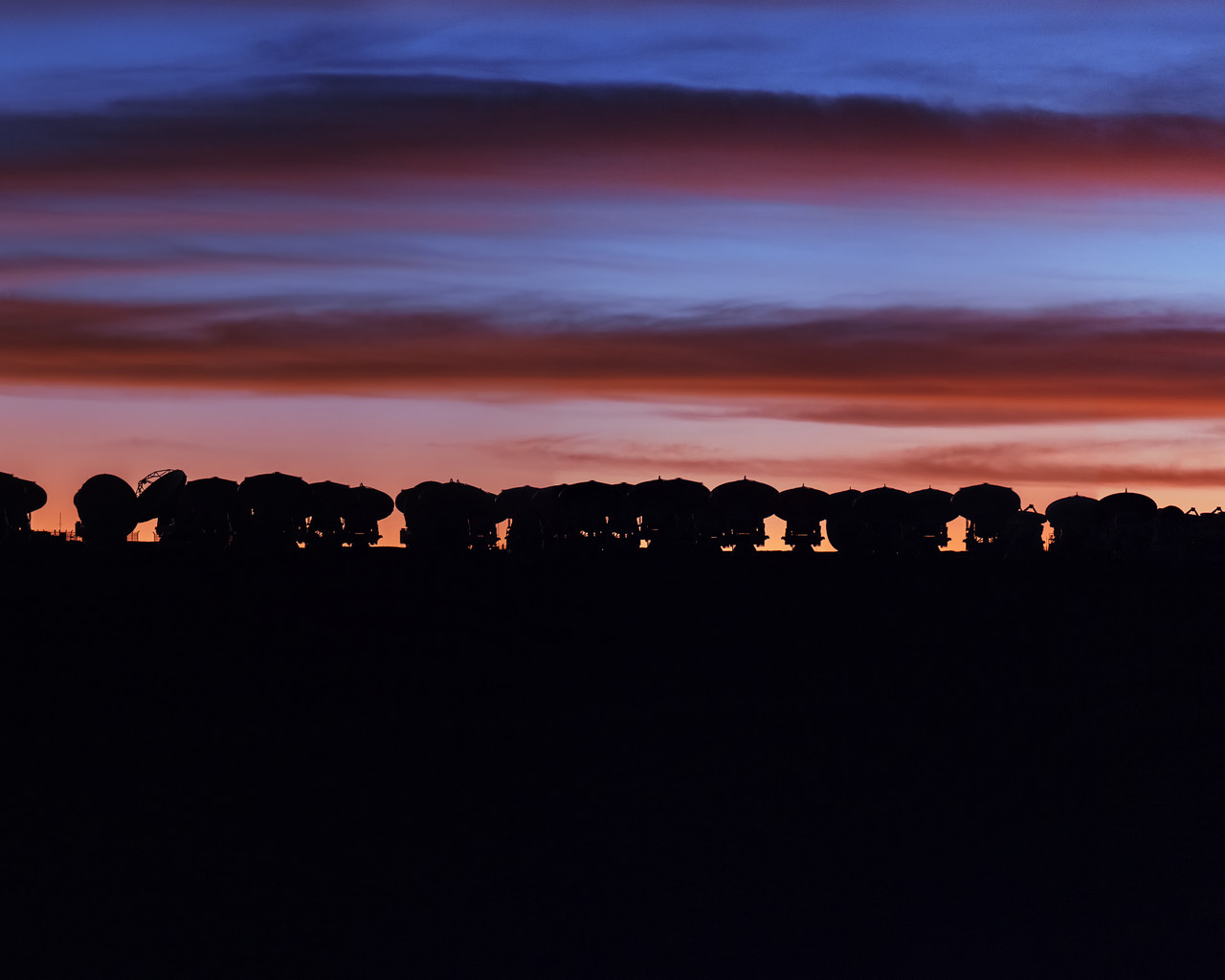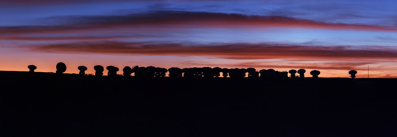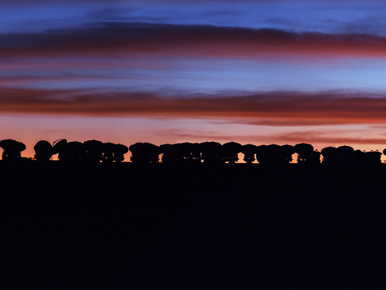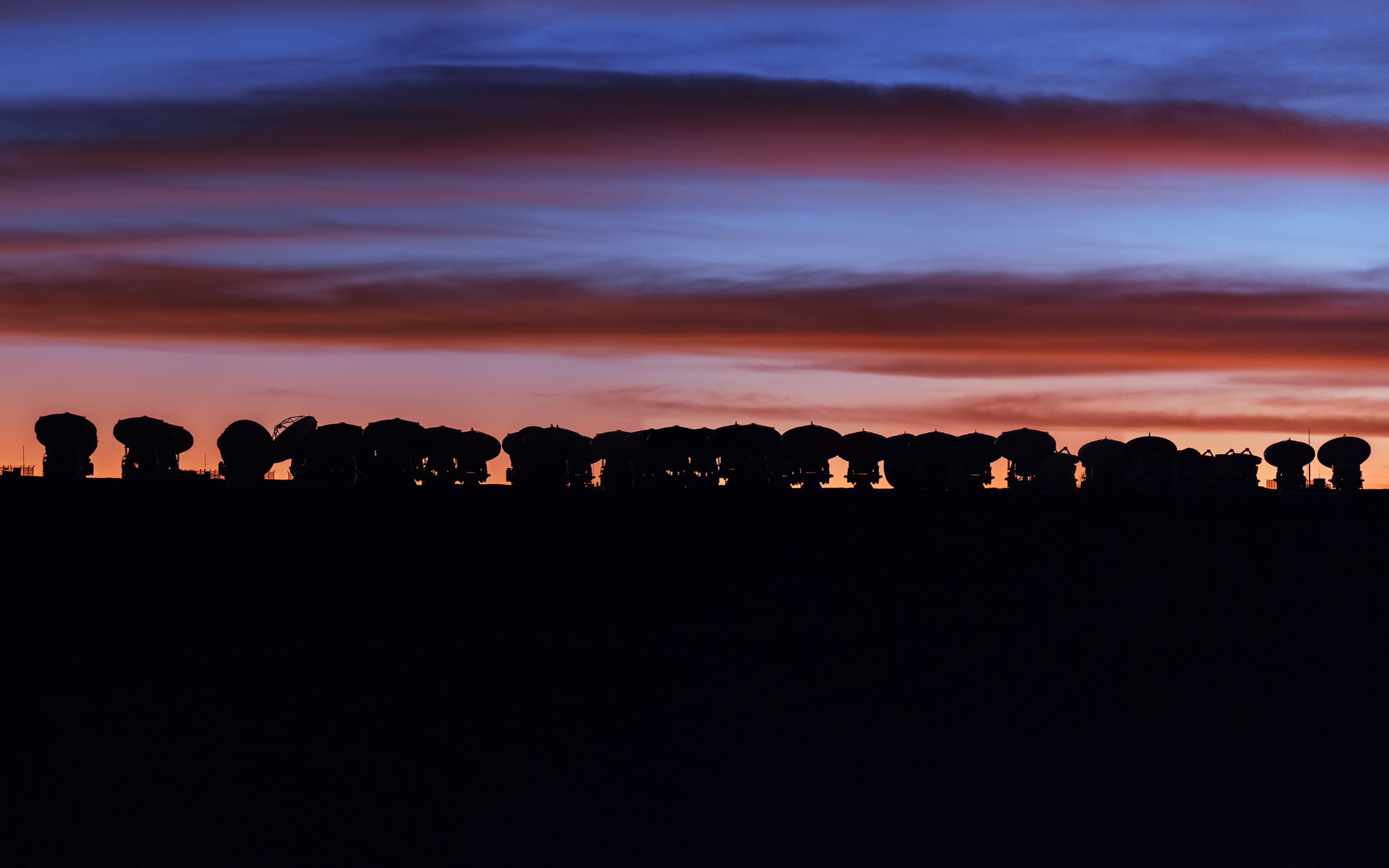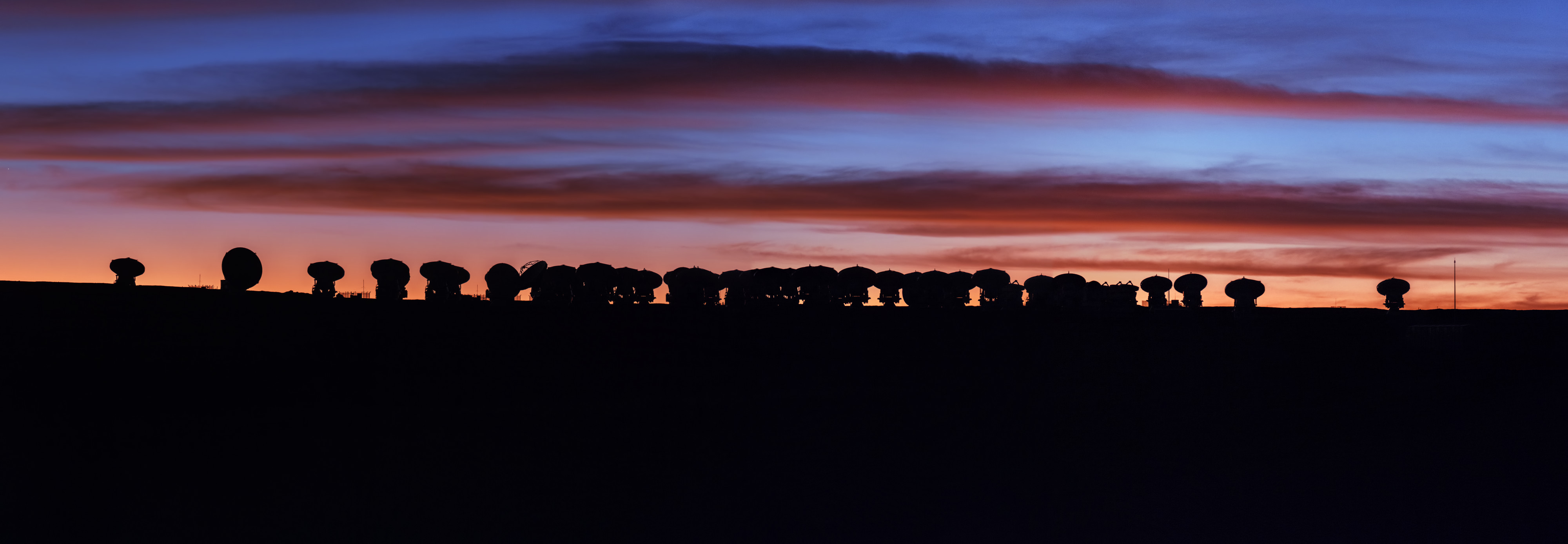 Sur fond d'un magnifique coucher de soleil au-dessus du plateau de Chajnantor, dans le désert d'Atacama, les antennes d’ALMA (Atacama Large Millimeter/submillimeter Array) surveillent le ciel. ALMA, dont l'ESO est partenaire, est le plus grand projet astronomique terrestre existant.