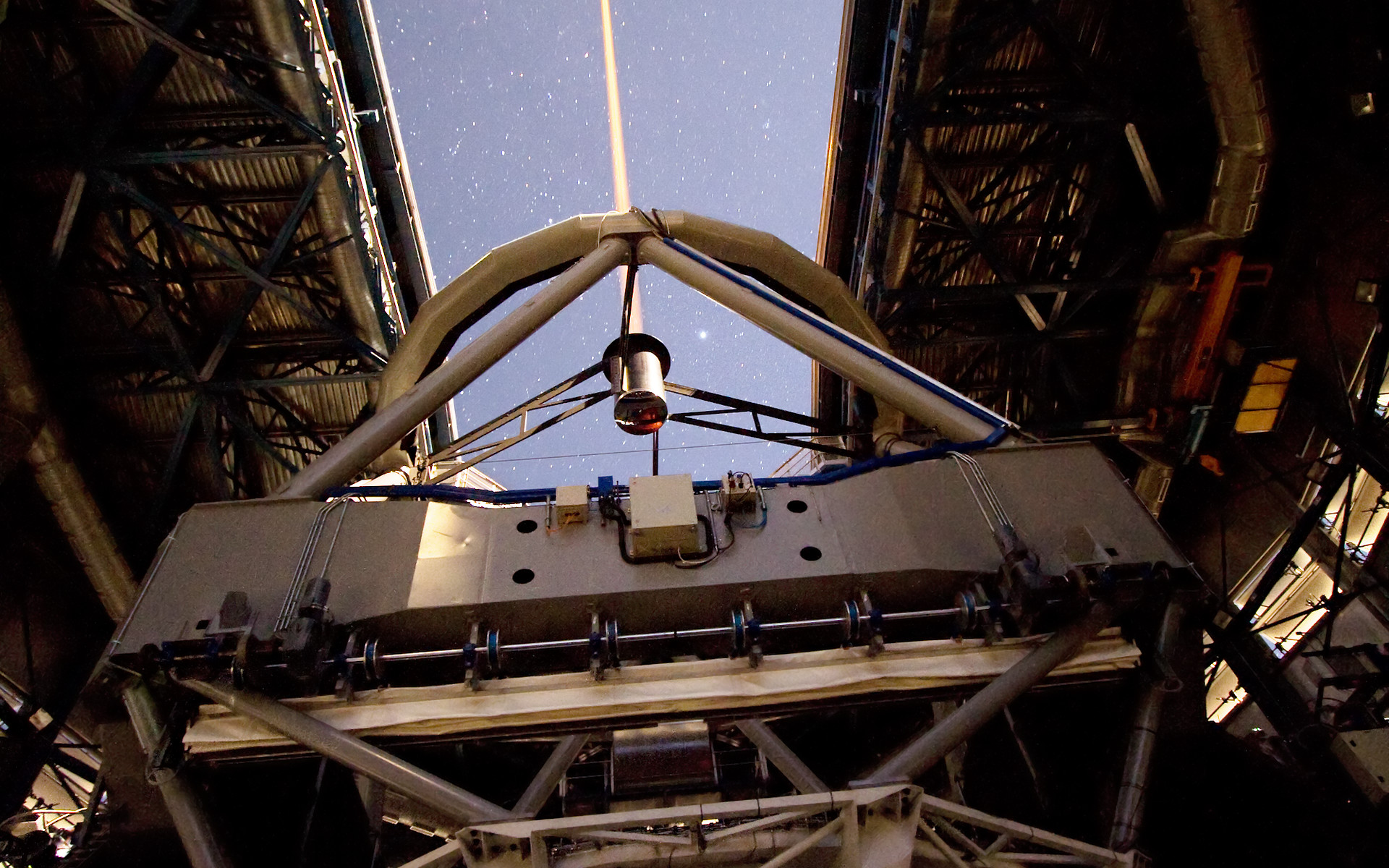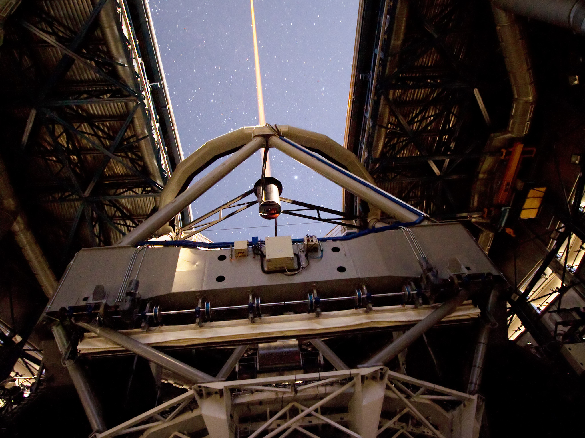 Le lancement d'un laser aussi puissant à partir d'un télescope est une technologie de pointe, dont la mise en place et le fonctionnement sont un défi permanent. Comme on peut le voir sur l'image, il s'agit cependant d'une technologie désormais bien maîtrisée sur Paranal. L'image a été prise de l'intérieur du dôme du télescope et révèle bien comment le laser est situé au dessus du miroir secondaire de 1,2 mètre du télescope.