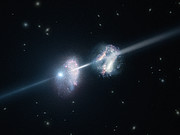 Une équipe internationale d'astronomes a utilisé la brève mais intense lumière émise par un sursaut gamma pour étudier la composition chimique de galaxies très lointaines. Etonnamment, les nouvelles observations, effectuées à l'aide du VLT, le très grand télescope de l'ESO, ont dévoilé deux galaxies de l'Univers primordial plus riches en éléments chimiques lourds que le Soleil. Les deux galaxies en question sont probablement en train de fusionner. Ce type d'évènement, survenu dans l'Univers primordial, conduit à la formation en grand nombre de nouvelles étoiles et peut être à l'origine de sursauts gamma.