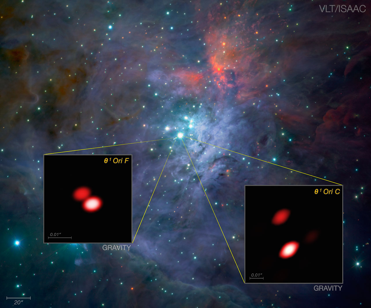 Parmi les observations de cette première campagne, l'équipe a pointé l’instrument sur de jeunes étoiles brillantes de l'Amas du Trapèze situé au cœur de la région de formation stellaire de la constellation d'Orion. Ces premières données de test ont déjà permis à GRAVITY d'effectuer une petite découverte : l'un des composants de l'amas est un système d'étoiles doubles [3].