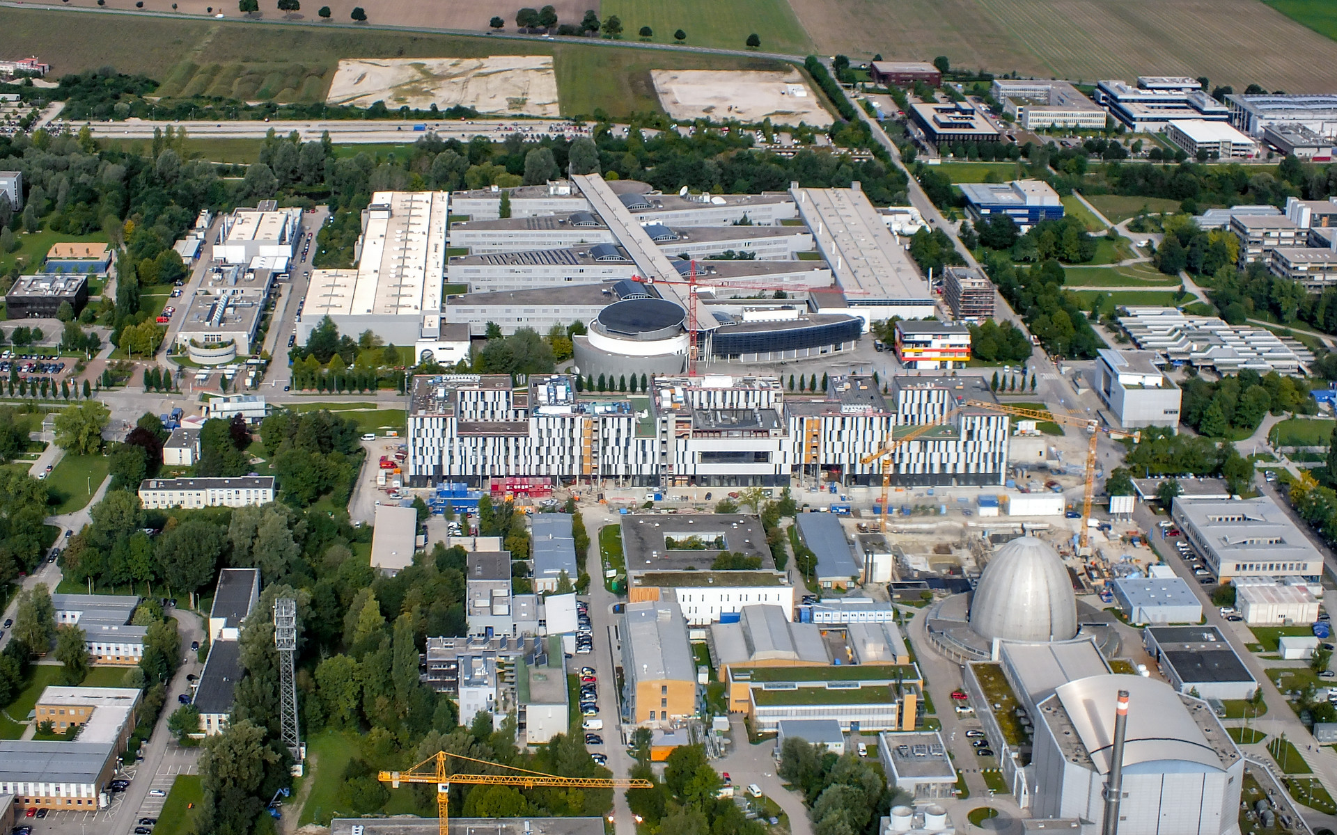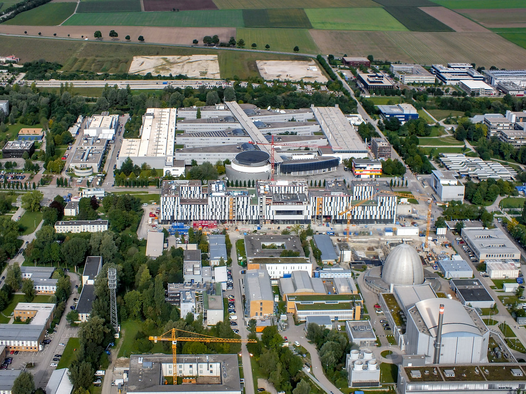 Aerial view of the Galileo Centre on the Technische Universität München Forschungszentrum, currently under construction in Garching bei München, Germany. The Forschungszentrum is also home to the Headquarters of the European Southern Observatory.