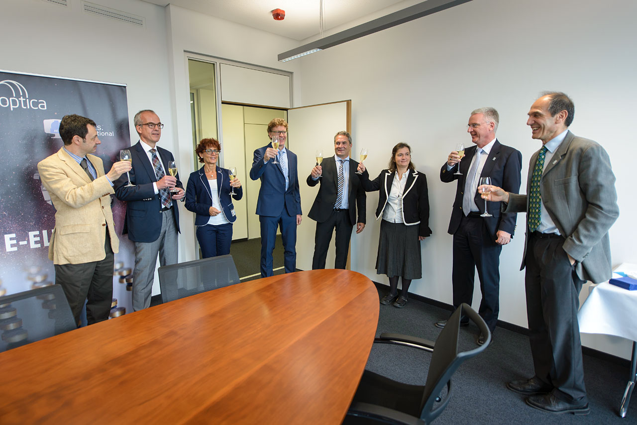 Der Vertrag wurde am 19. Juni 2015 von Vertretern von AdOptica und der ESO am ESO-Hauptsitz feierlich unterzeichnet.