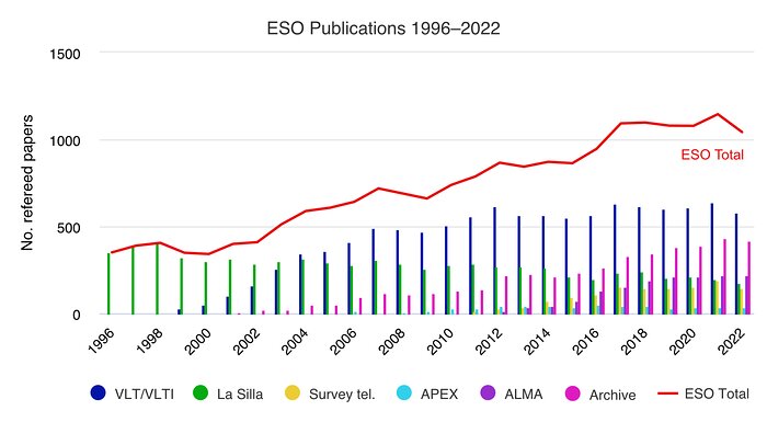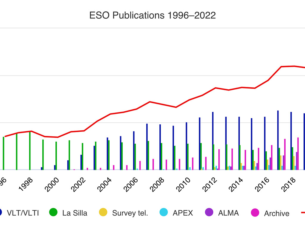 Die Anzahl der veröffentlichten begutachteten Arbeiten basiert auf Daten von ESO-Observatorien, Observatorien, an denen die ESO Partner ist (ALMA und APEX), und Archivdaten von 1996 bis 2021. Diese Zahlen stammen aus der Teleskopbibliografie der ESO, telbib.