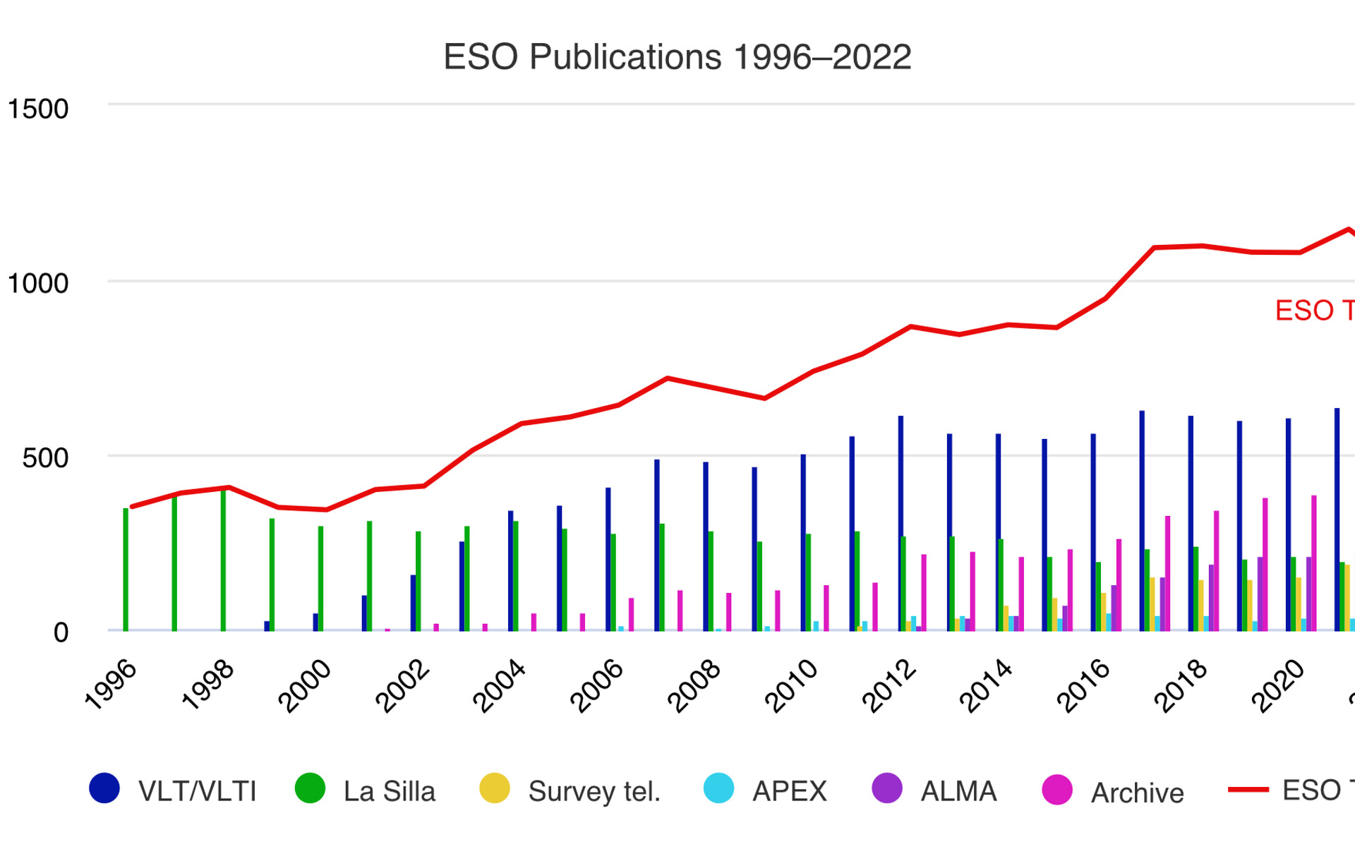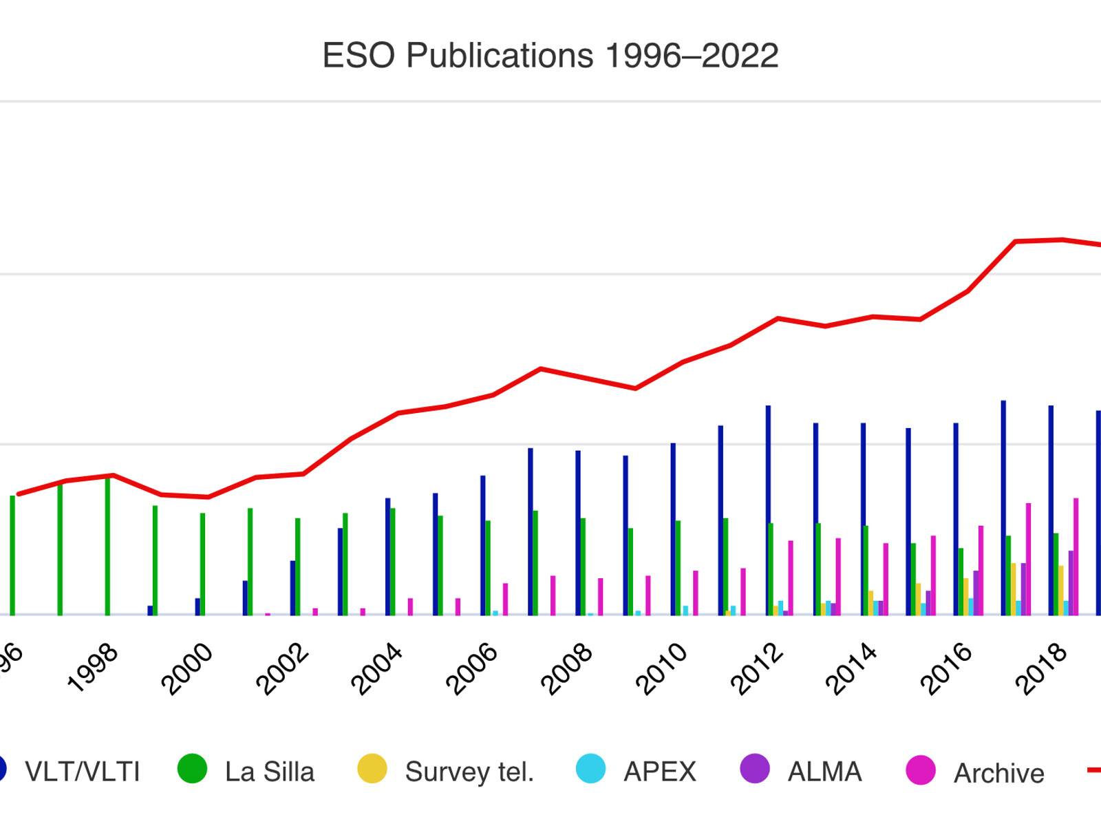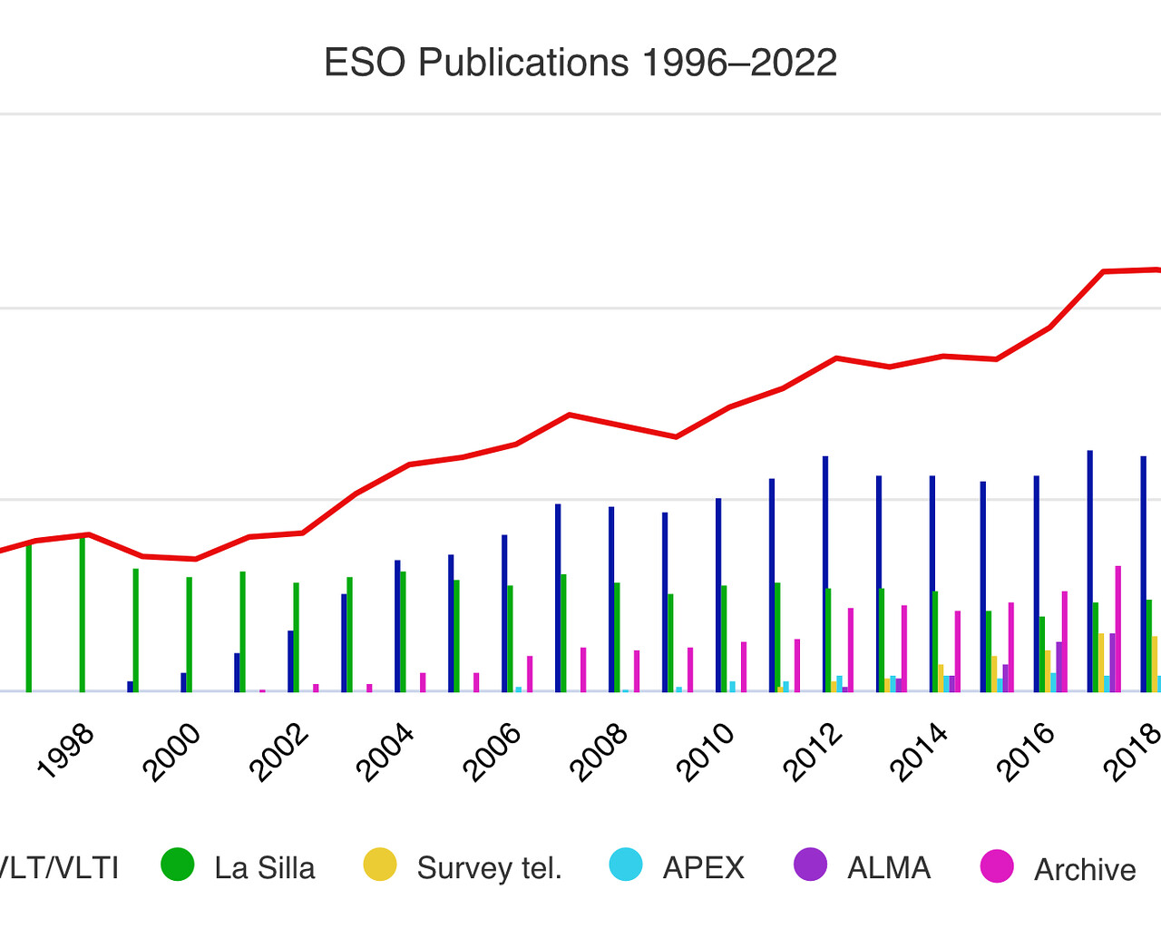 Anzahl der veröffentlichten Artikel basierend auf Daten, die an ESO-Observatorien gewonnen wurden (1996–2022)