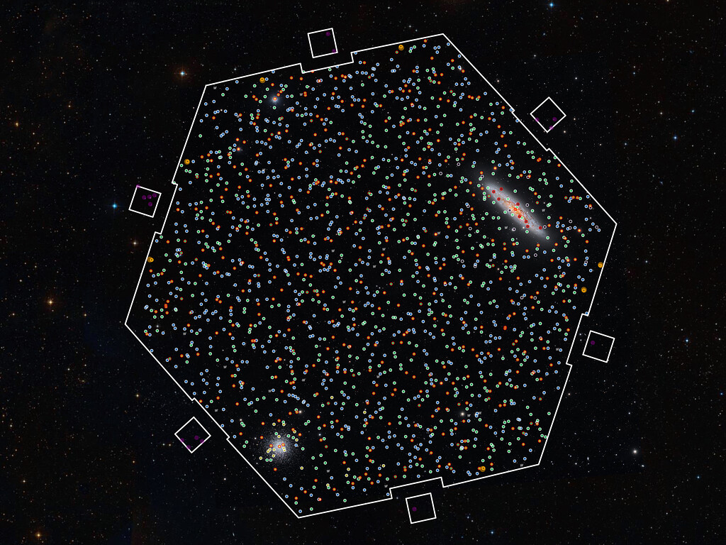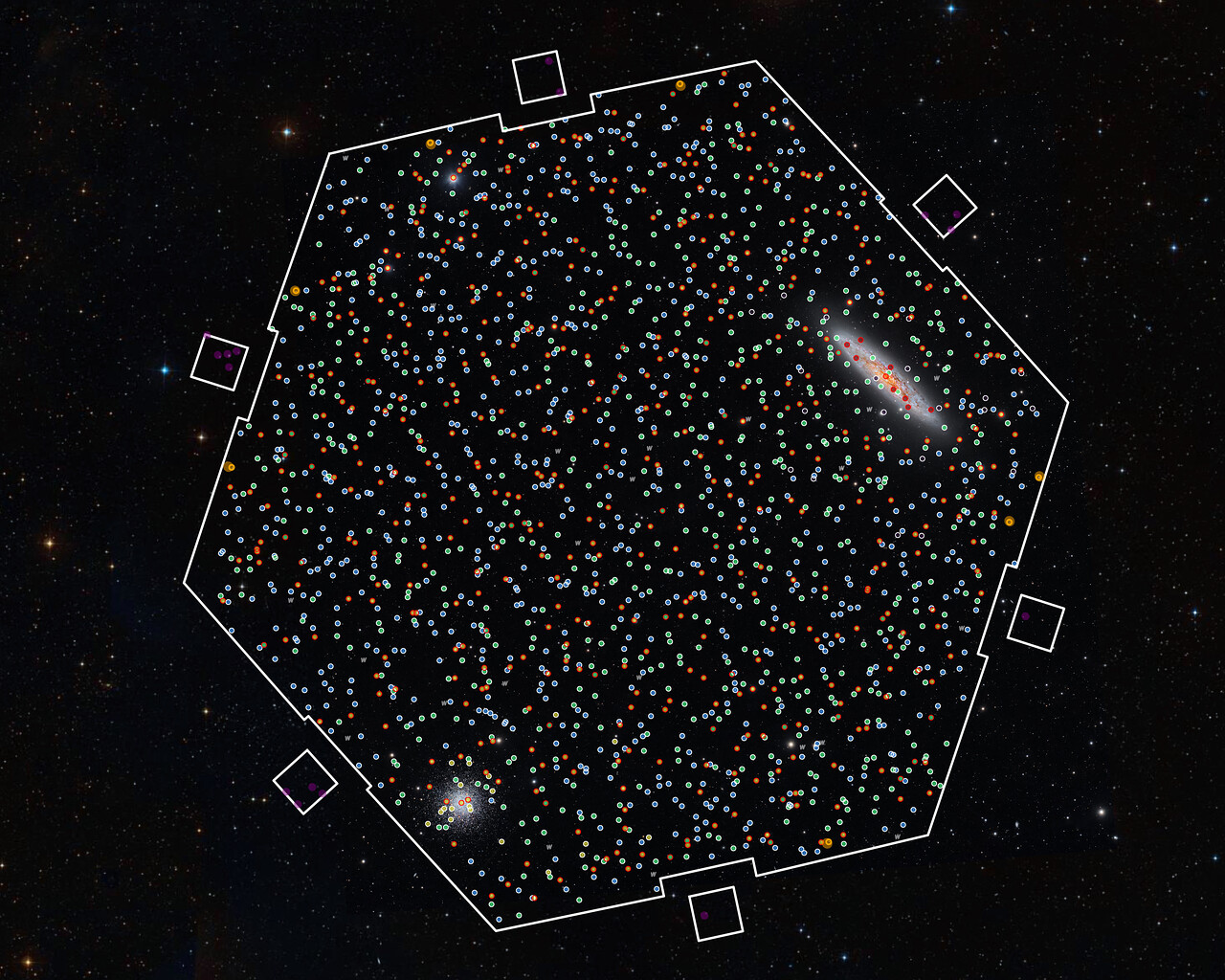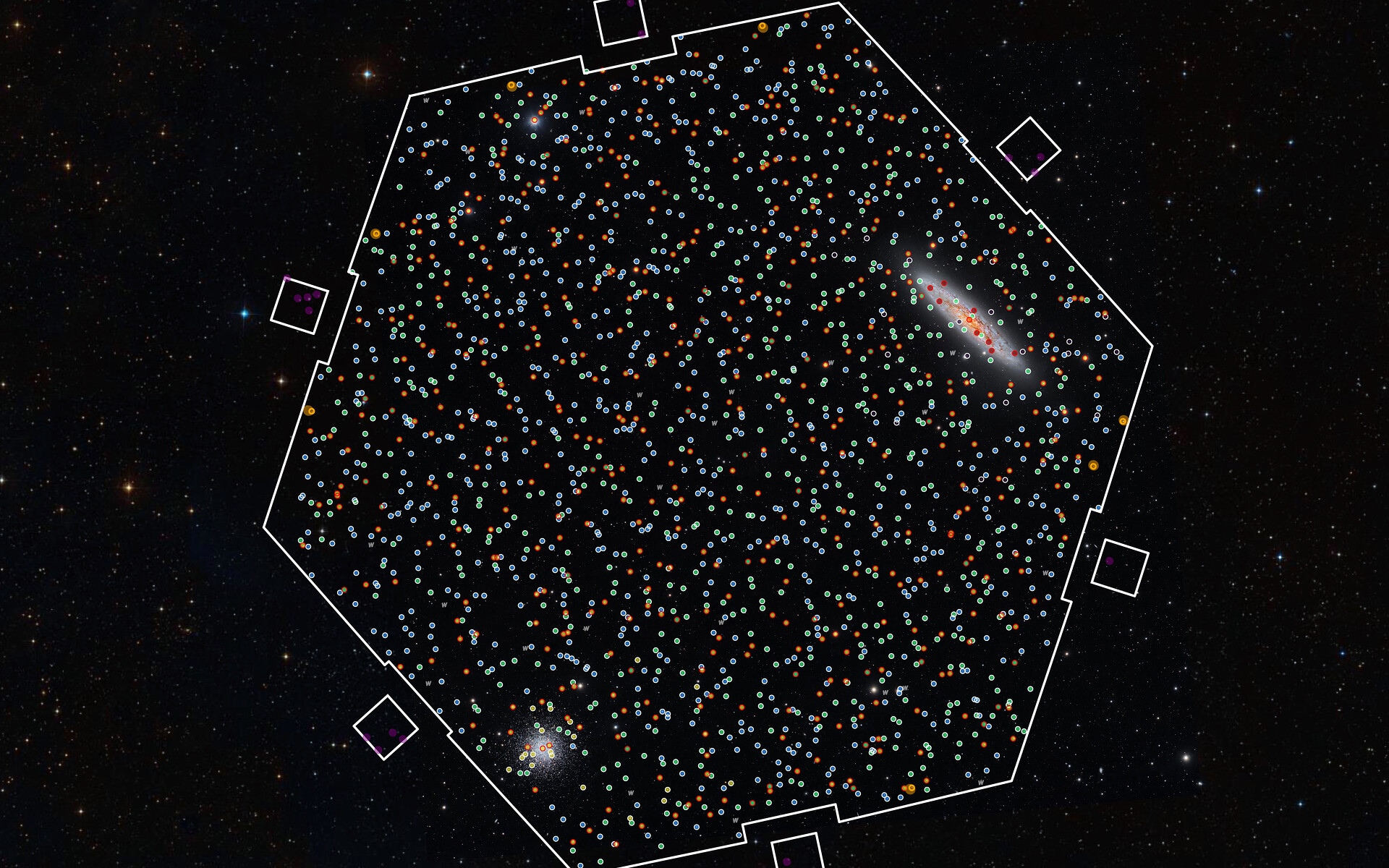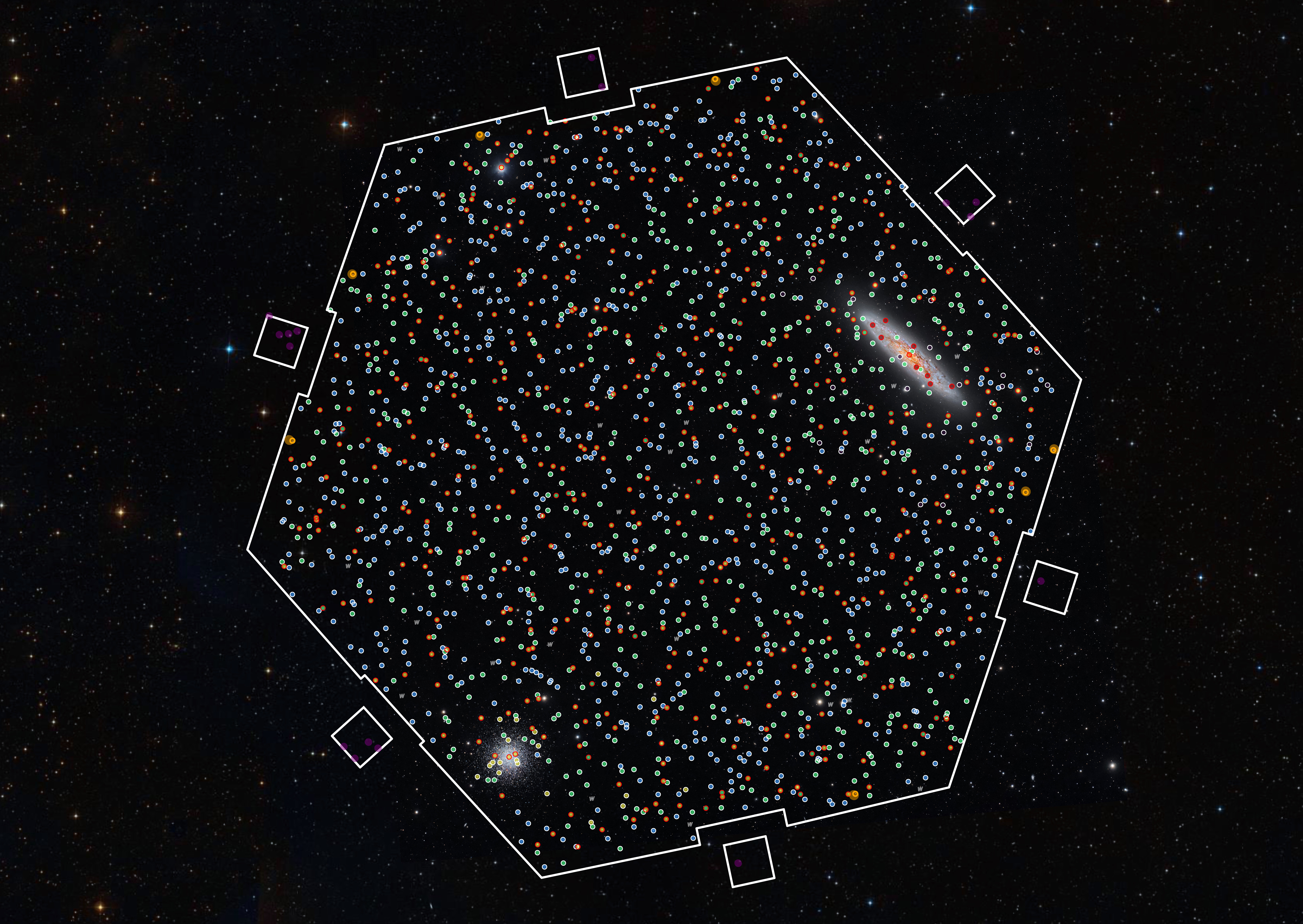 Am 18. Oktober nutzte das Instrument 4MOST erstmals seine 2400 Fasern, um das Licht verschiedener kosmischer Objekte zu analysieren. Der Spektrograf, der am VISTA-Teleskop der ESO installiert ist, beobachtete einen großen Ausschnitt des Himmels, der zwei markante Objekte enthielt: die Sculptor-Galaxie und den Kugelsternhaufen NGC 288. Dieses Bild zeigt das sechseckige Sichtfeld von 4MOST und die vielen Objekte (markiert mit verschiedenfarbigen Punkten für verschiedene Objekttypen), die es bei seinen ersten Testbeobachtungen analysiert hat. 4MOST hat für jedes dieser einzelnen Objekte ein Spektrum aufgenommen, sodass wir ihre Eigenschaften wie chemische Zusammensetzung oder Temperatur untersuchen können.