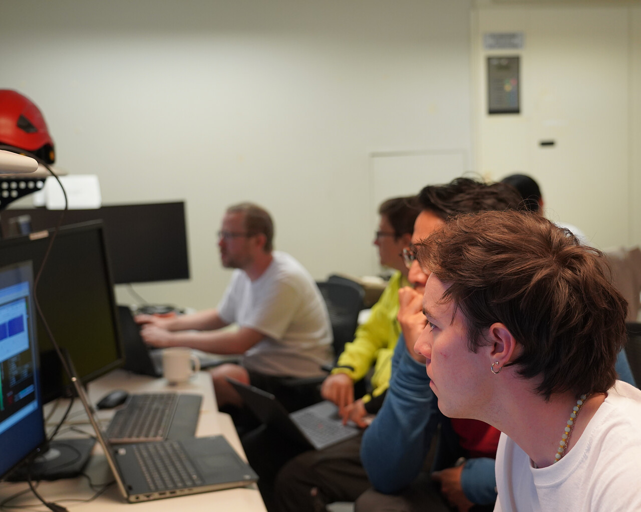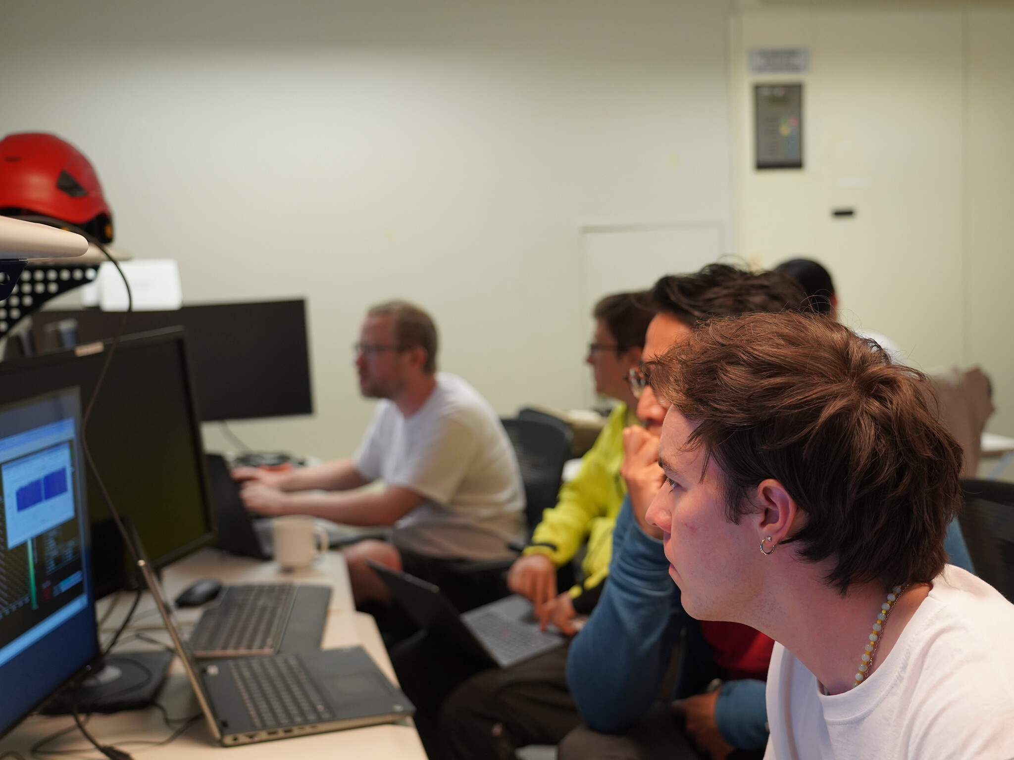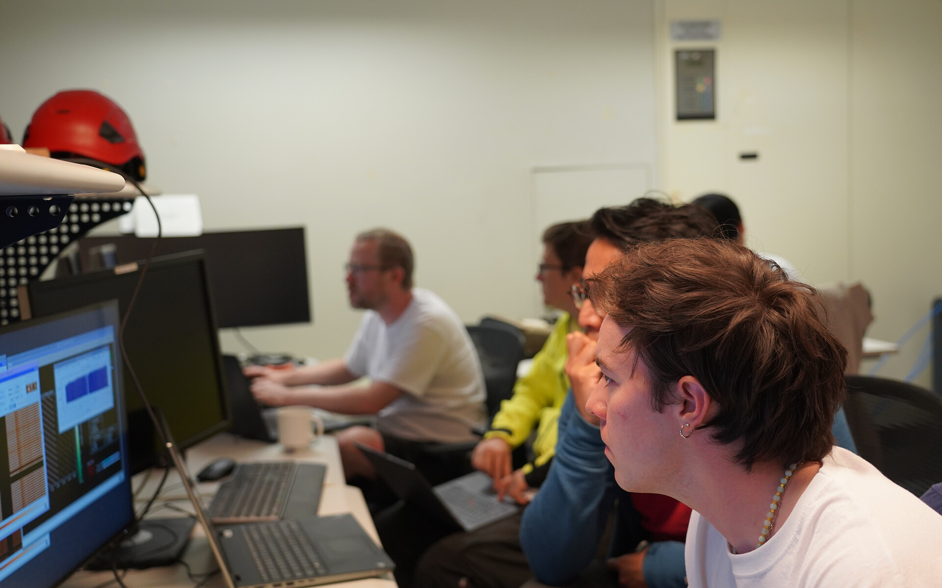 Dieses Foto, aufgenommen im Kontrollraum des Paranal-Observatoriums der ESO, zeigt einen Teil des 4MOST-Teams, das die ersten vom Instrument erfassten Daten während der ersten Testbeobachtungen aufmerksam betrachtet.