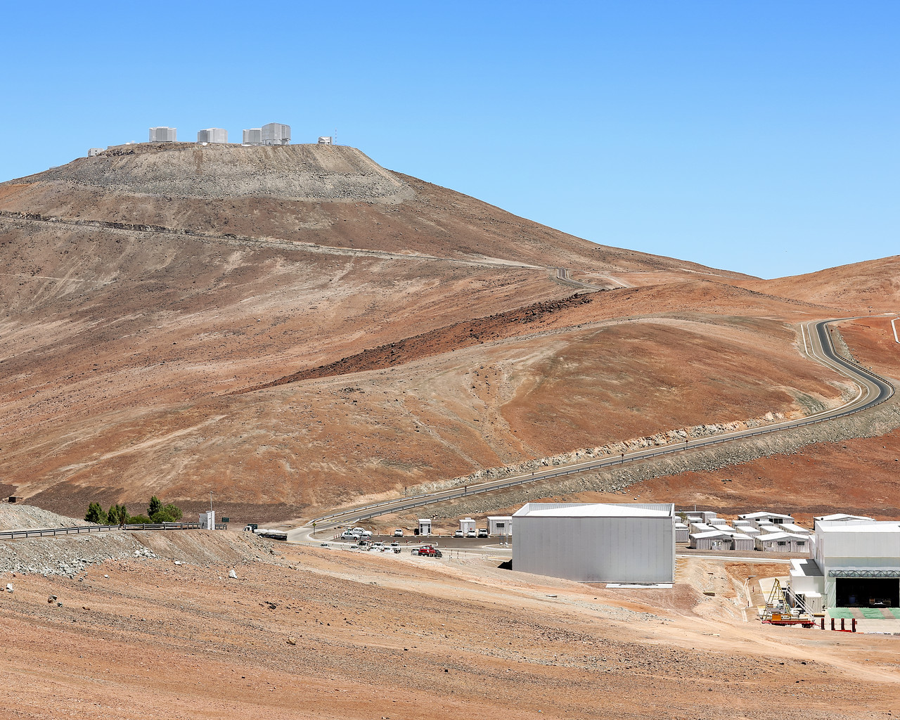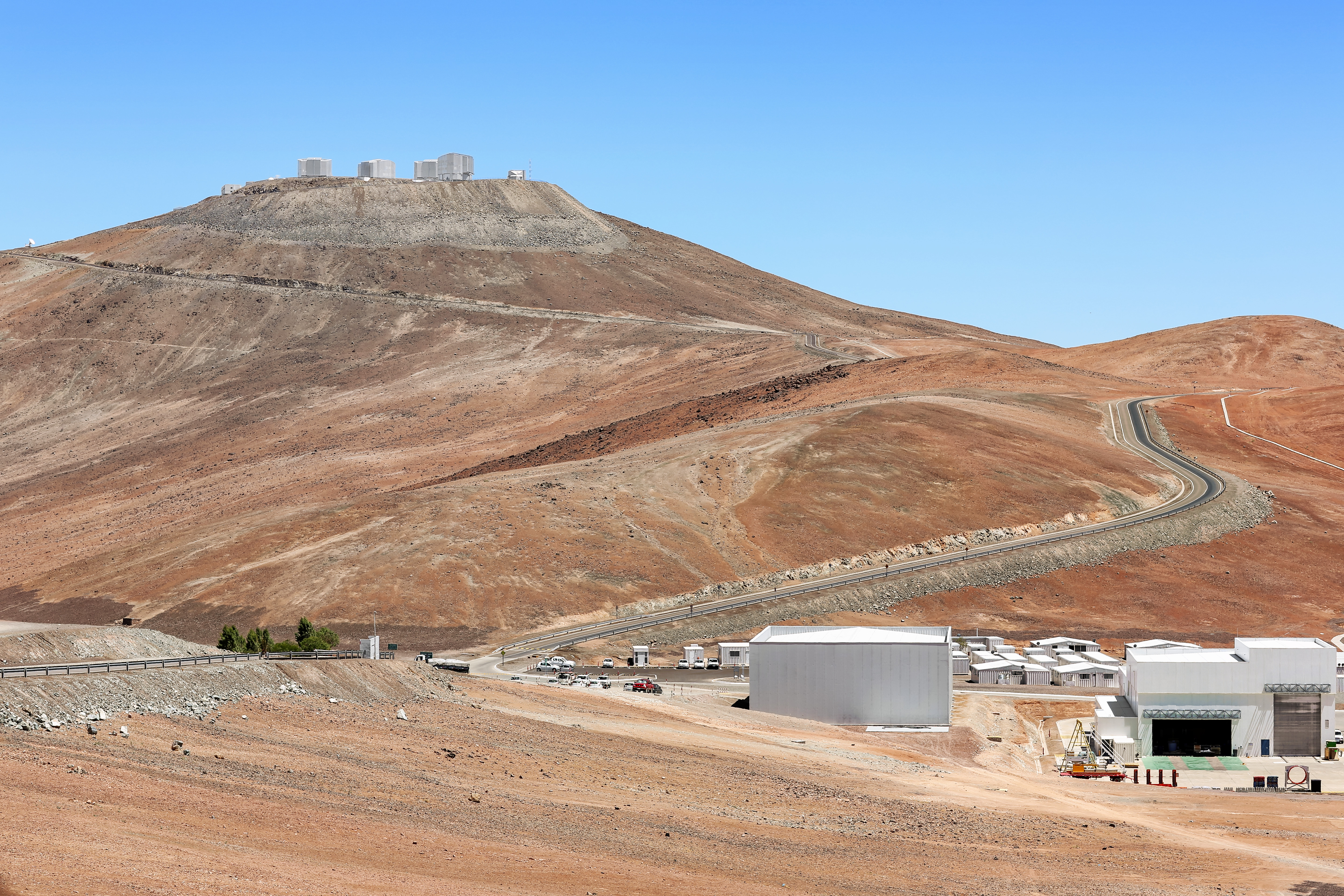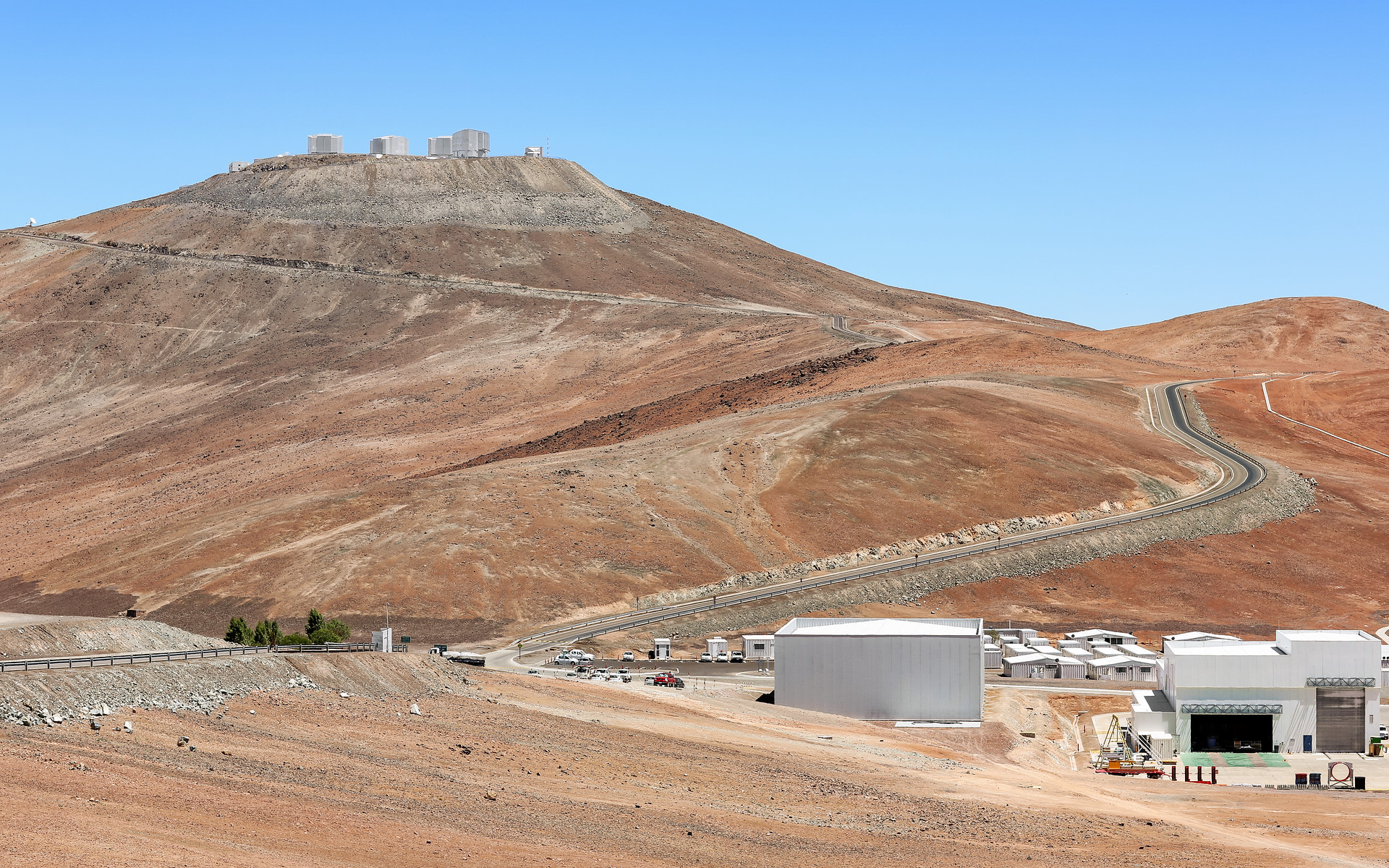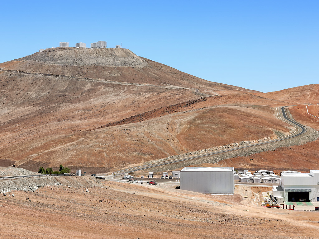 A view of Cerro Paranal and the telescopes of the Very Large Telescope (VLT), along with the road and footpath that connect the observatory's main buildings and facilities to the mountaintop telescopes. Cerro Paranal has exceptionally clear and dark skies due to its isolation in the Chilean Atacama Desert. It is home to ESO's flagship VLT, as well as other telescopes, including survey telescopes VST and VISTA, and planet-hunters NGTS and SPECULOOS.