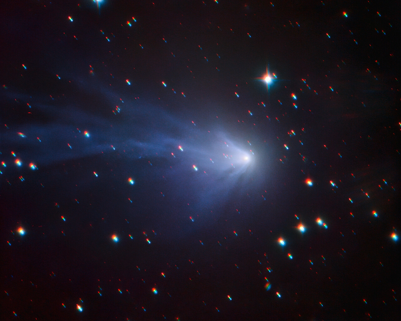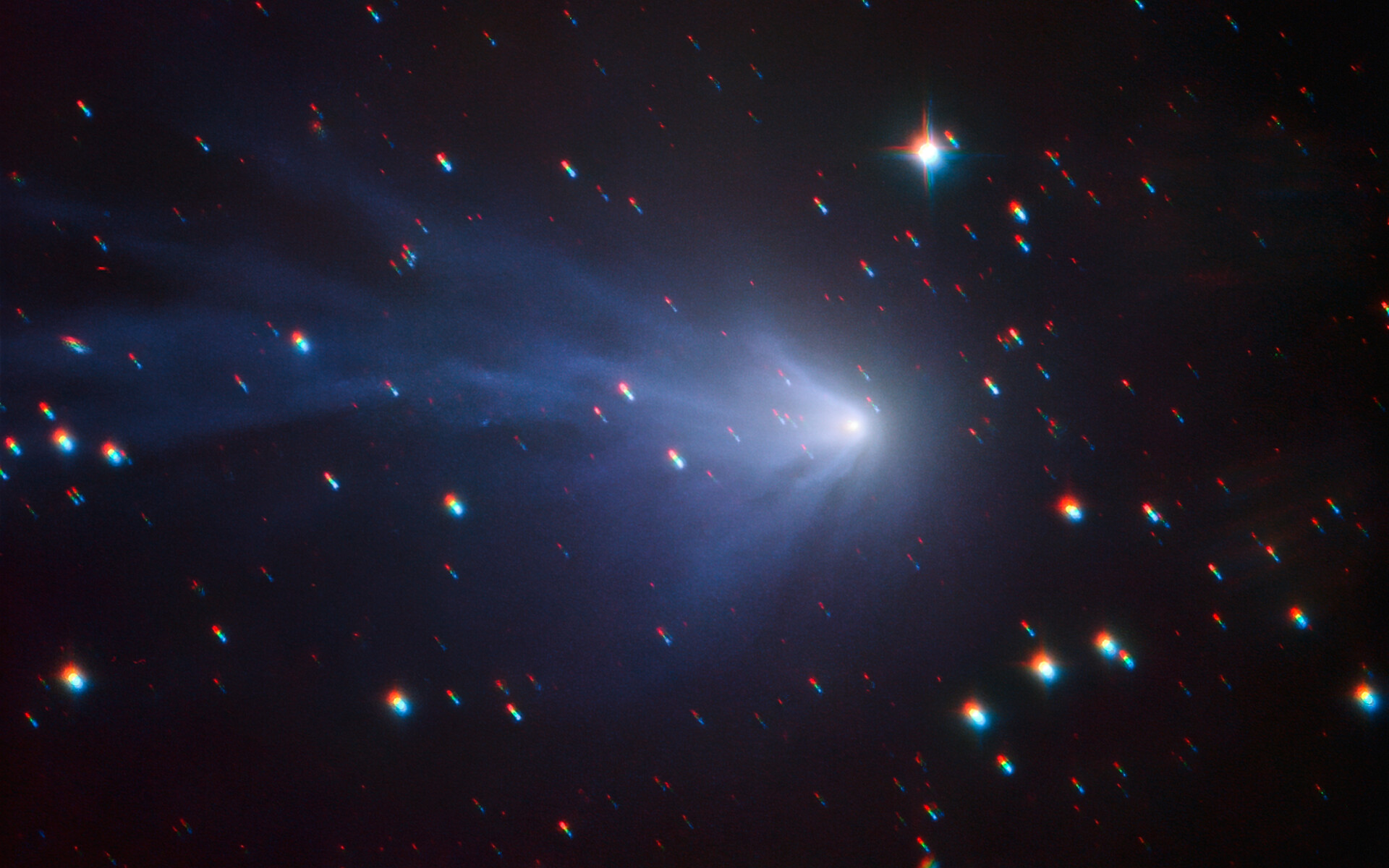 Der Komet ist deshalb besonders interessant, da seltene Verbindungen und Moleküle in seiner Koma gefunden wurden: Kohlenmonoxid und ionisierter Stickstoff. Diese verleihen dem Kometen ausgeprägte Emissionslinien, weshalb er auch den Spitznamen „der blaue Komet“ erhielt. Dieser scheue Komet umkreist die Sonne nur einmal in 20.000 Jahren. Sein letzter Vorbeiflug an der Sonne war im Mai 2018. Das Bild wurde mit einer langen Belichtungszeit aufgenommen, während der das Teleskop der Bewegung des Kometen folgte: Die hellen Lichtstreifen im Hintergrund sind weit entfernte Sterne. Doch der Komet und seine gasförmige Koma sind scharf abgebildet, ein Zeichen für die hervorragende Nachführleistung von SPECULOOS.