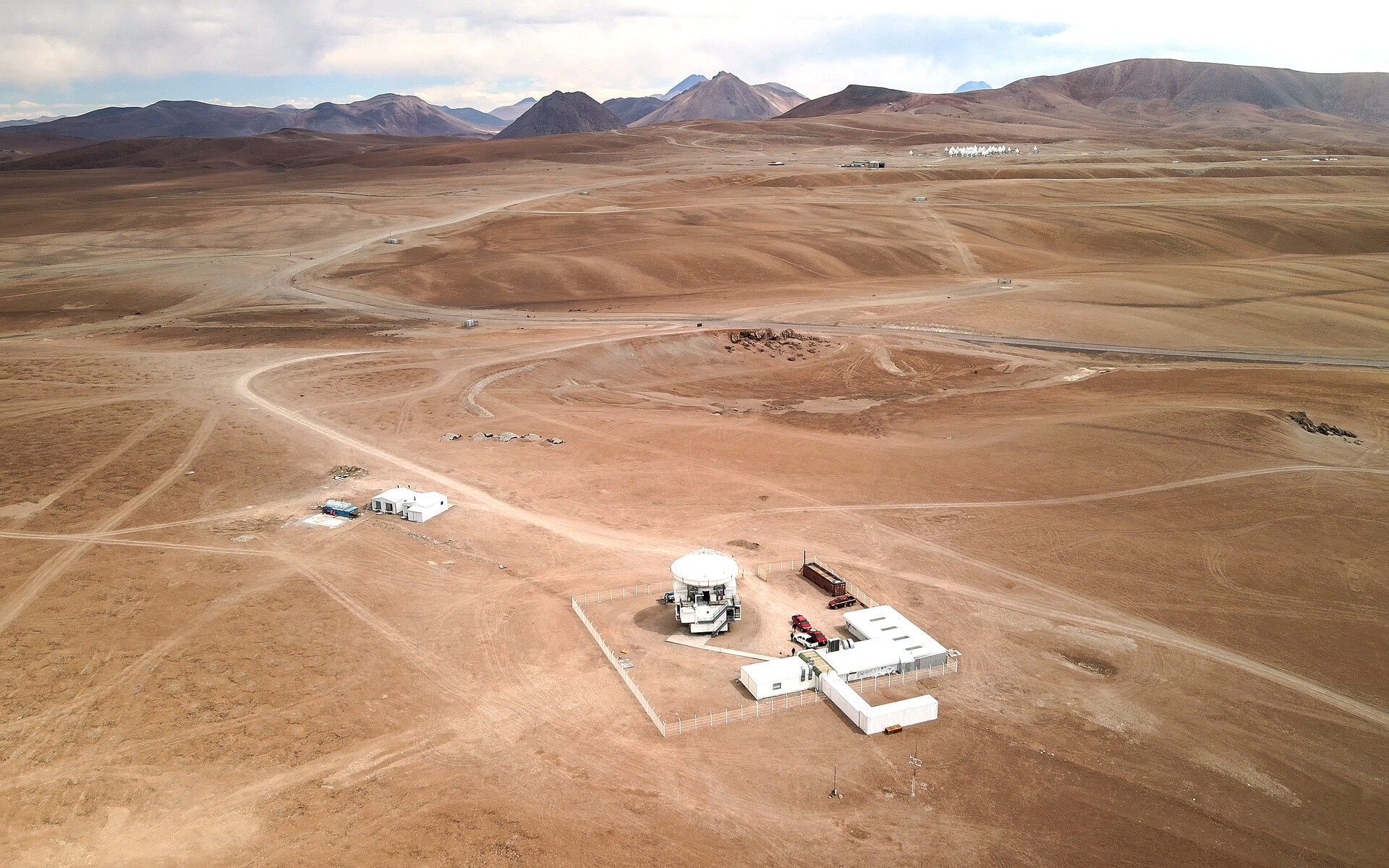 Wenn Sie Ihren Blick weiter in die Ferne schweifen lassen, in Richtung der entfernten braunen Berge, können Sie vielleicht ein paar weiße Punkte erkennen. Dabei handelt es sich um die 66 hochpräzisen Antennenschüsseln von ALMA, dem Atacama Large Millimeter/submillimeter Array, das von der ESO zusammen mit ihren internationalen Partnern betrieben wird. Wie APEX beobachten auch die Antennenschüsseln von ALMA die kältesten Objekte im Universum, etwa riesige Gas- und Staubwolken, die nur wenige Dutzend Grad über dem absoluten Nullpunkt liegen. Doch diese Antennen arbeiten zusammen wie eine einzige, riesige „virtuelle“ Antenne, die in der Lage ist, kleinste Details zu erkennen.