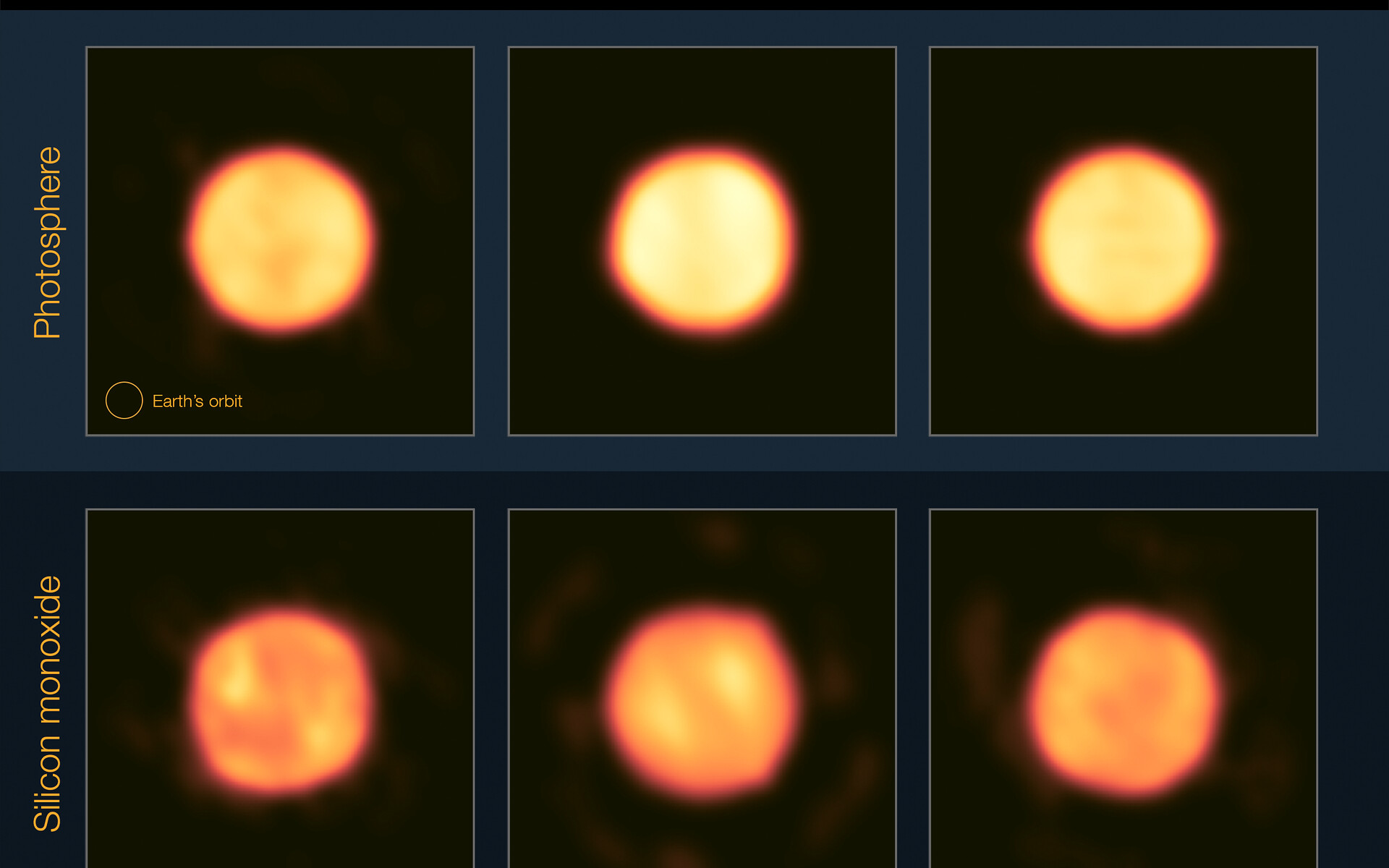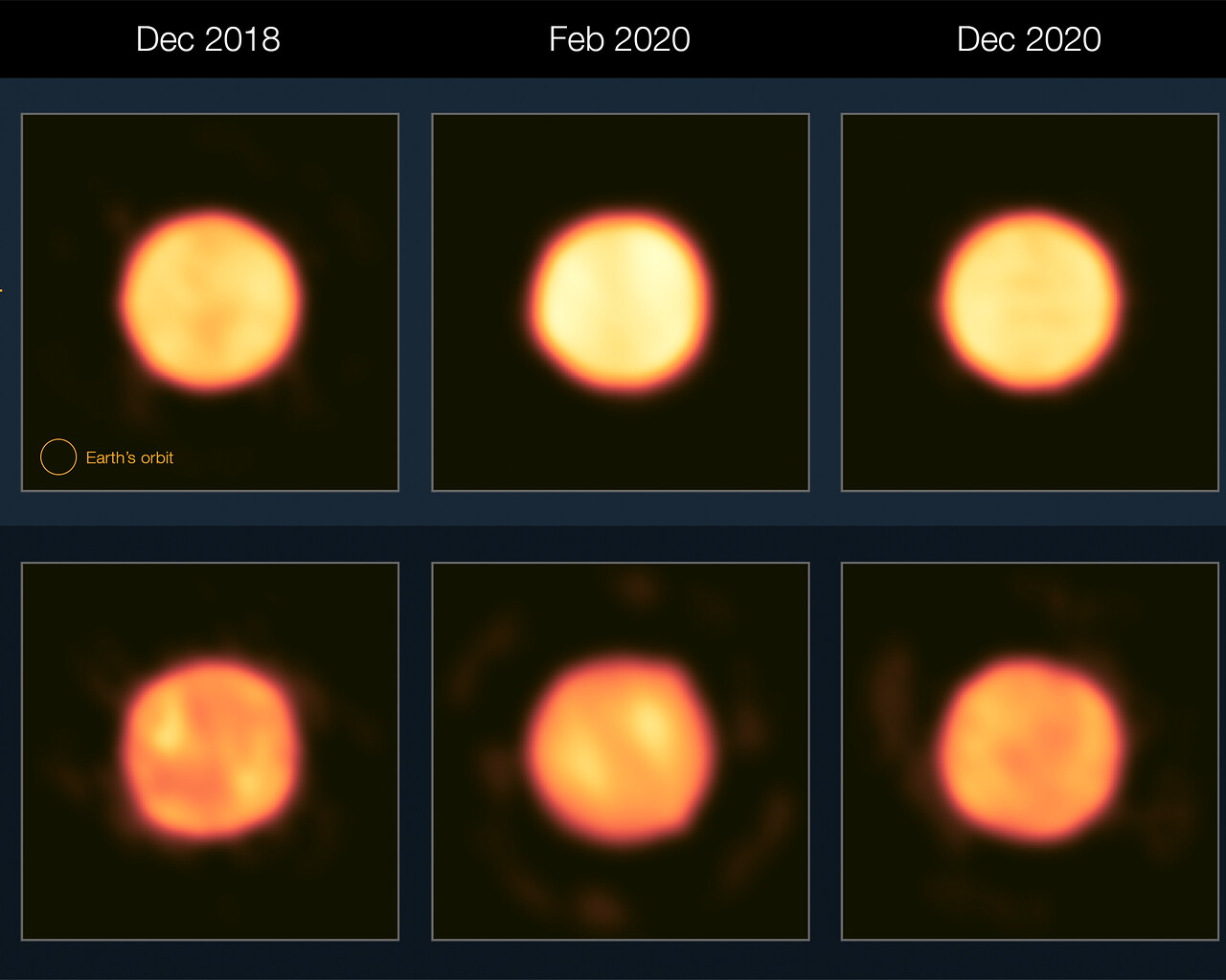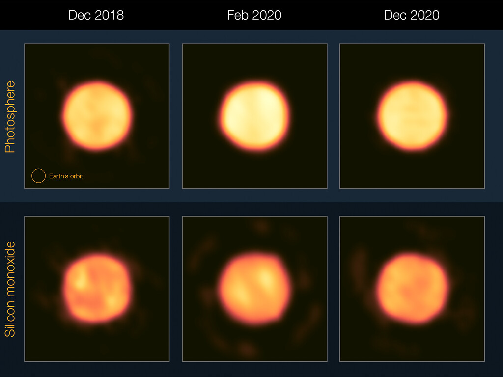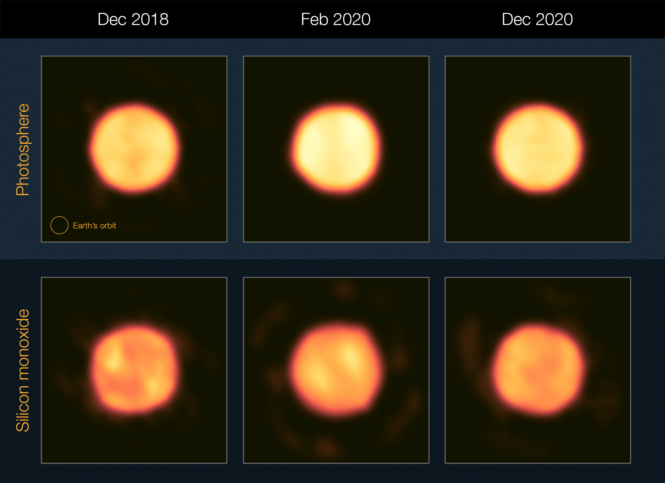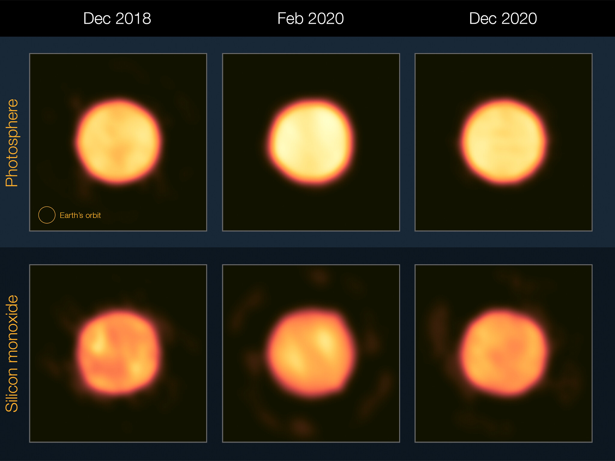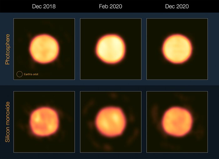 Hier sehen wir Beteigeuze im Dezember 2018, im Februar 2020 und im Dezember 2020, wobei der berühmte Stern vor, während und nach dem GDE aufgenommen wurde. Ein Team unter der Leitung von Julien Drevon, Florentin Millour und Pierre Cruzalèbes von der Université Côte d'Azur in Frankreich hat mit dem MATISSE-Infrarotinstrument am Very Large Telescope Interferometer (VLTI) der ESO hochauflösende Bilder des Sterns aufgenommen. Die oberen Bilder zeigen seine „Oberfläche“ oder Photosphäre, während in den unteren Bilder eine Spektrallinien von Siliziummonoxid herausgefiltert wurde, ein Molekül, das als Keim für die Bildung von Staubkörnern dienen kann.