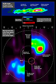 Basierend auf Beobachtungen mit dem Atacama Large Millimeter/submillimeter Array (ALMA) im Norden Chiles haben Astronomen heute die Entdeckung eines unerwarteten Klumpens aus Kohlenstoffmonoxid-Gas in der Staubscheibe des Sterns Beta Pictoris bekanntgegeben. Das ist überraschend, denn man würde davon ausgehen, dass dieses Gas in kurzer Zeit von der Strahlung des Sterns zerstört werden sollte. Irgendetwas – wahrscheinlich häufige Zusammenstöße zwischen kleinen eishaltigen Objekten wie Kometen – muss für die kontinuierliche Wiederauffüllung des Gases verantwortlich sein. Die neuen Ergebnisse werden heute in der Fachzeitschrift Science veröffentlicht.