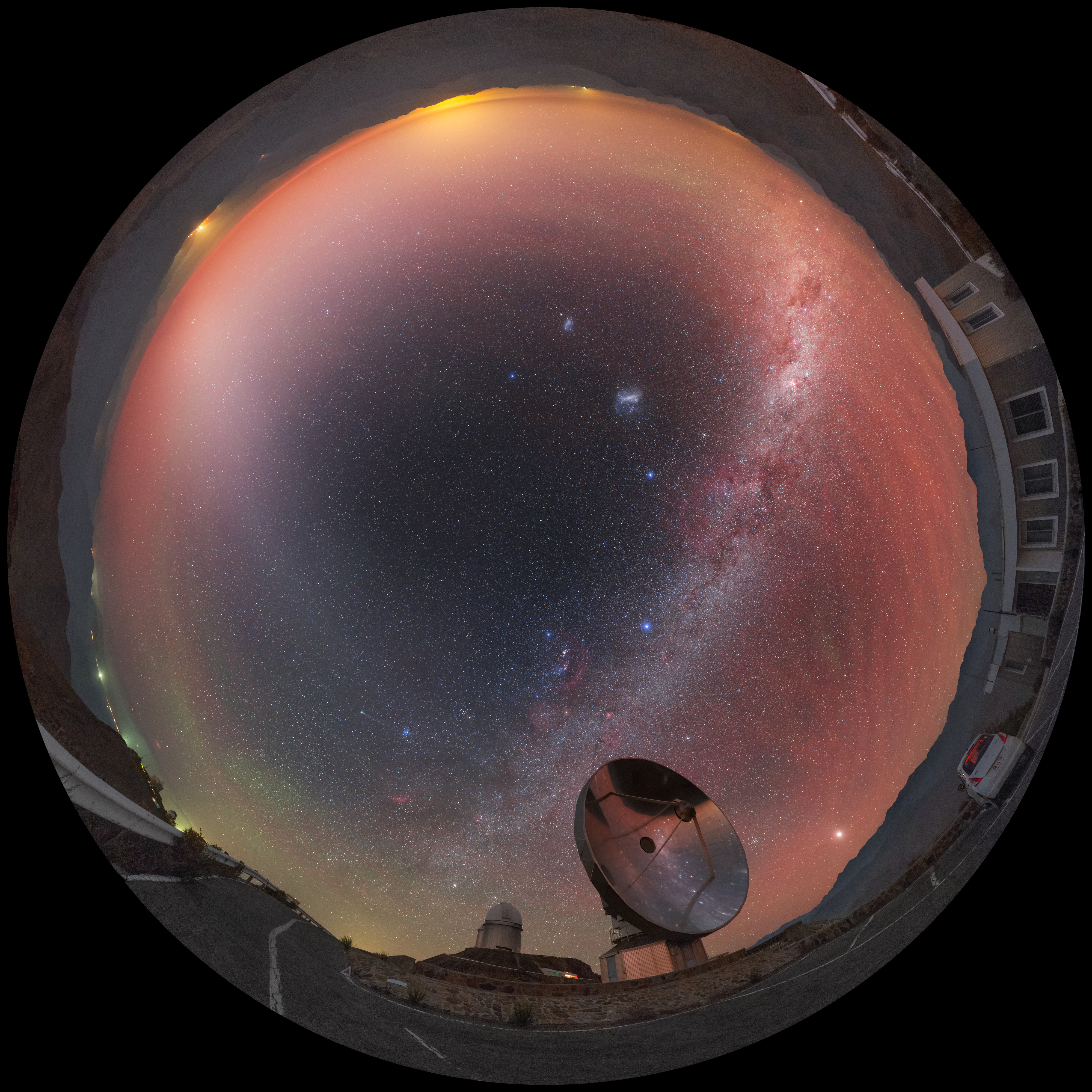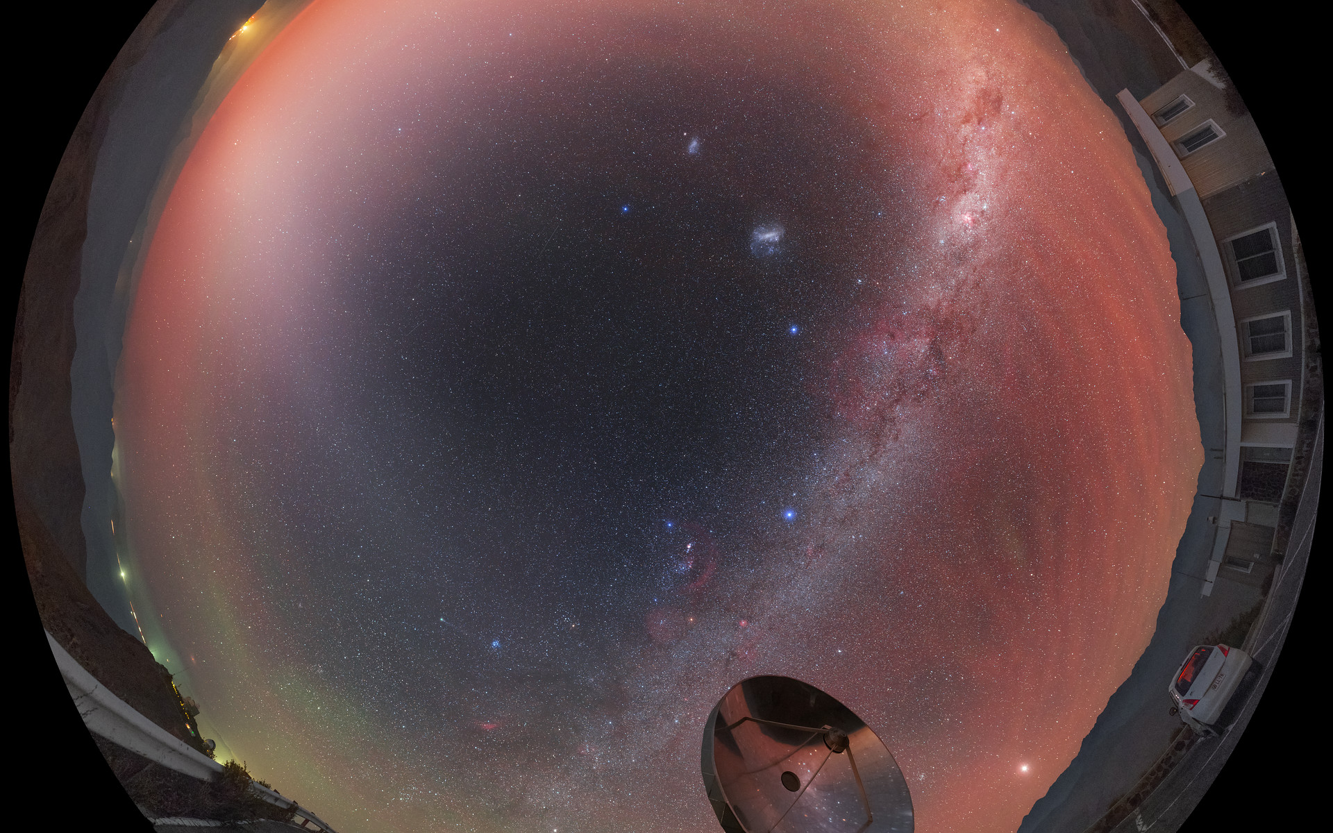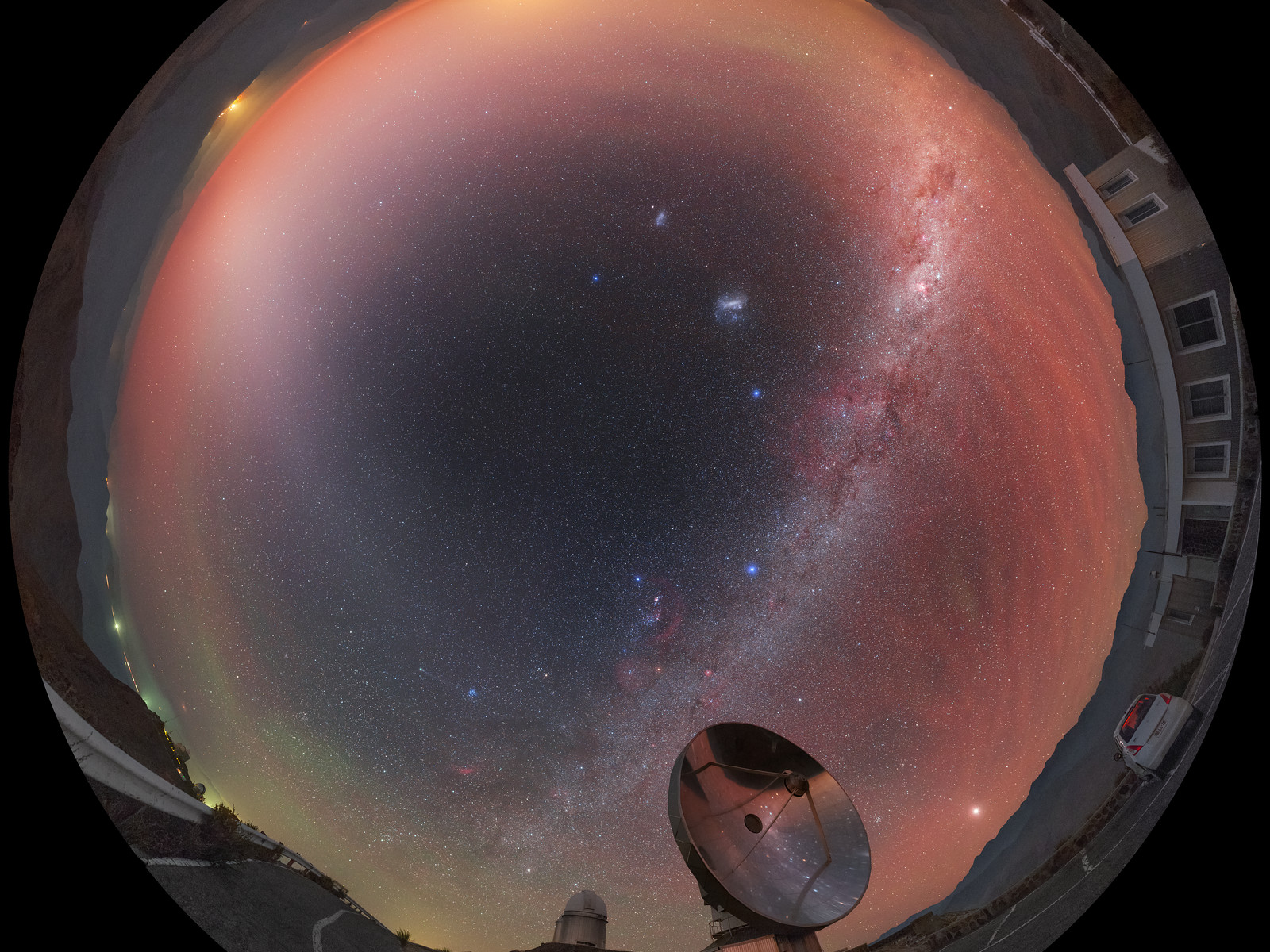 A reddish hue — called airglow — fills the sky above the decommissioned Swedish/ESO Submillimetre Telescope (SEST), located at ESO's La Silla Observatory in northern Chile. The unmistakable green glow of a distant comet, the majestic Milky Way and the Magellanic Clouds adorn the night sky in this fisheye fulldome image.