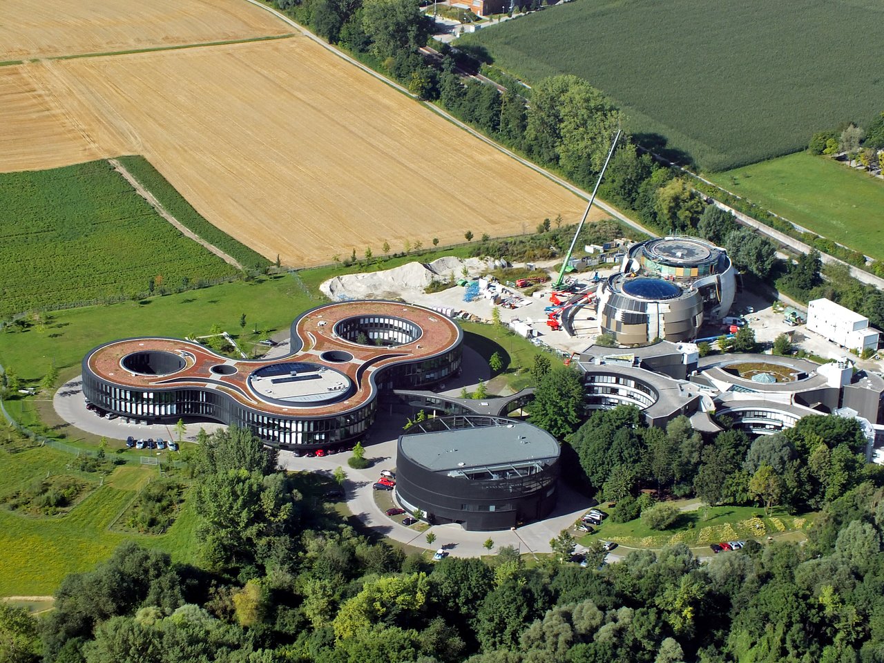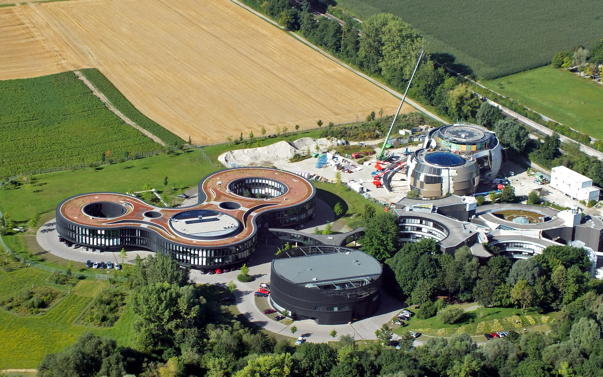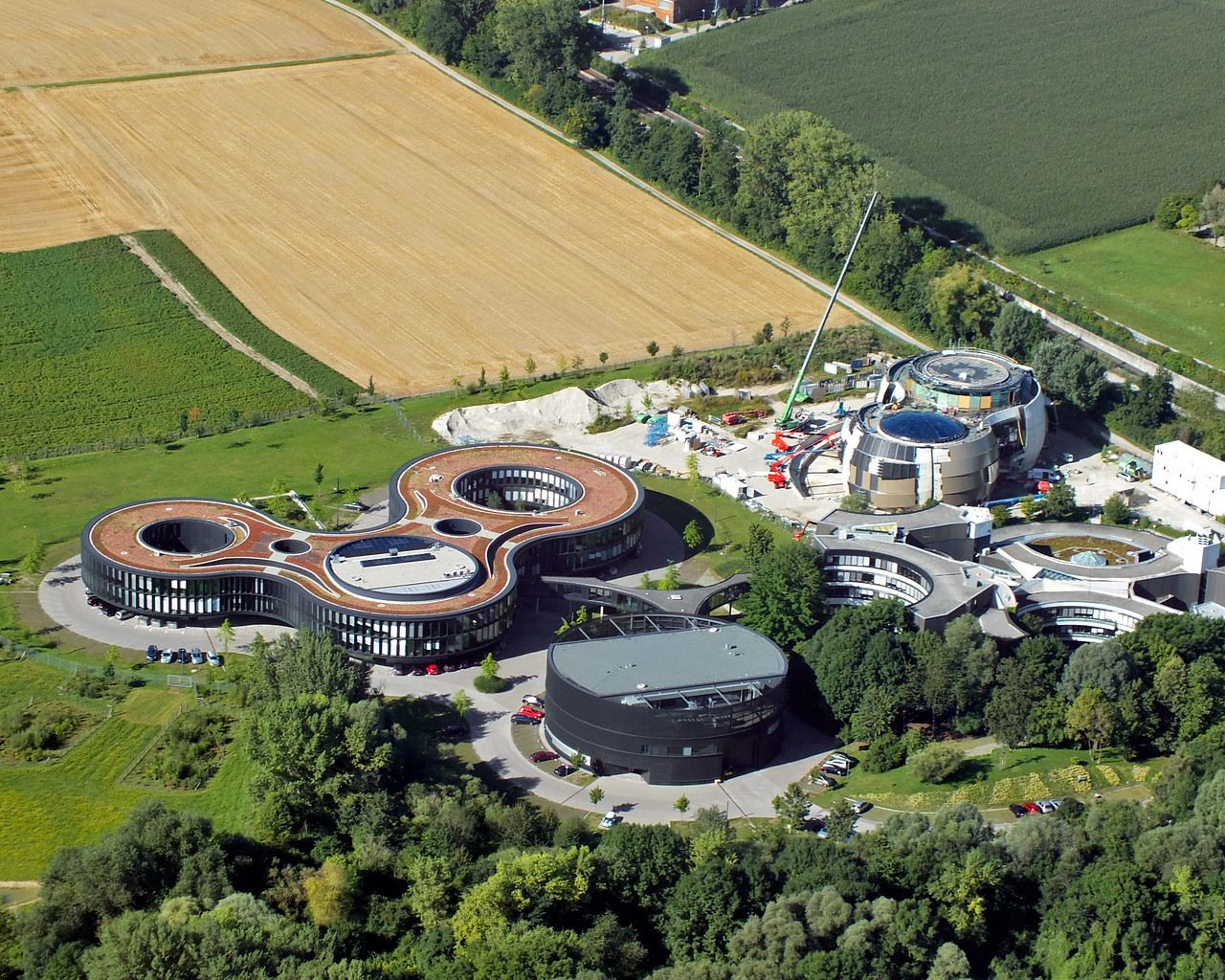 This image shows an aerial view of the ESO buildings in Garching, revealing their striking architecture. The dominant design of each building is based on circles, whether they be open arcs — such as the original headquarters, the overlapping circles of the headquarters extension, or the cylinder of the new technical building. Currently under construction is the ESO Supernova Planetarium & Visitor Centre, its cutting-edge architecture designed to represent the transfer of mass between binary stars — a process often preceding spectacular supernova explosions.