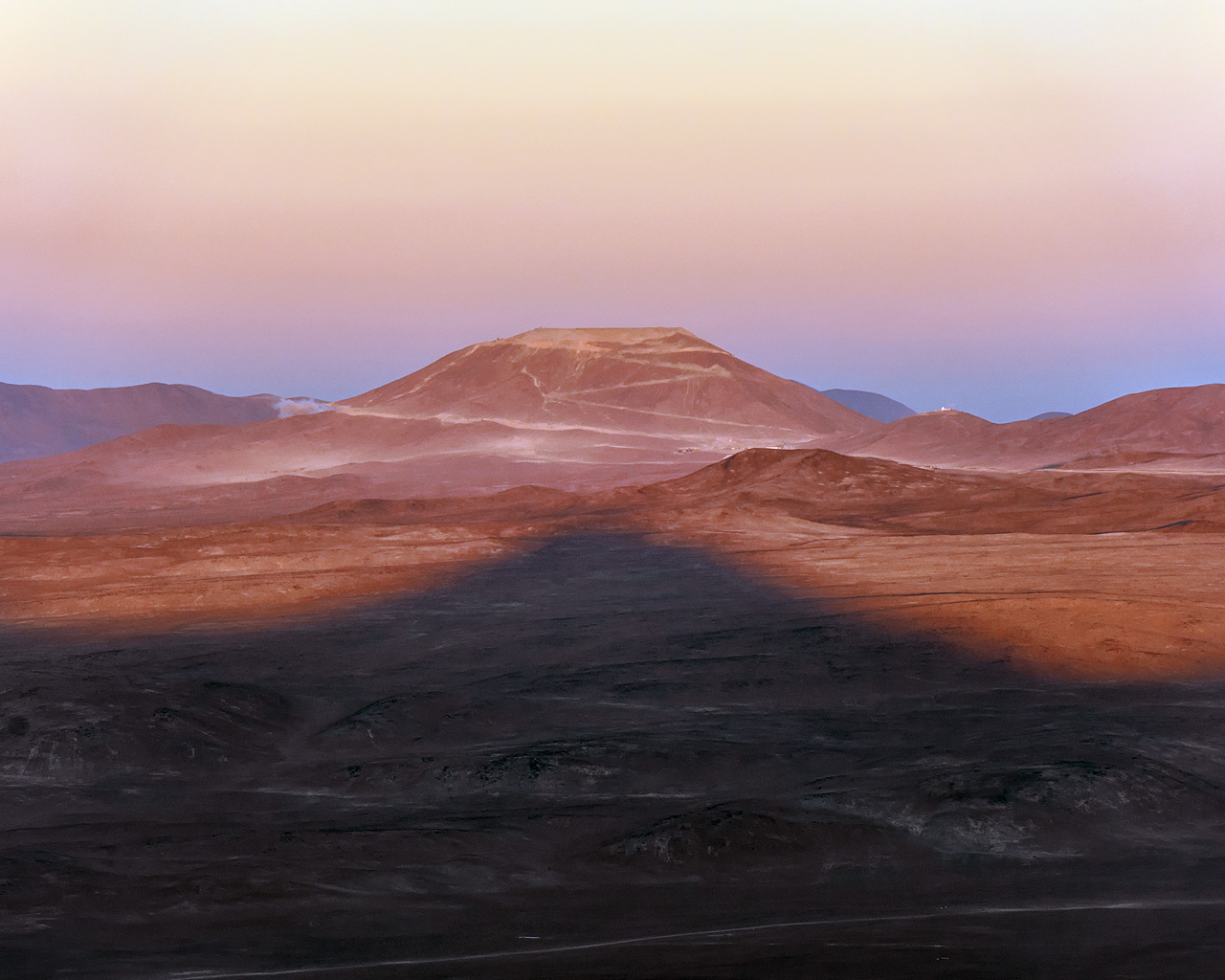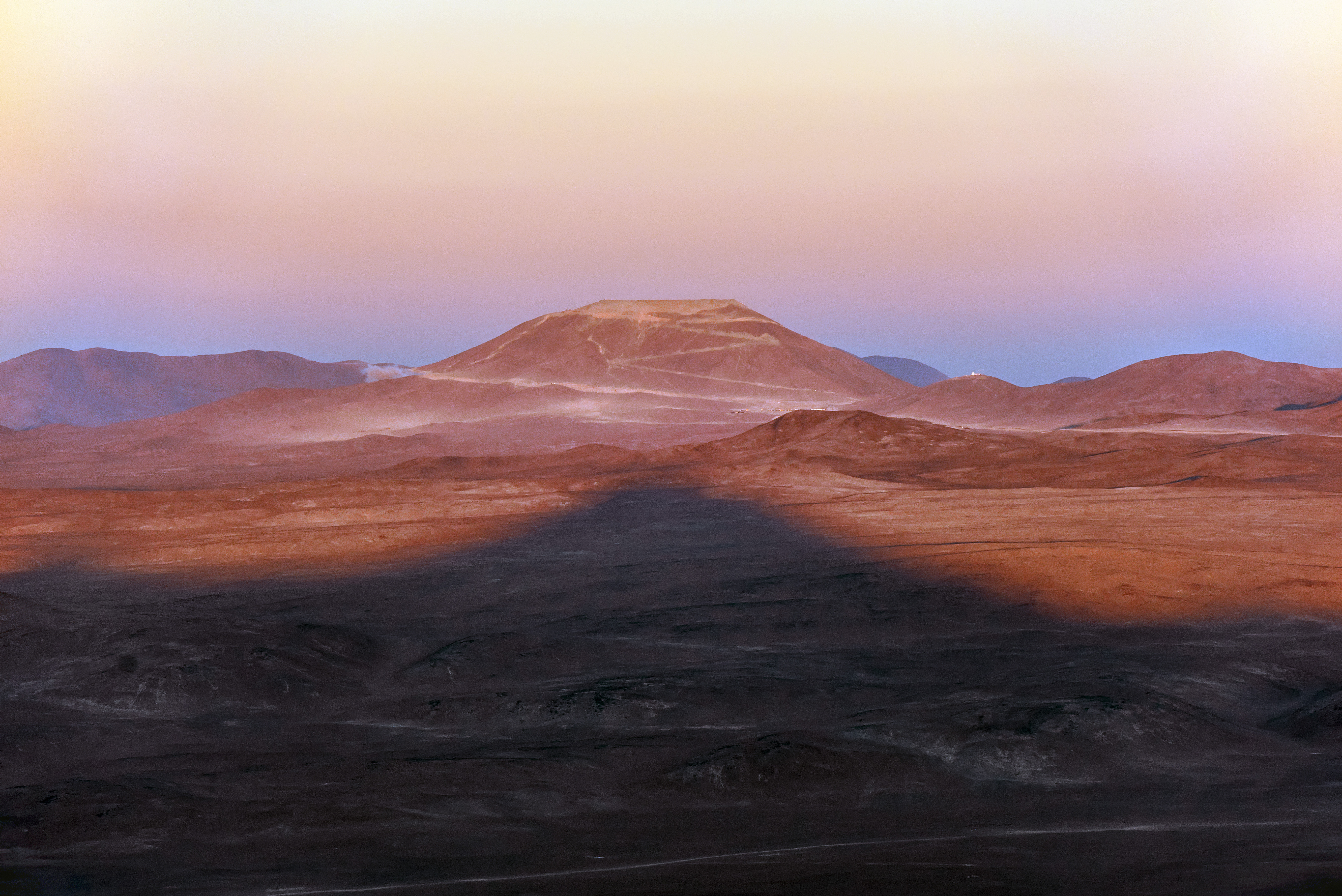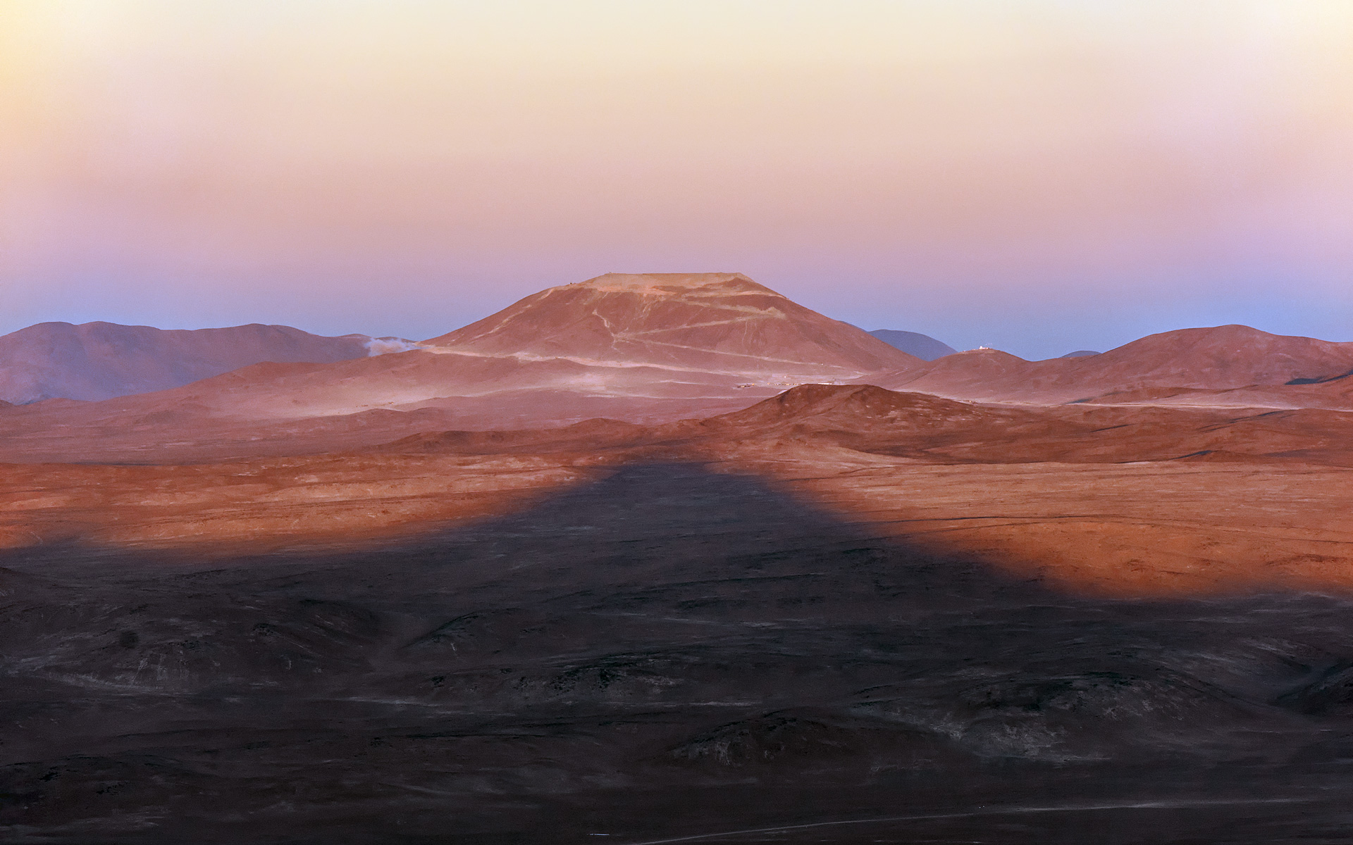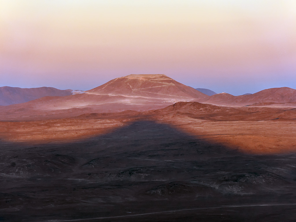 The shadow of Cerro Paranal reaches out across the desert towards Cerro Armazones. It is the physical mirroring the figurative, as Paranal prepares to welcome its telescopic brethren on Armazones in the form of the ELT.