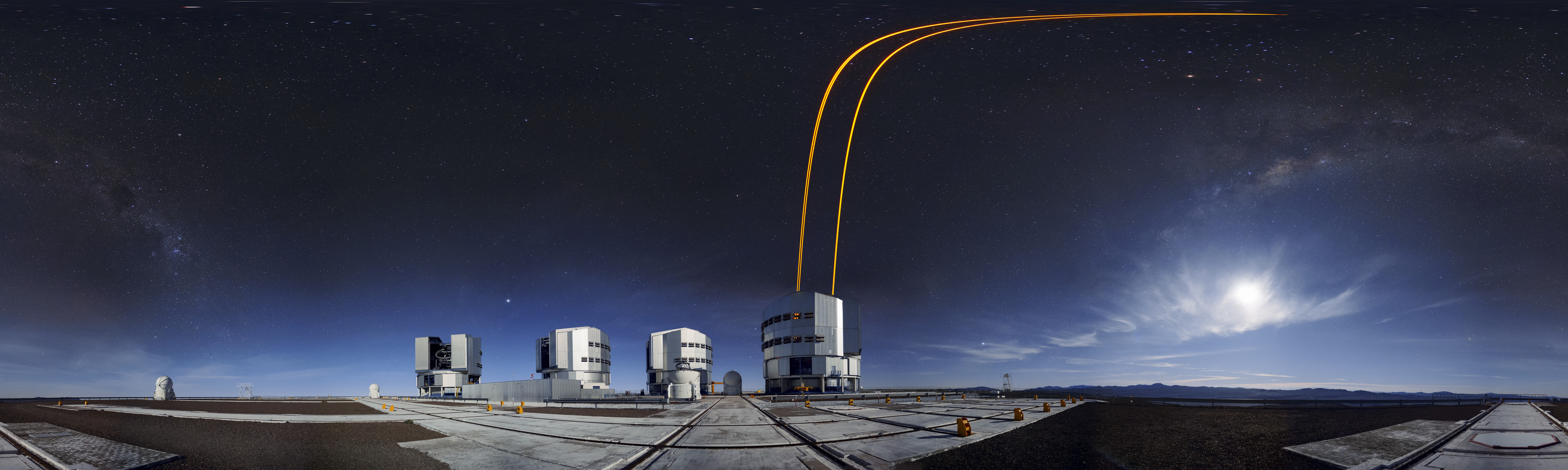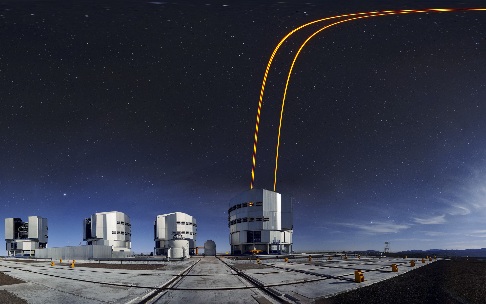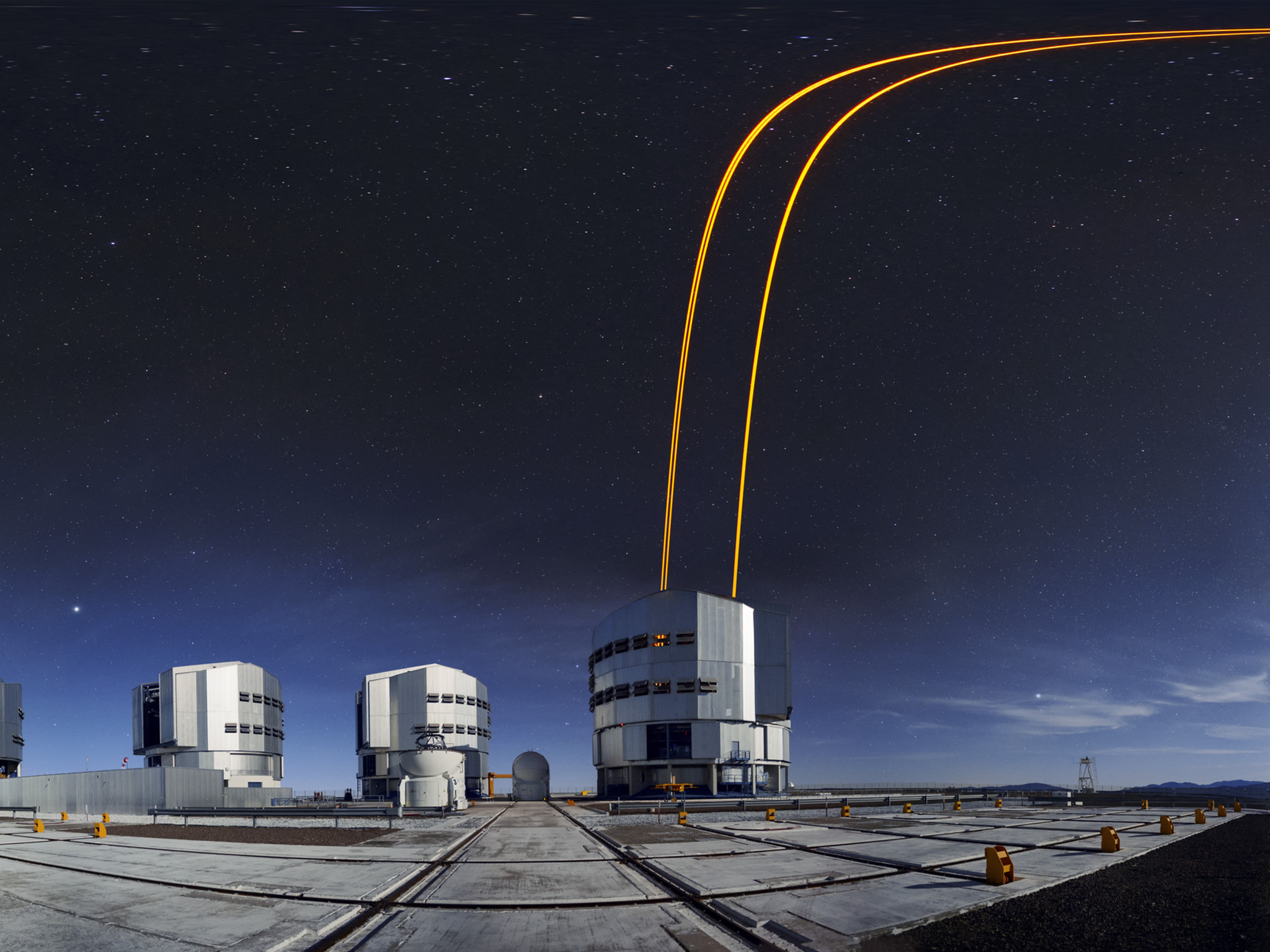 The four Unit Telescopes (UTs) at the Very Large Telescope (VLT) on ESO's Paranal Observatory in Chile have a very special inbuilt technology known as Adaptive Optics (AO). Distortion in observed images that are caused by the disruption of the atmosphere can be corrected using AO. The tech involves firing strong laser beams into the upper atmosphere, which cause it to glow and create fake "stars". By adjusting for how these fakes should look, the mirrors on the UTs can be altered slightly to compensate, producing much clearer astronomical images.