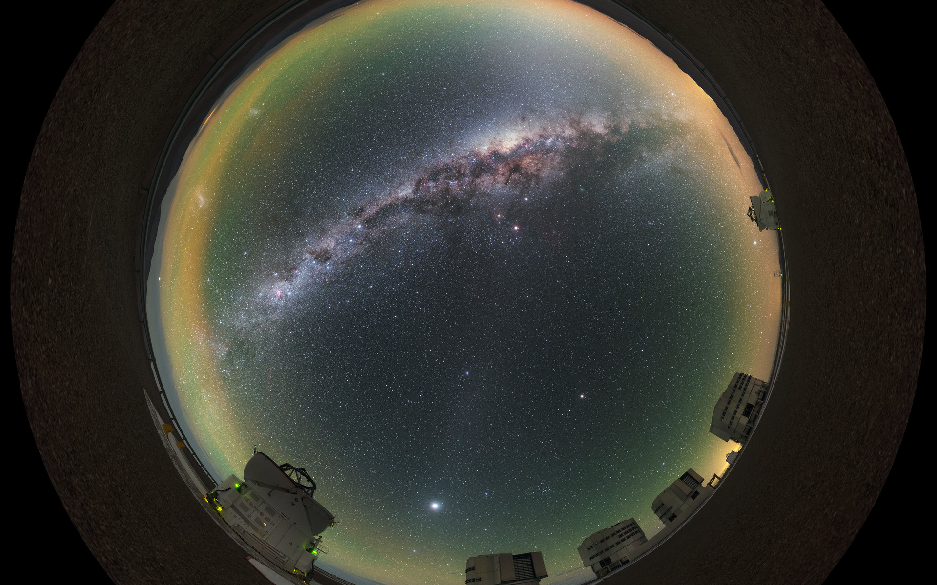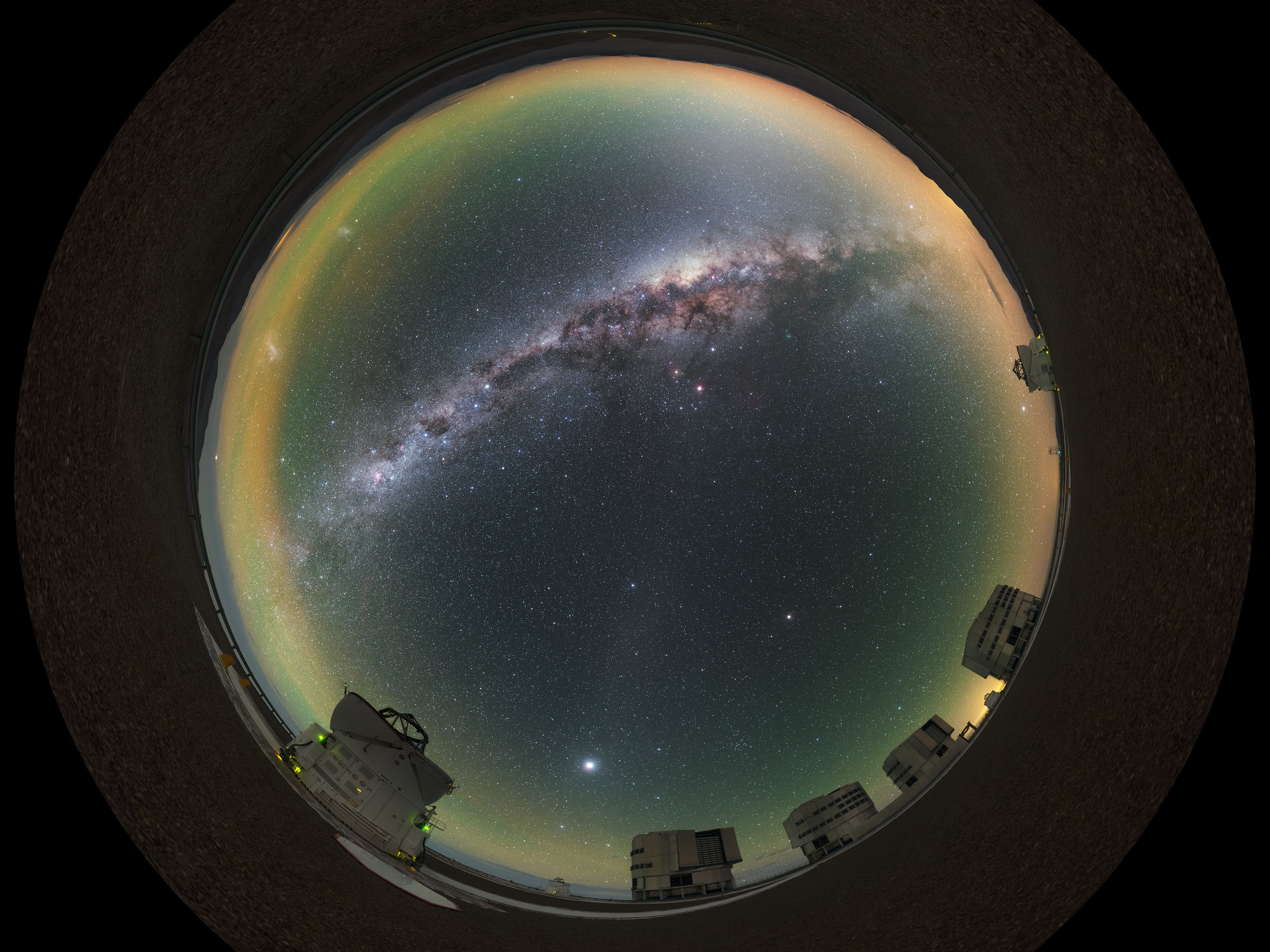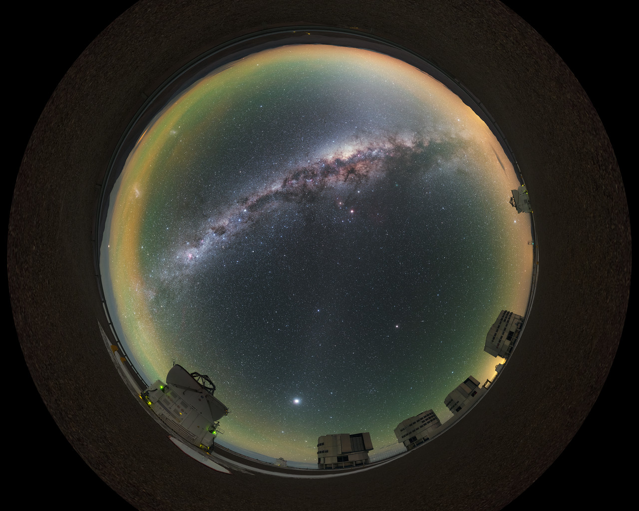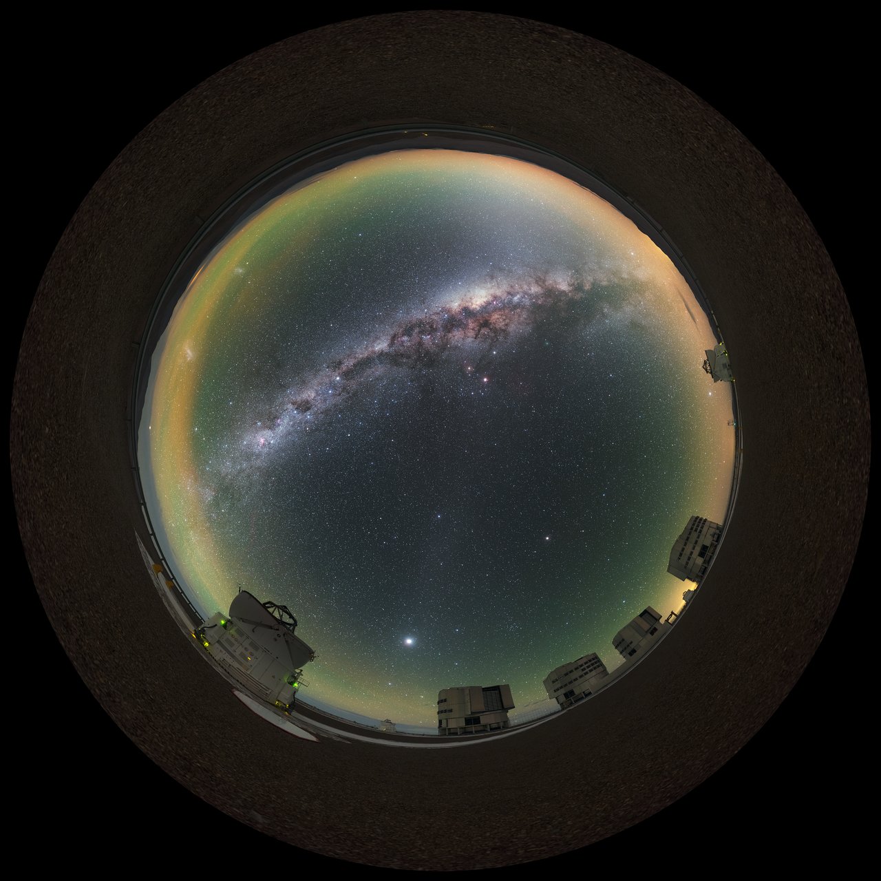 A stunning panorama, extended to 360 x 180 degrees (with black), of all four of the Very Large Telescope (VLT) Unit Telescopes (UTs) at ESO's Paranal Observatory in Chile, as well as a couple of the smaller Auxiliary Telescopes (ATs), all framed by the arcing Milky Way. The observatory's high altitude and remoteness allow for the spectacularly clear skies seen above the facility.
