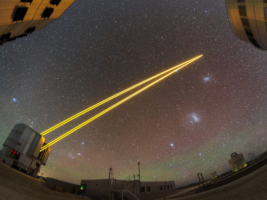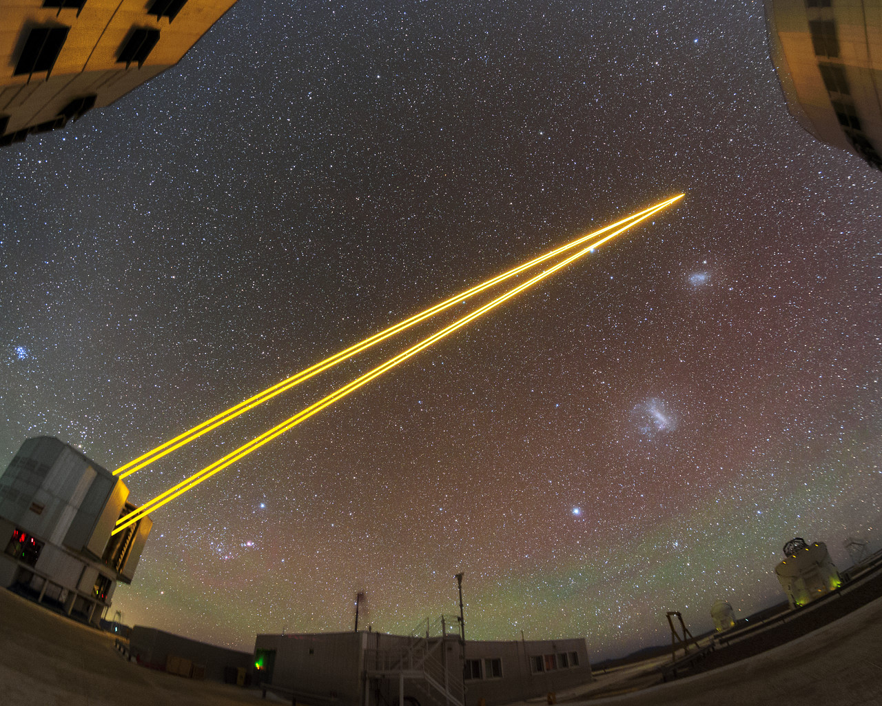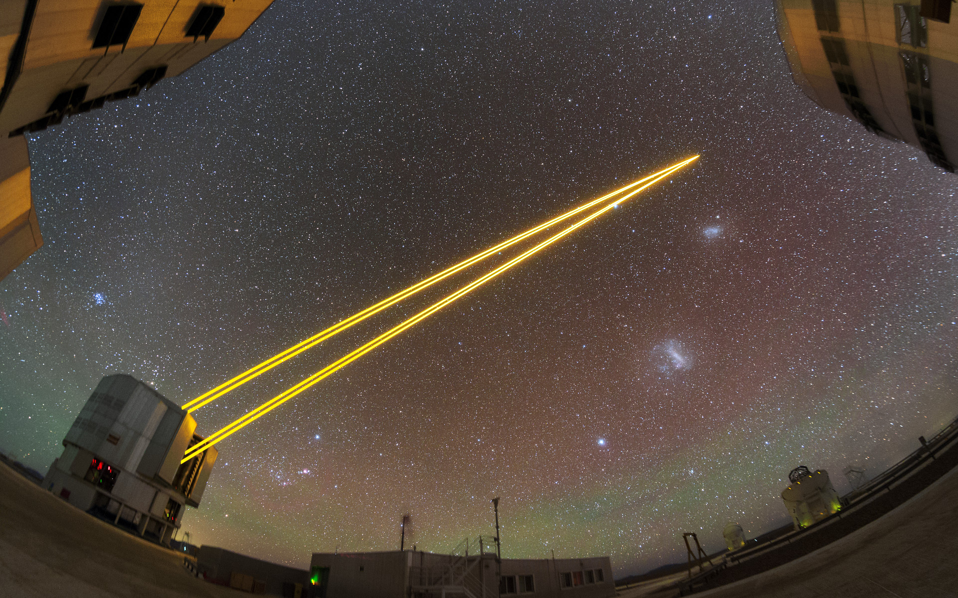 This image shows three of the four Unit Telescopes that together make up ESO's Very Large Telescope. One of the Unit Telescope is seen here shooting laser guide stars up into the sky to produce four artificial stars. These artificial stars allow astronomers to constantly measure the turbulence in the atmosphere, and adjust the mirrors inside the telescope to counteract this turbulence. This technique is called adaptive optics.