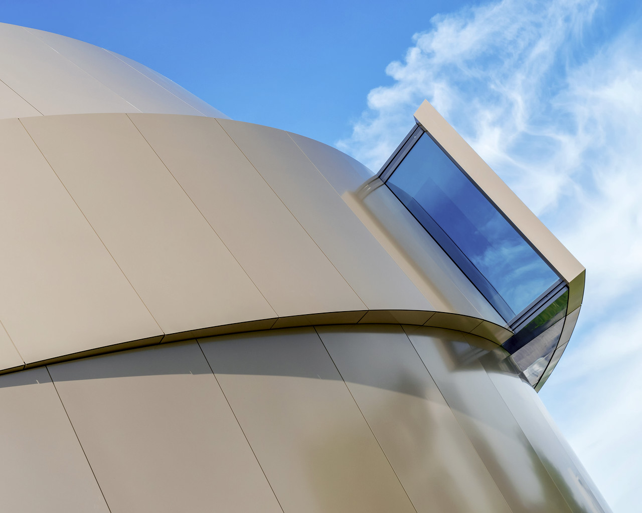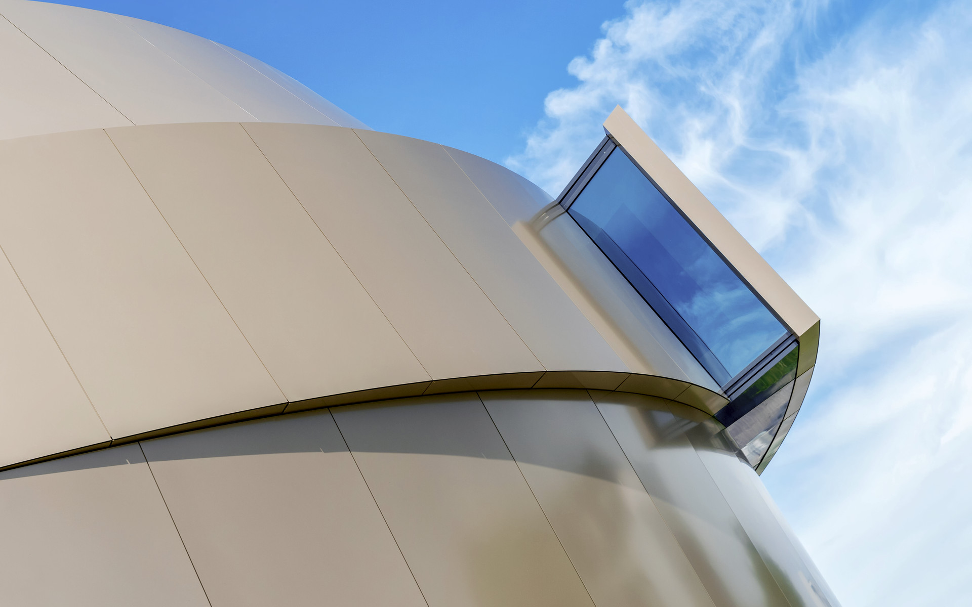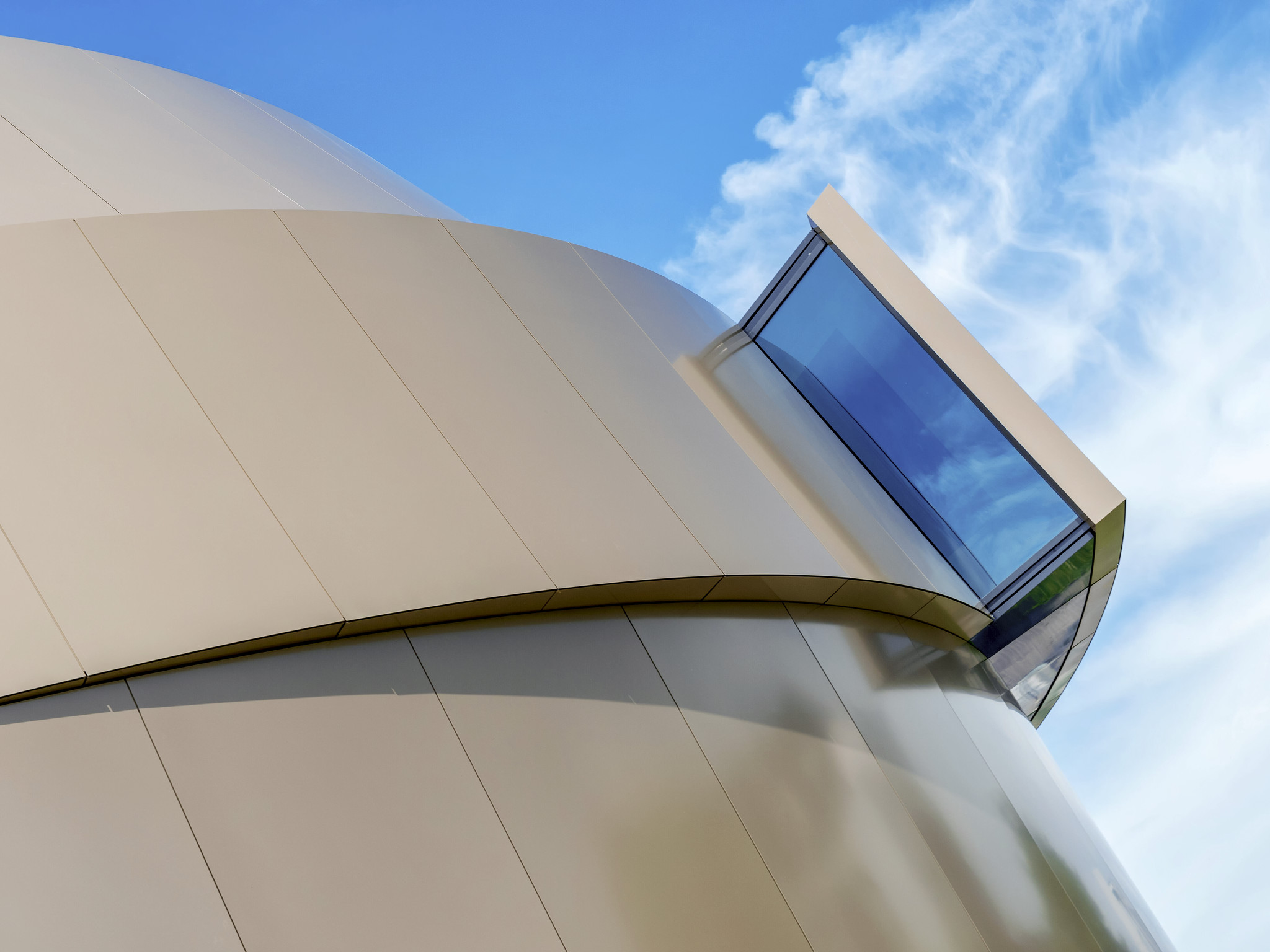 A skylight window on the side of the ESO Supernova Planetarium & Visitor Centre, the new astronomy education centre at ESO's Garching, Germany headquarters. Inside visitors can visit exhibits and watch planetarium shows to learn about astronomy, from the beginning of the universe to tomorrow's cutting-edge telescopes. The building's dynamic, curving shape is inspired by a close binary star system approaching one of the universe's brightest events: a supernova.