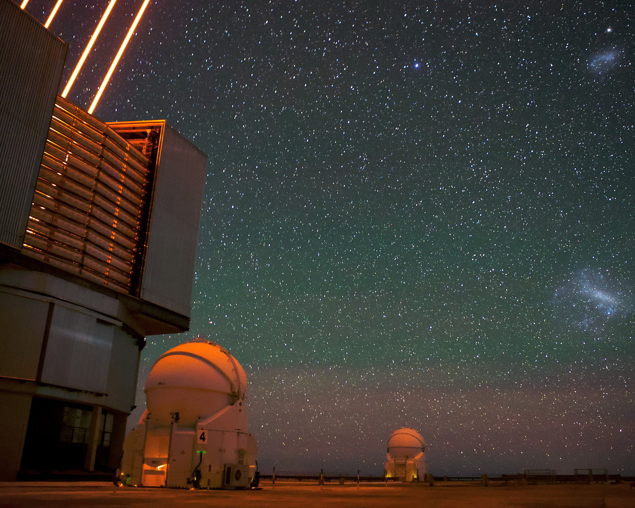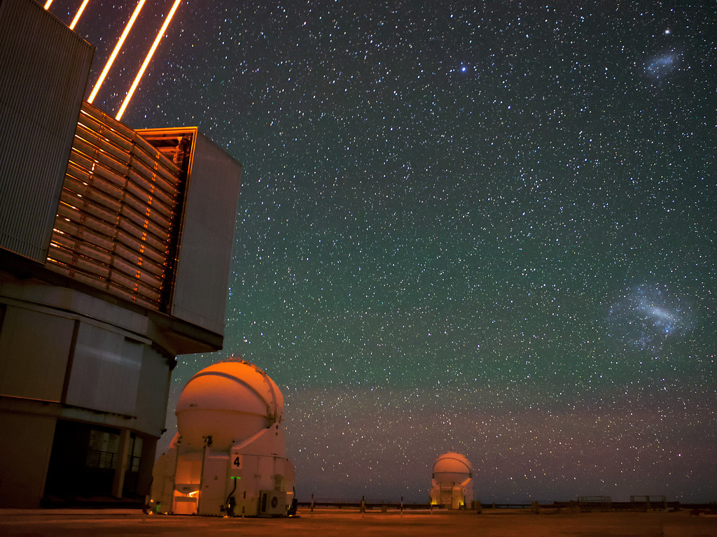 The Very Large Telescope (VLT)'s lasers in operation at Paranal Observatory. Two of the VLT's Auxiliary Telescopes can also be seen in the background as well as a clear view of the Magellanic clouds across the Chilean night sky.