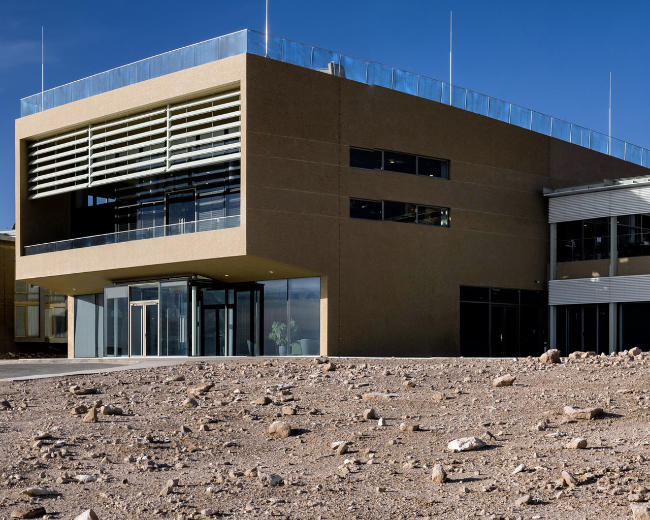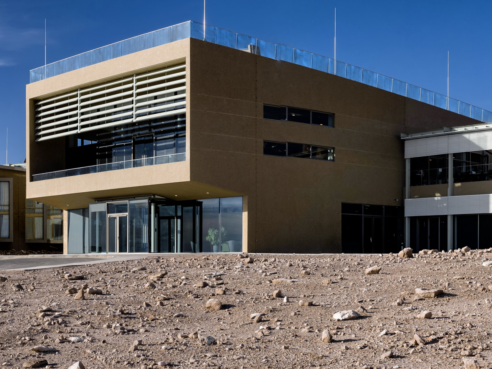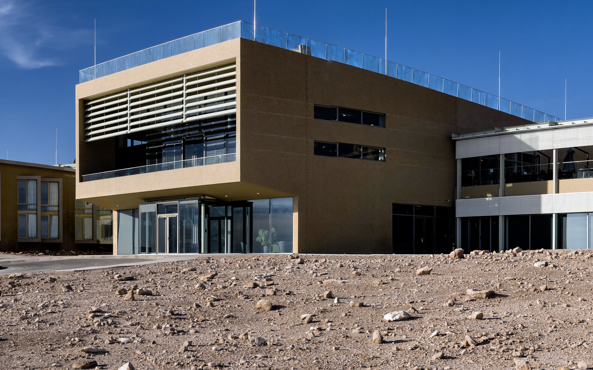 The newly-completed ALMA Residencia stands in the desert, where it will be home to astronomers visiting to study the Universe with ALMA. It is located at an altitude of 3000 metres, still over 2000 metres below ALMA itself, which sits on the breathtaking Chajnantor Plateau. The desert location was kept in mind during the designing of the building, ensuring it would blend in well with the surroundings.