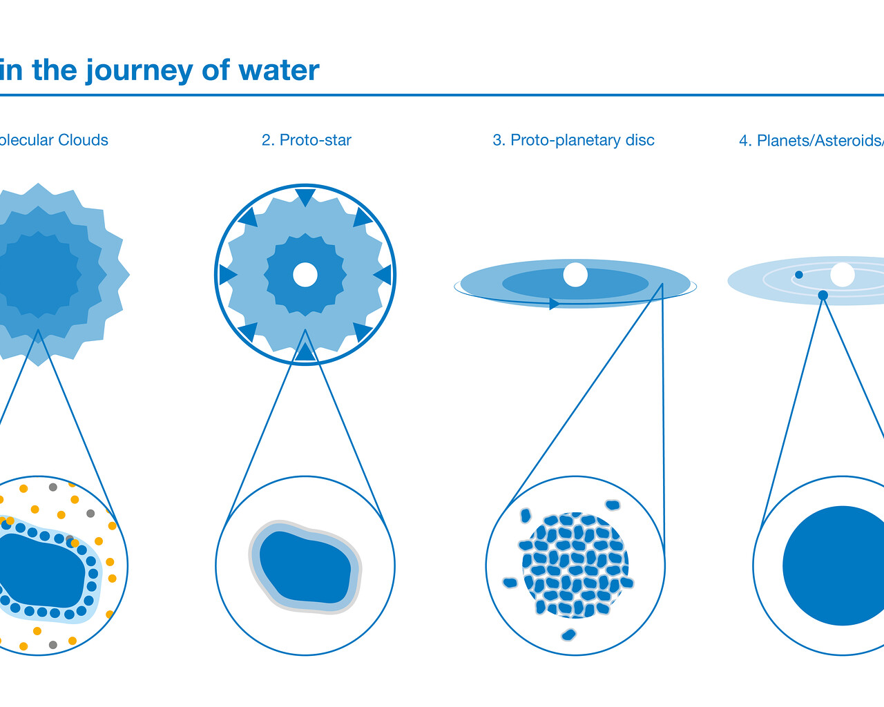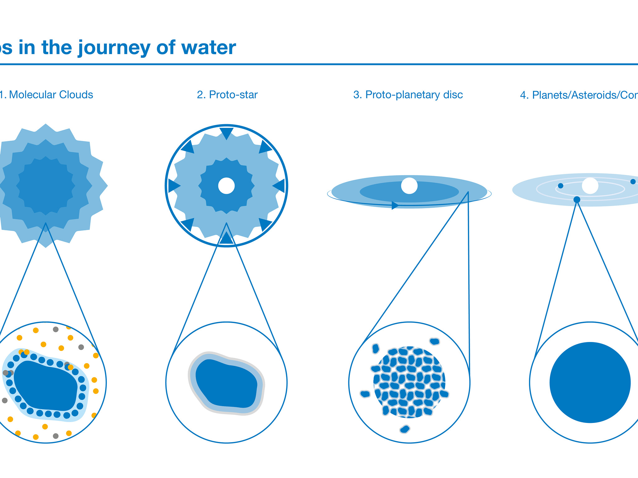 This diagram follows the path of water from clouds where stars are born all the way down to planetary systems. Step 1: water molecules first form in giant clouds of gas and dust. Oxygen atoms, shown here as blue circles, sit on dust grains. When they interact with free-floating hydrogen atoms (yellow) they form water molecules. Some of these hydrogen atoms (gray) are actually a heavier isotope called deuterium. Step 2: as the star-forming cloud collapses, the central region heats up, sublimating some of the water ice into gas, which makes it easier to detect. But the bulk of the water remains frozen on dust grains. Step 3: due to the initial rotation of the cloud, a flat disc forms around the star. Dust grains start to coagulate and form larger solid bodies. Step 4: a planetary system is now formed, containing planets, comets and asteroids orbiting around the central star.