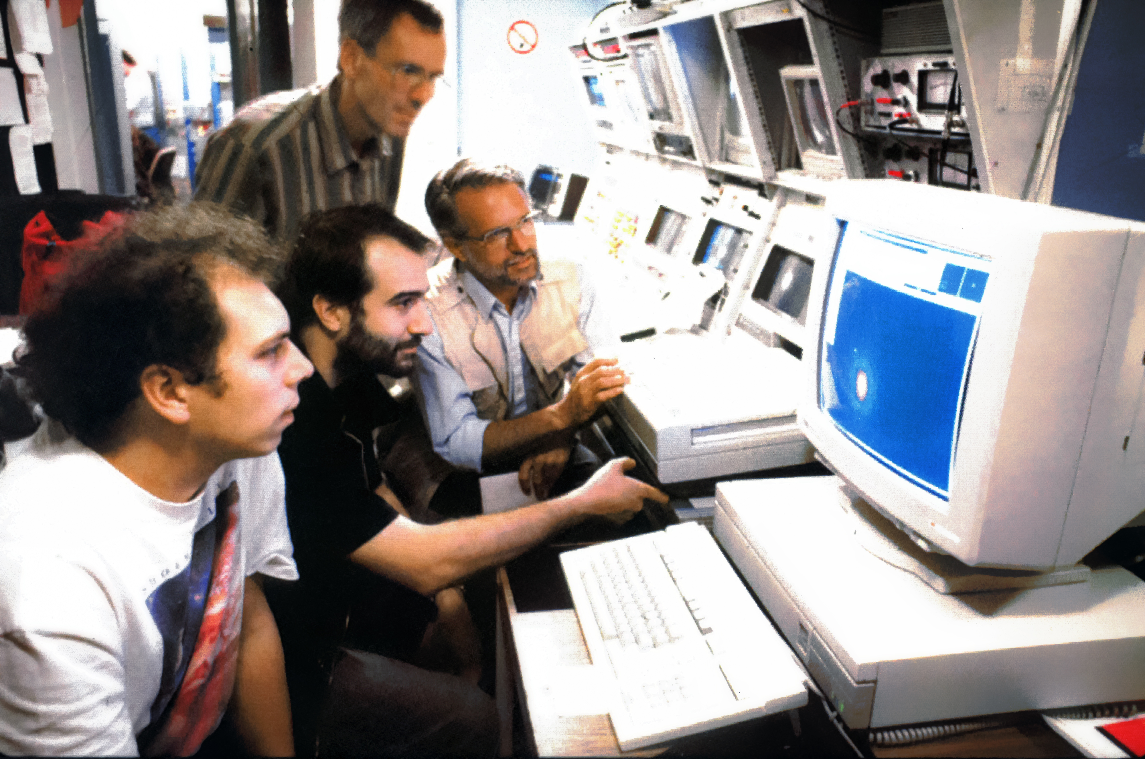 Observations at the ESO 3.6-metre Telescope in 1994: Christophe Dumas, Olivier Hainaut, Rudy Albrecht and Alex Storr are fascinated by the blob on their screen which is Vesta with the adaptive optics system ComeOn+.