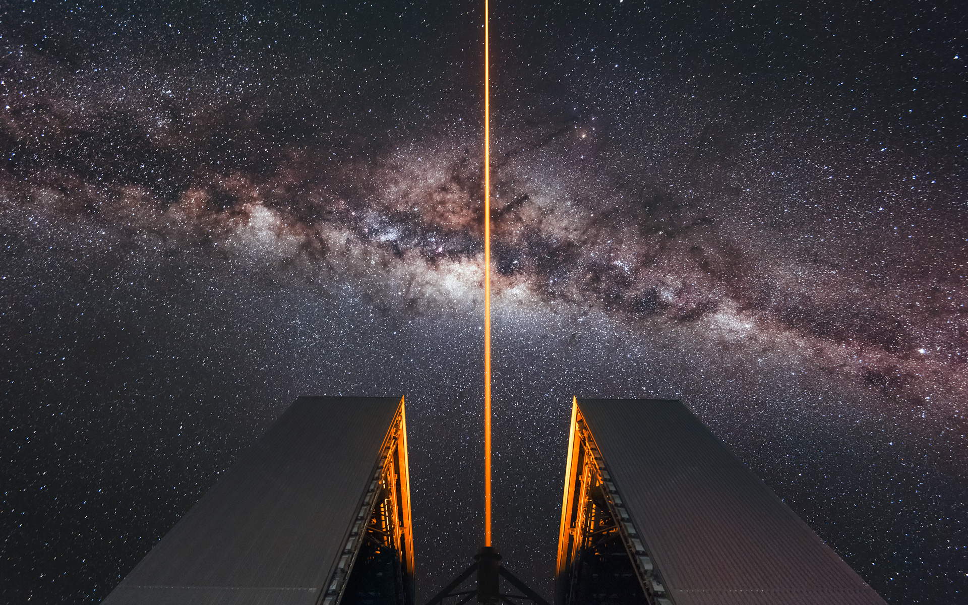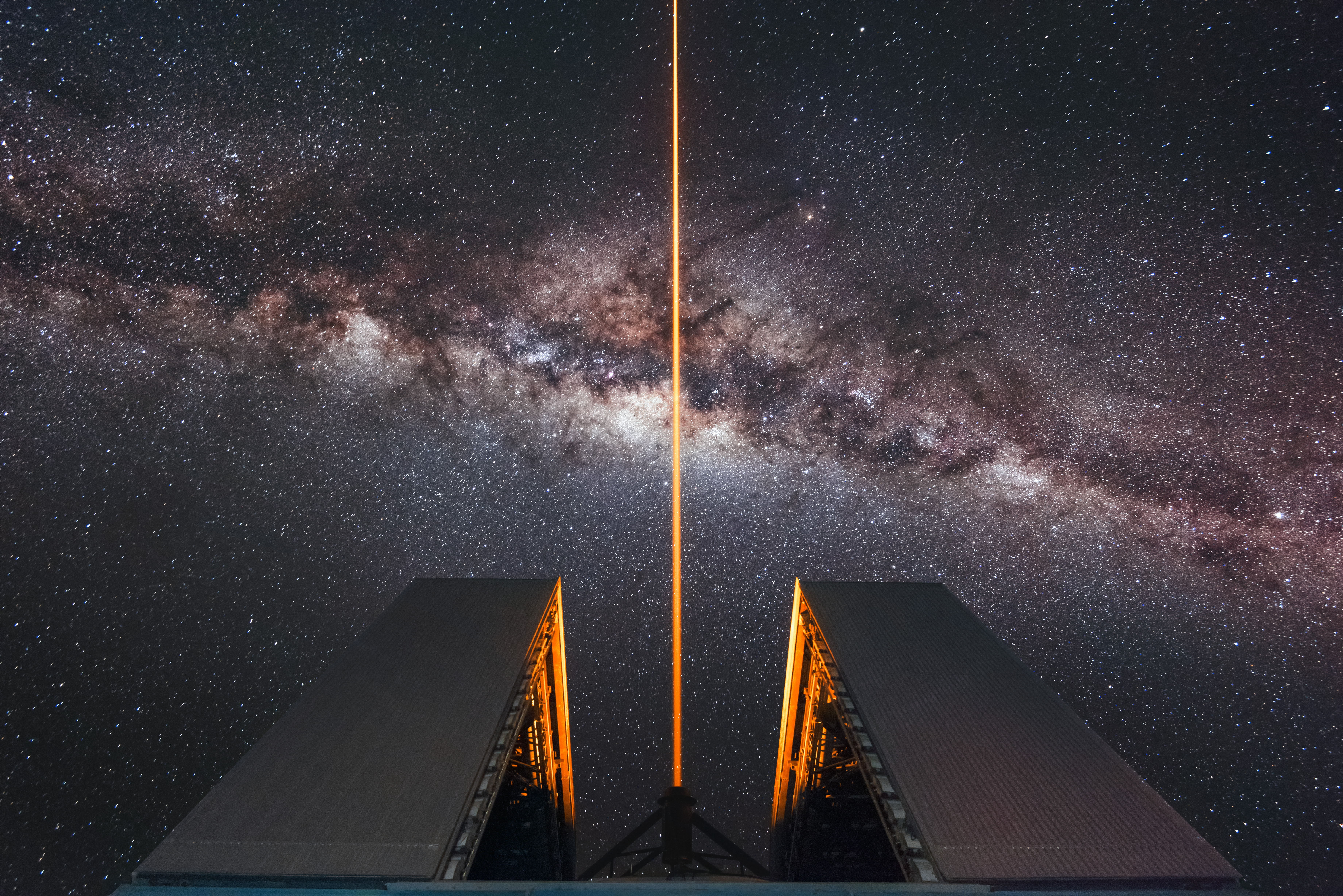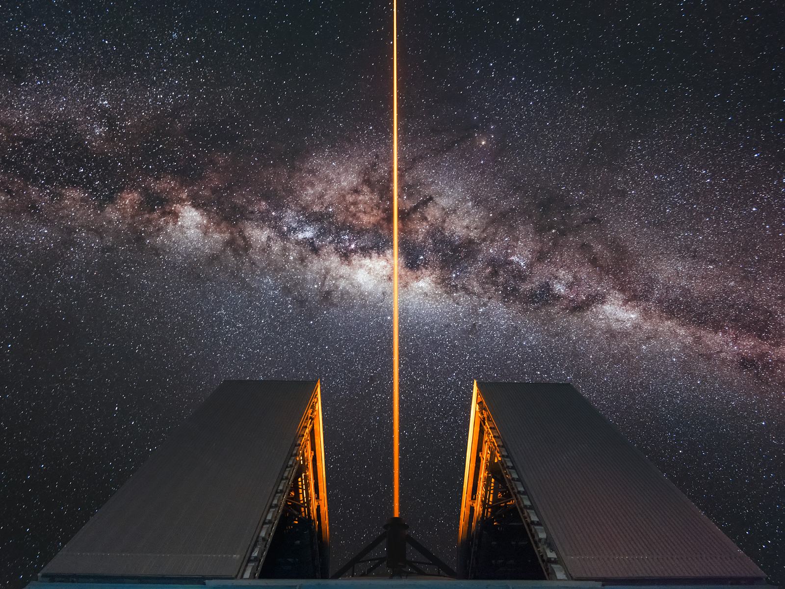 The familiar soft glow of the Milky Way is interrupted by the stark orange glow of a Laser Guide Star beam emanating from one of the Unit Telescopes that form part of ESO's Very Large Telescope (VLT). This premier observing facility is located at the Paranal Observatory in northern Chile.