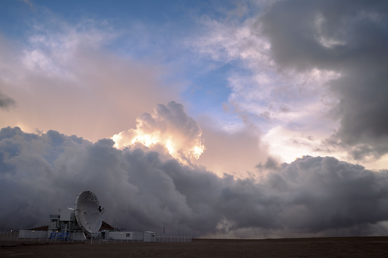 A towering wall of cloud prepares to sweep across the Chajnantor plateau and engulf one of the radio telescopes comprising the Atacama Large Millimeter/submillimeter Array (ALMA).