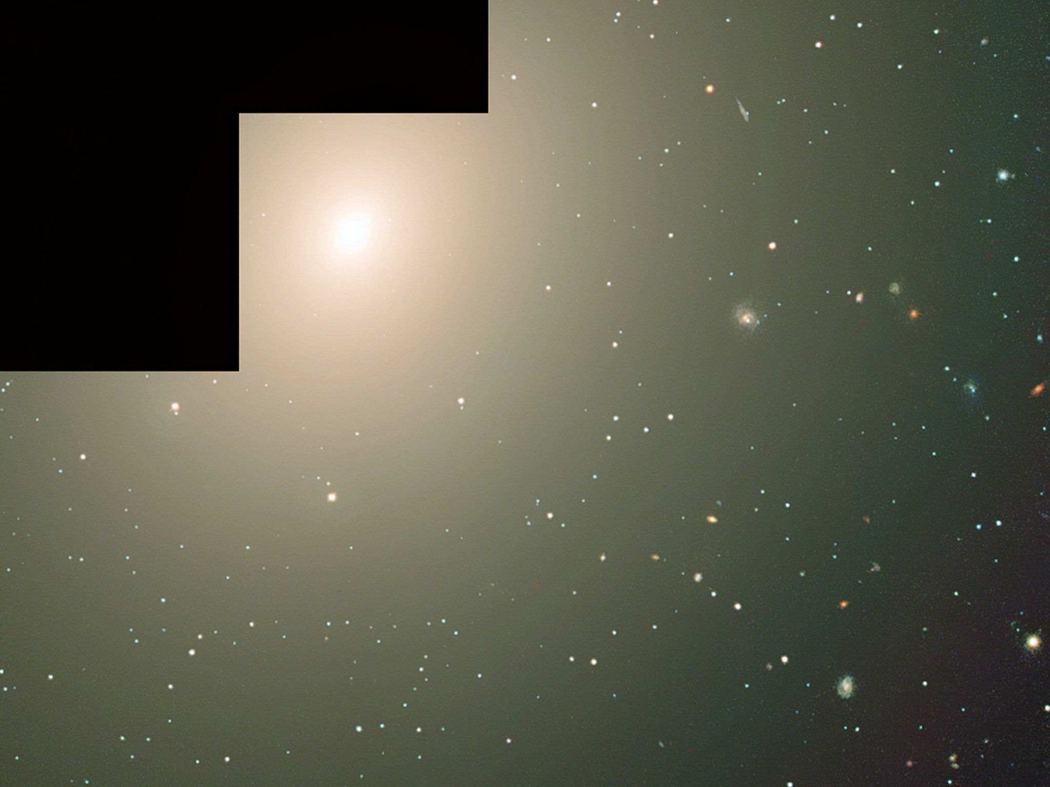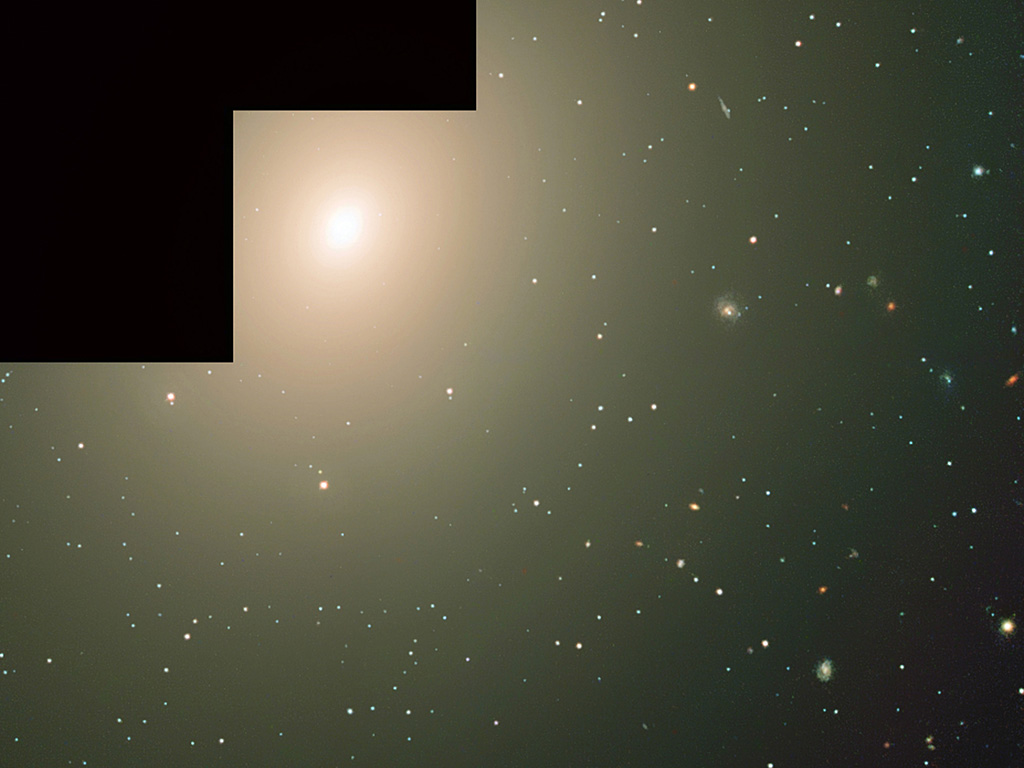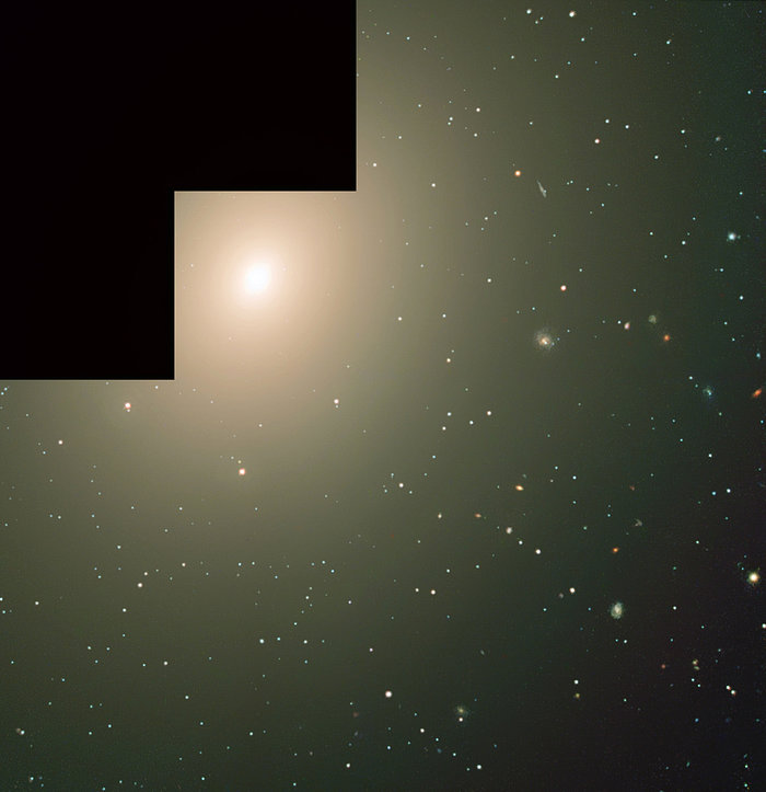 Colour composite of the elliptical galaxy NGC 4365, prepared from two exposures with the HST and one from the VLT. Many of the objects seen are stellar clusters in this galaxy. There are also a large number of background galaxies in the field.