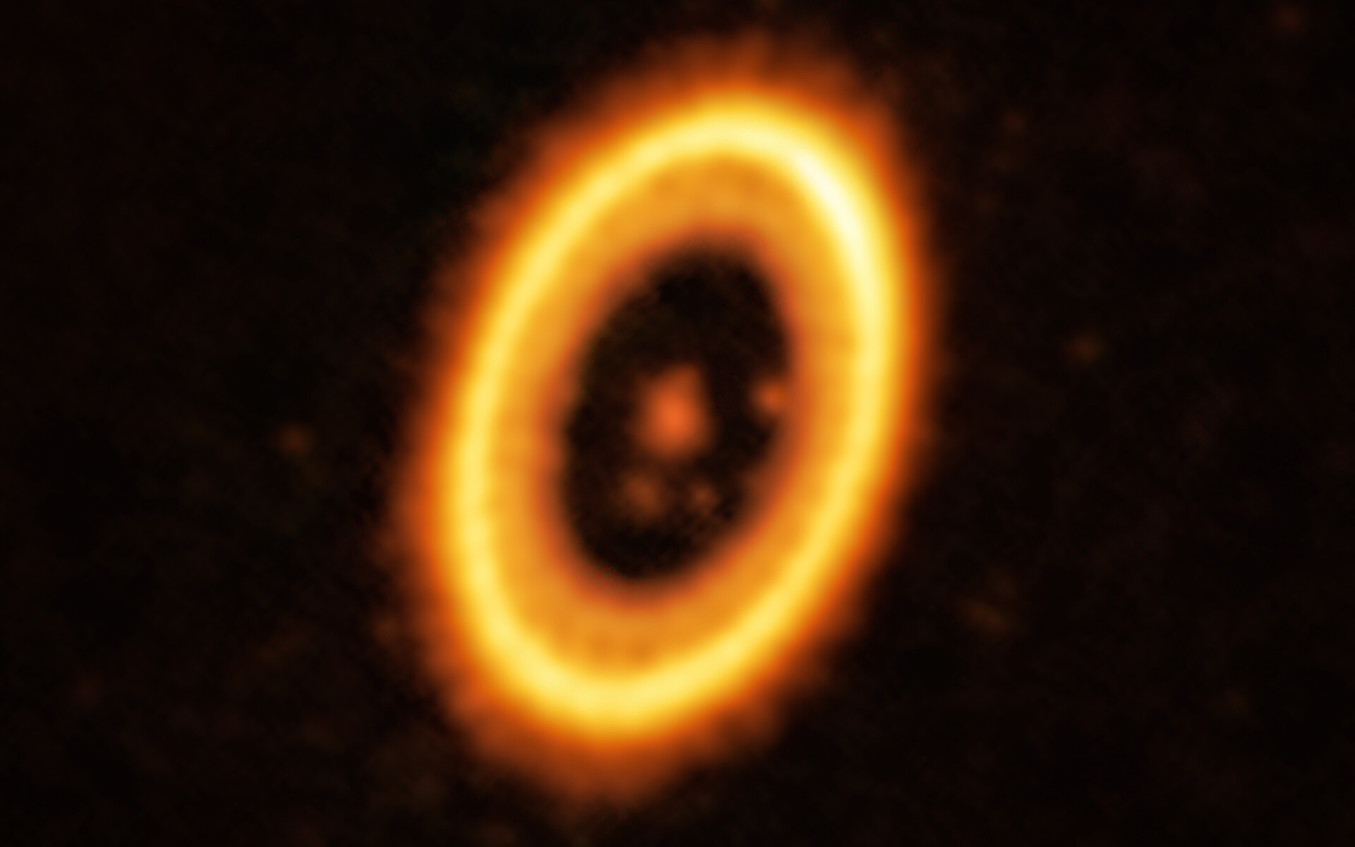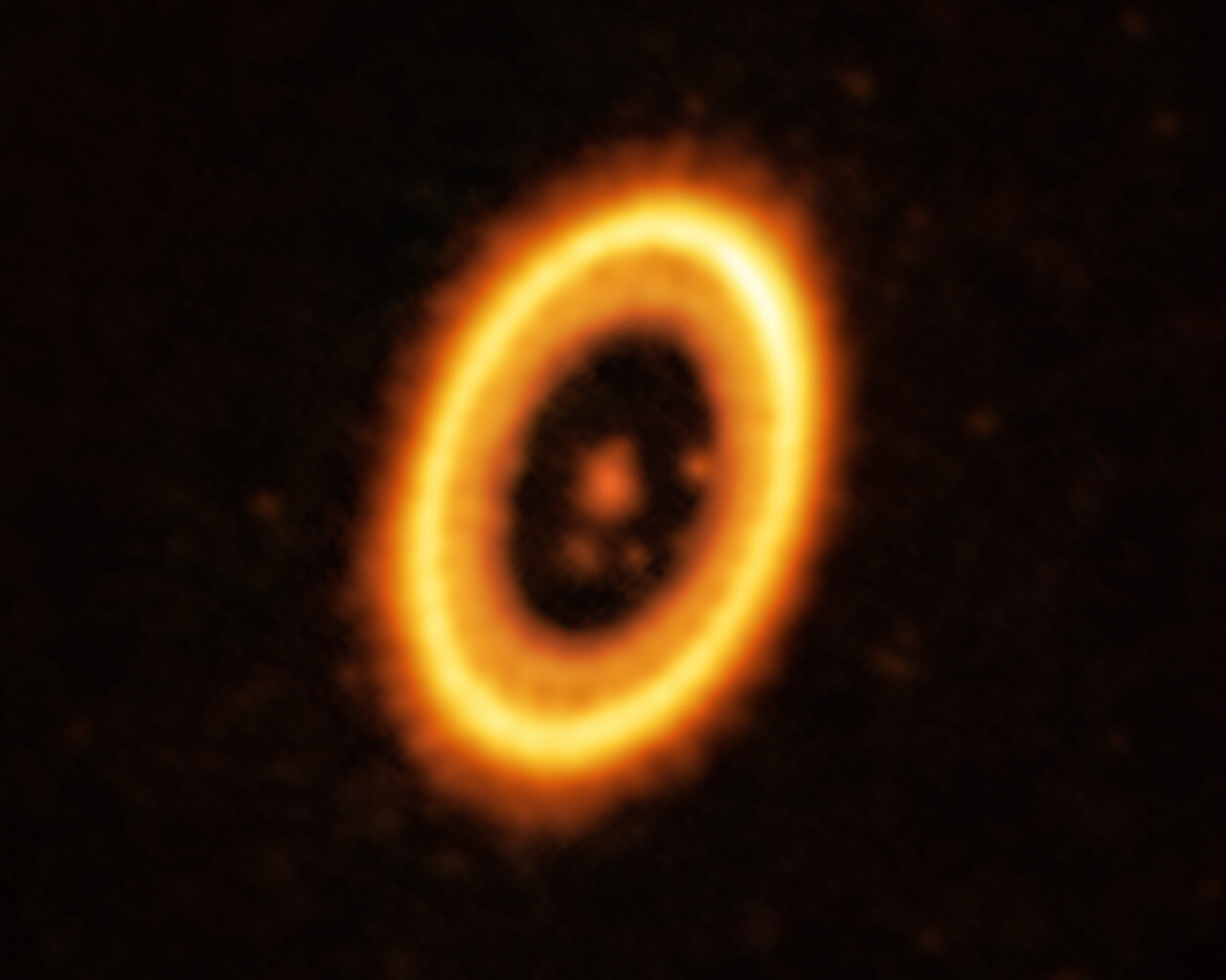 This image, taken with the Atacama Large Millimeter/submillimeter Array (ALMA), in which ESO is a partner, shows the young planetary system PDS 70, located nearly 400 light-years away from Earth. The system features a star at its centre, around which the planet PDS 70b is orbiting. On the same orbit as PDS 70b, astronomers have detected a cloud of debris that could be the building blocks of a new planet or the remnants of one already formed. The ring-like structure that dominates the image is a circumstellar disc of material, out of which planets are forming. There is in fact another planet in this system: PDS 70c, seen at 3 o’clock right next to the inner rim of the disc.