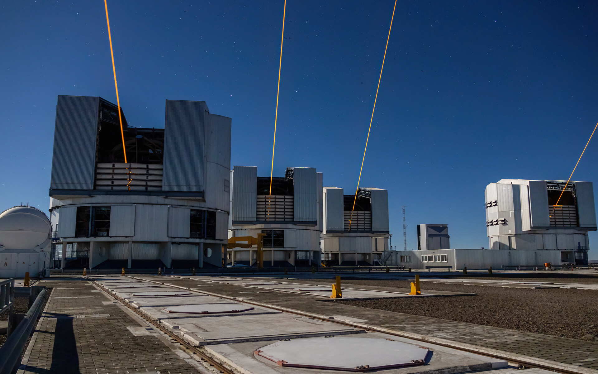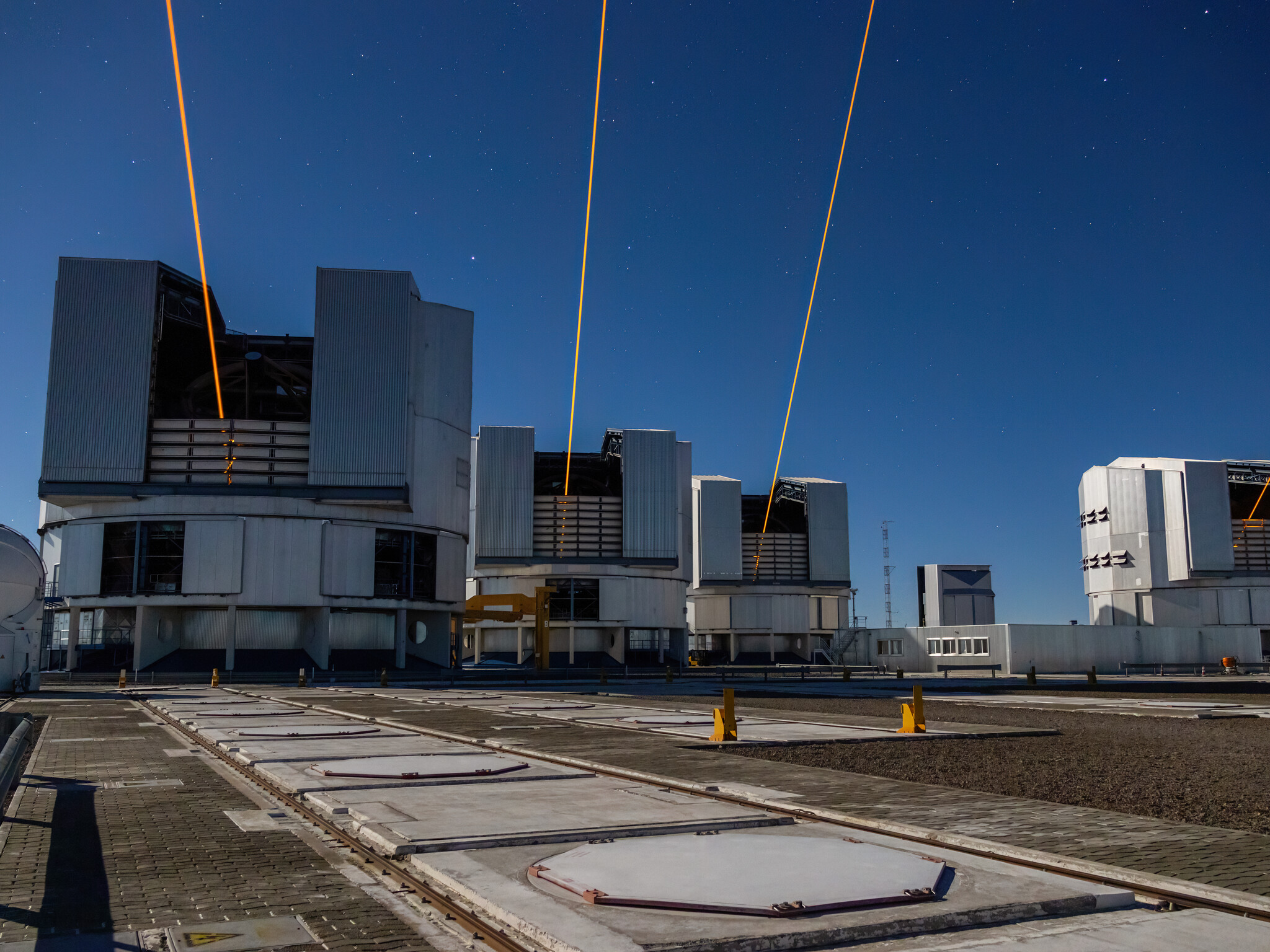 This photograph shows four lasers at ESO’s Paranal Observatory, each one launched from one of the four eight-metre telescopes on site. The launch of these lasers represents a significant milestone for ESO’s Very Large Telescope Interferometer (VLTI), which combines light from these eight-metre telescopes, and the GRAVITY+ project — a large and complex upgrade to the VLTI. With the installation of a laser at each of the eight-metre telescopes, a bright ‘fake’ star is created 90 km above Earth’s surface by each laser, enabling the correction of atmospheric blur anywhere on the sky. This unlocks the whole southern sky to the VLTI and enhances the observing power dramatically.