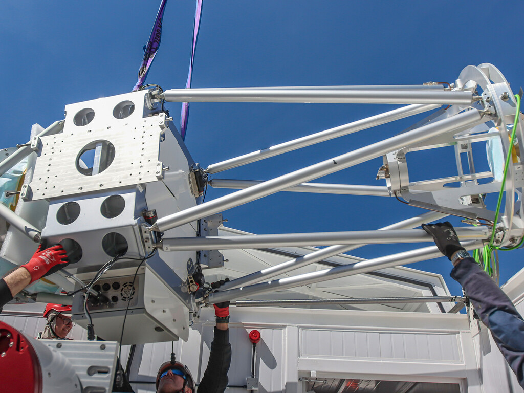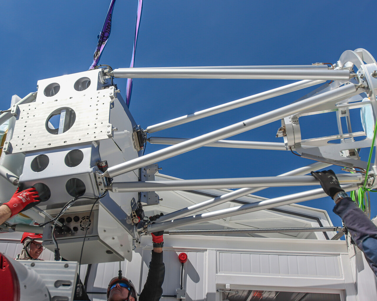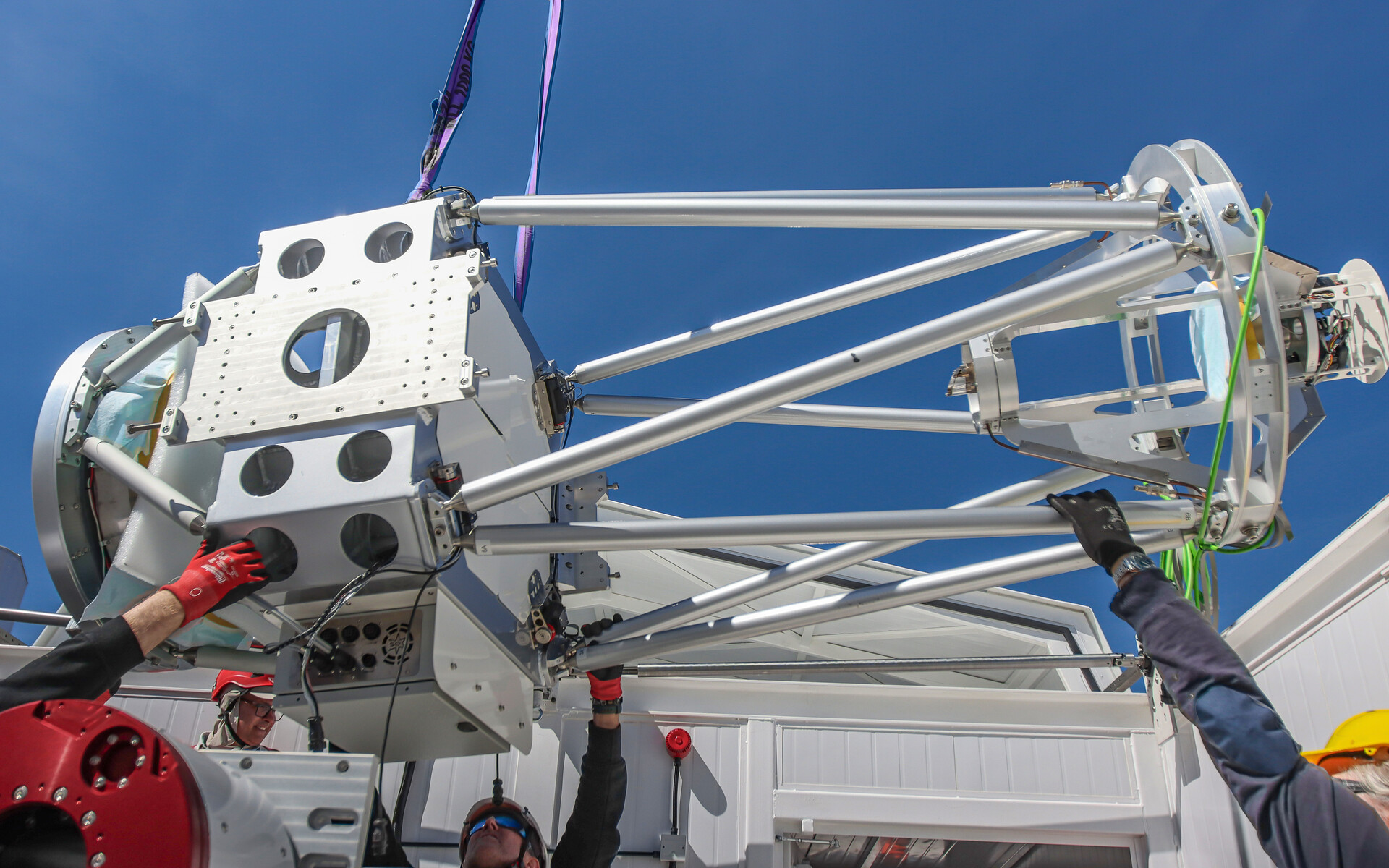 PoET’s main telescope, seen here being lowered into its dome, has a 60-cm mirror. PoET also has a second smaller telescope that collects light from the entire disc of the Sun.
