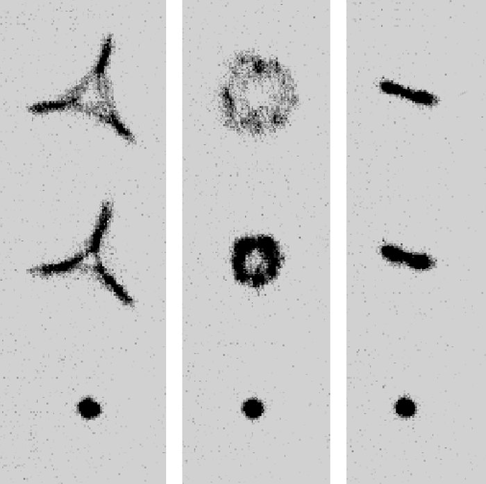 The VLT active optics system fully controls the primary and secondary mirrors. In this composite, images of stars are shown that were obtained during tests in which the control system forced the optical elements to produce three different image aberrations, namely triangular, round (defocus) and linear (astigmatism). This is done by applying different forces to each of the 150 individual active actuators on which the 8.2-m main mirror rests and to the position of the secondary mirror. In the case of the triangular aberration, the mirror was made to resemble Napoleon's hat. It is worth noting that the deviation of the mirror from its optimum shape is only 0.015 millimetres.