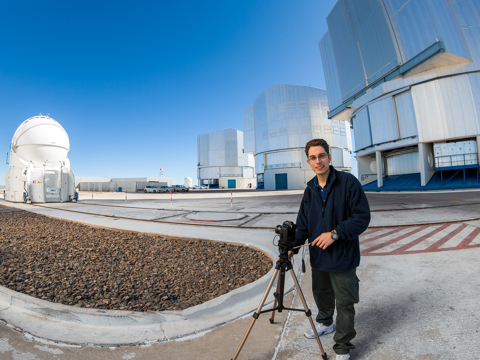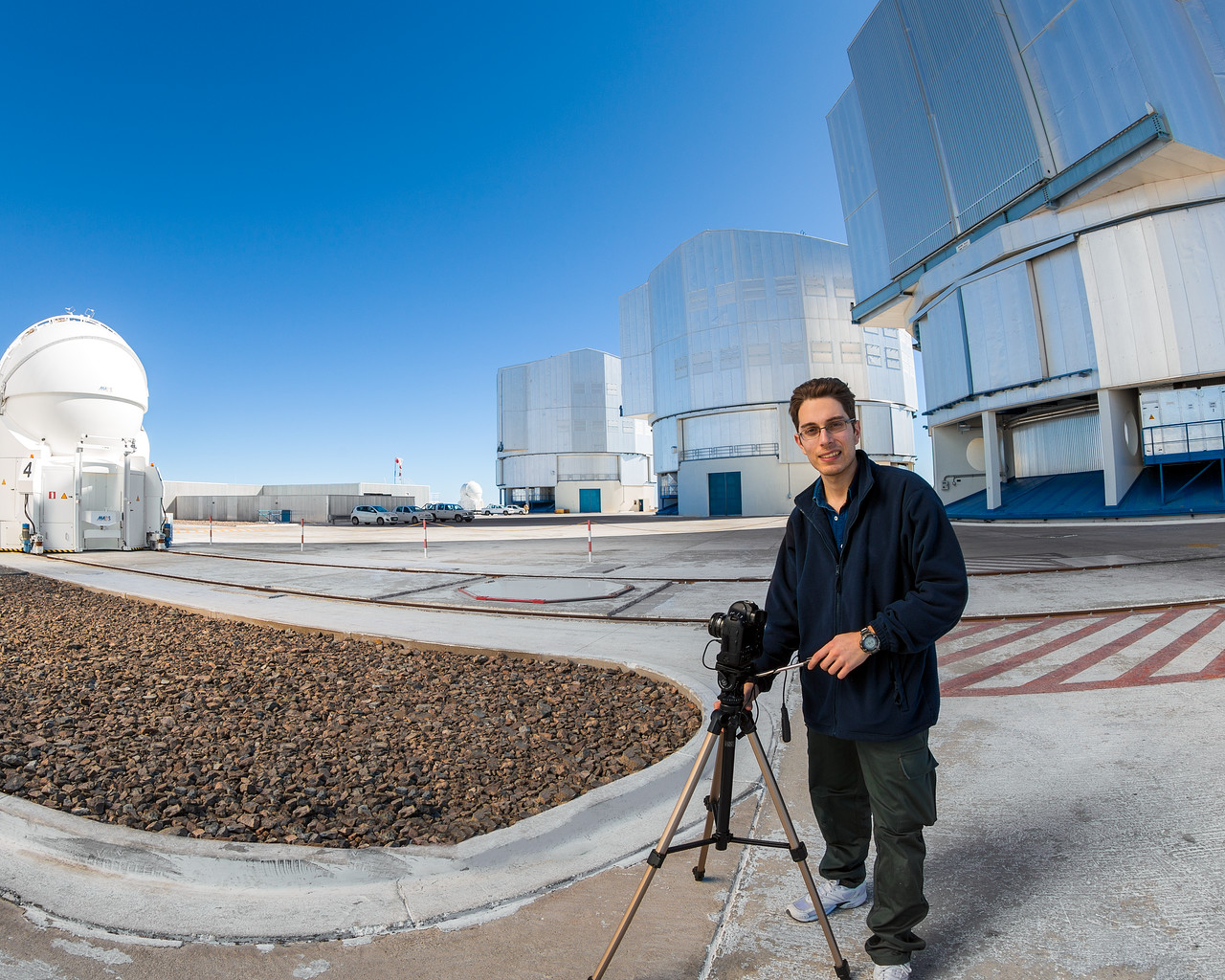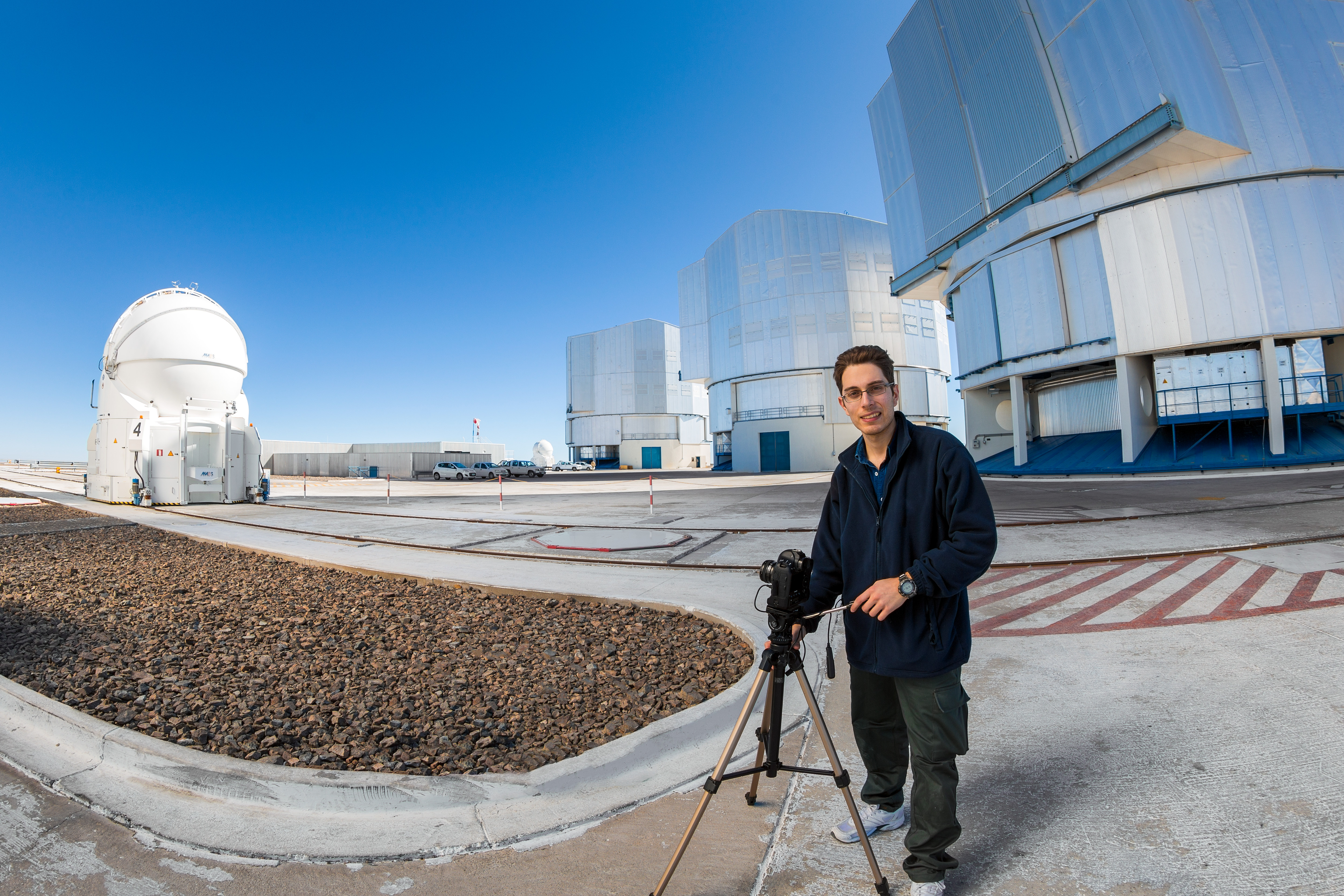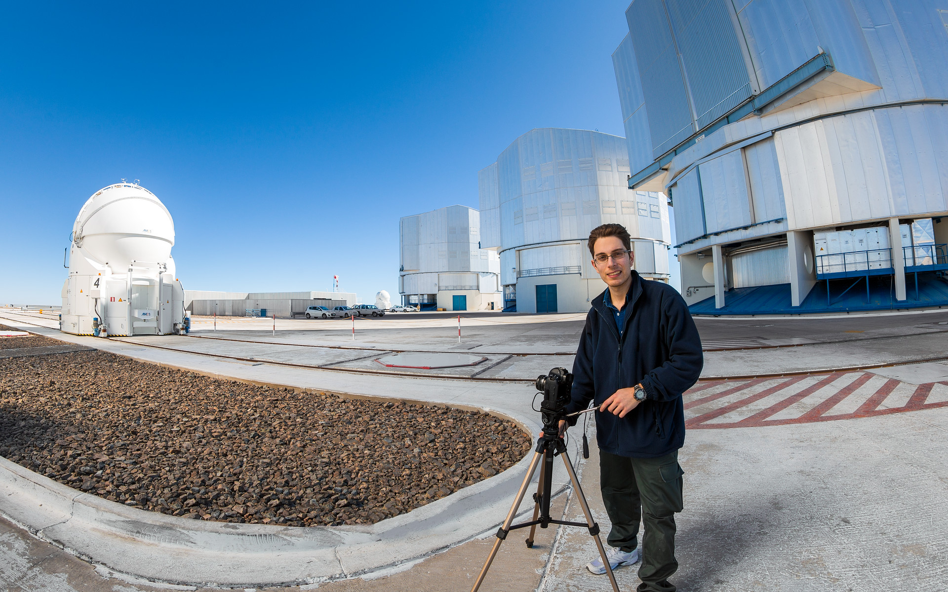 Fanis Matsopoulos poses in front of ESO's Very Large Telescope on Cerro Paranal in Chile. Fanis is a member of the Fulldome Expedition team which is visiting Chile to obtain photographic material for use in planetarium presentations.