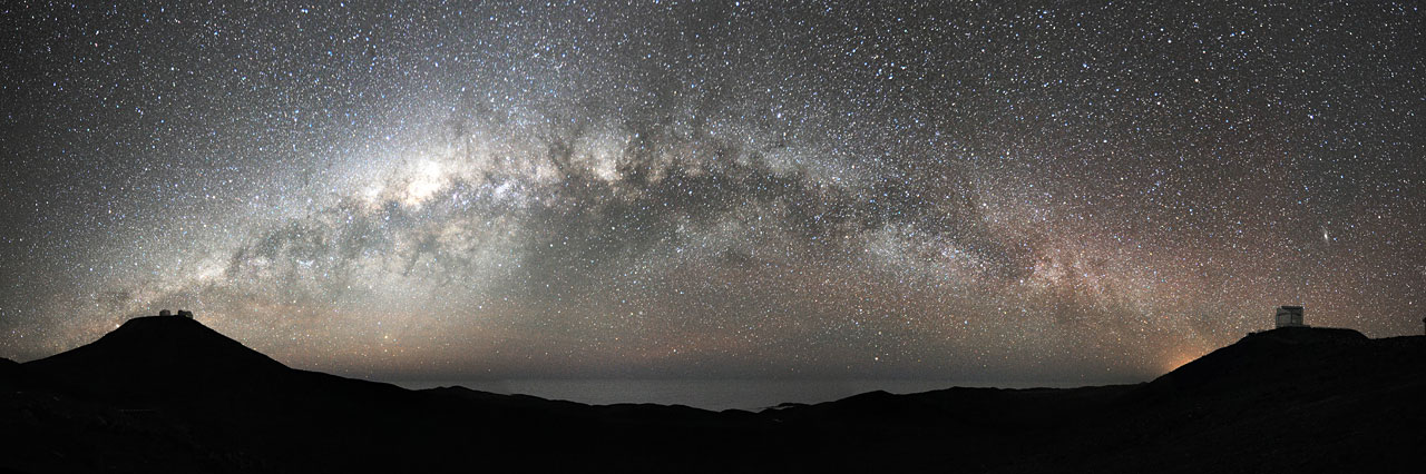 Our own galaxy, the Milky Way, appears in this stunning wide angle view as a bridge which seems to connect Paranal Mountain, the VLT site (on the left) with the nearby peak, home of the VISTA survey telescope. The brightest area, crossed by dark lanes corresponds to the central bulge of our galaxy that we see perfectly edge-on. On the right, just above the VISTA telescope, the Andromeda galaxy (M31) is clearly visible as an elongated bright spot. M31 is a giant spiral galaxy, larger than the Milky Way, member of our Local Group and located some 2 million light-years away. Because of the exceptional quality of the sky, stars are still perfectly visible just above the horizon, where clouds typically cover the Pacific Ocean, only 12 km away from the observatory.