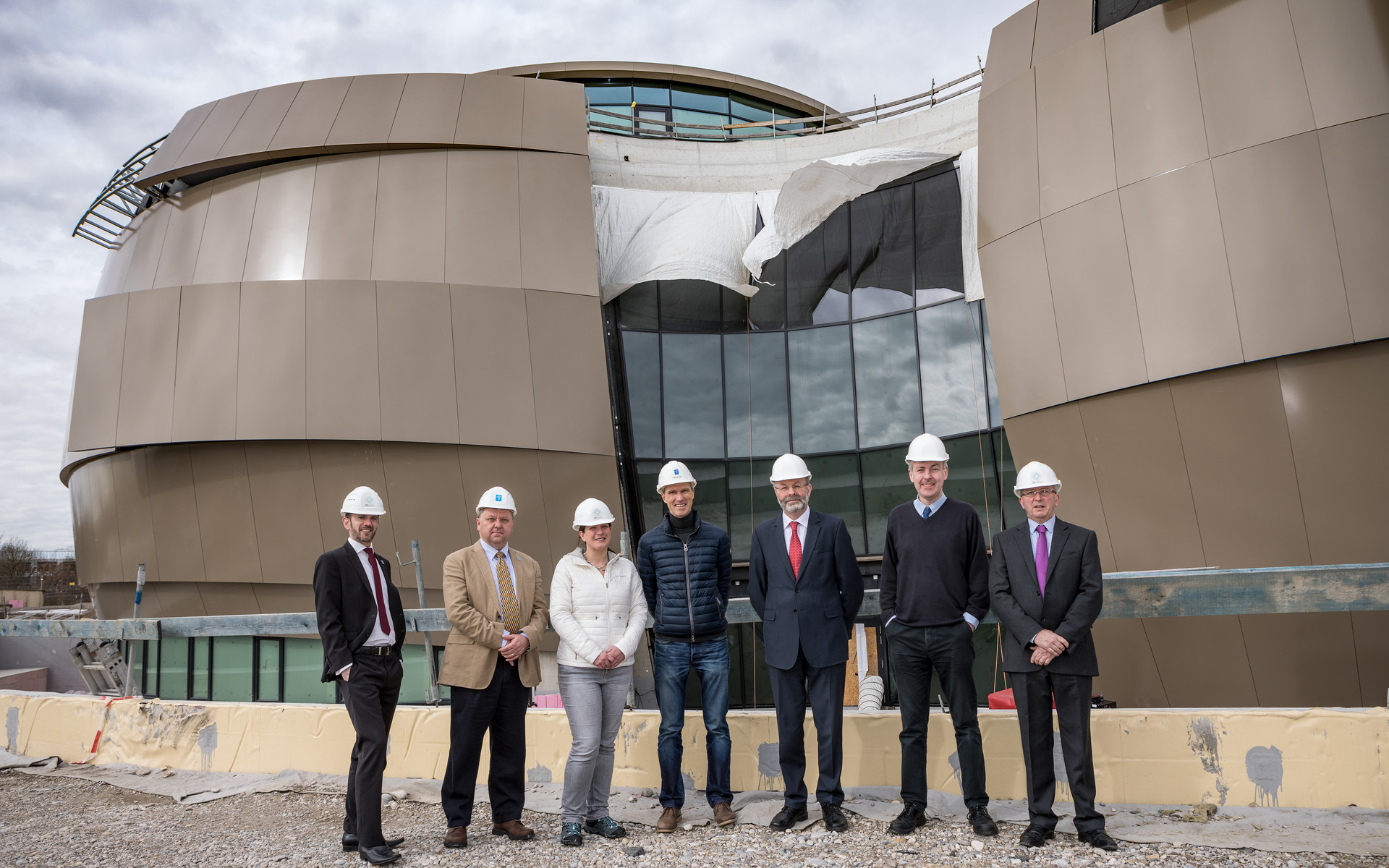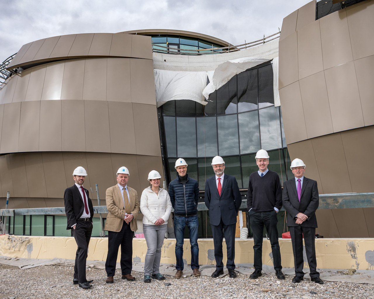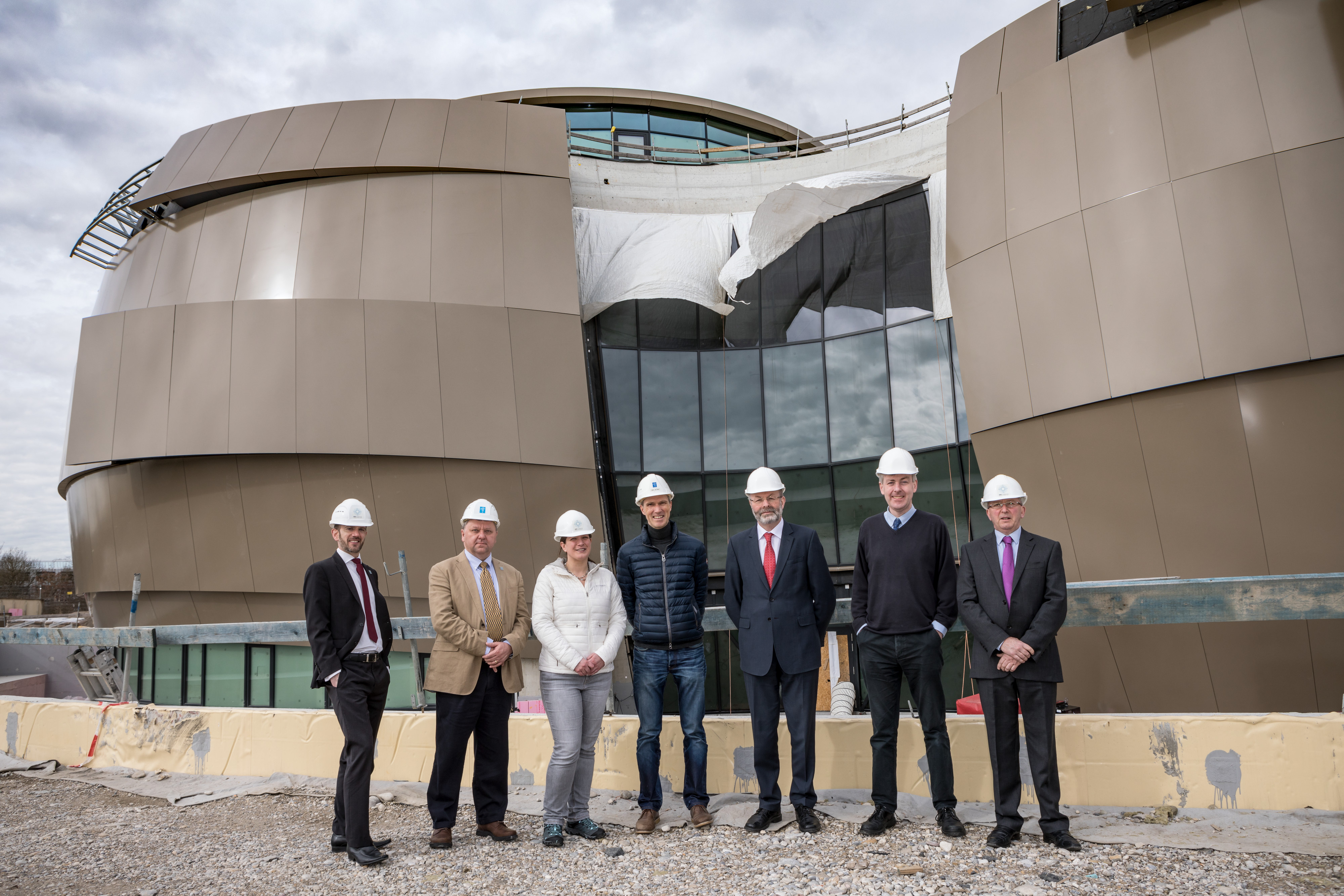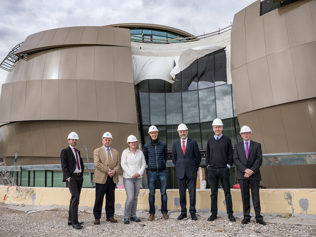 The recently appointed CEO of STFC (Science, Technology and Facilities Council) visits the construction site of the ESO Supernova Planetarium & Visitor Centre. The visit also featured a meeting with the Director General and a tour of ESO HQ in Garching, Germany. From left to right: Andrew Williams (ESO), Dr Adrian Russell (ESO), Tania Johnston (ESO), Fabian Reckmann (ESO), Dr Brian Bowsher (CEO of STFC), Prof Graham Blair (Executive Director, Programmes and a member of the Executive Board of STFC) and Dr Colin Vincent (STFC and ESO Council delegate).