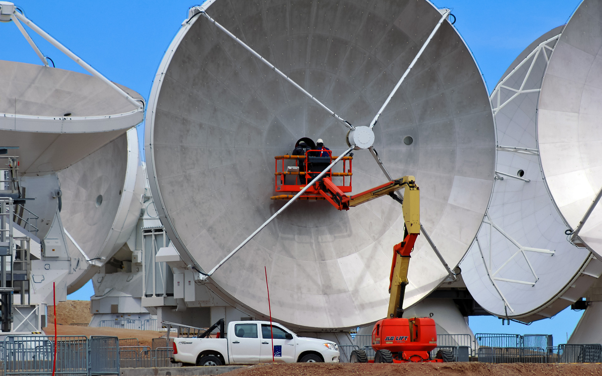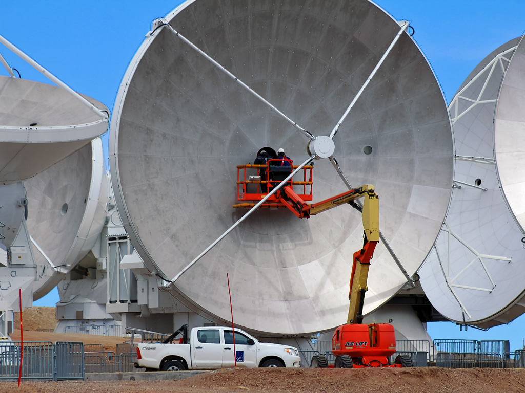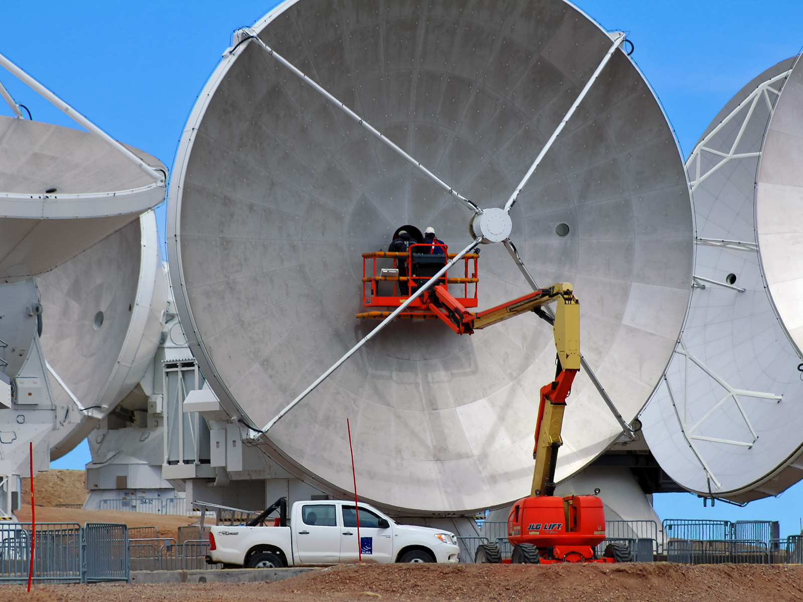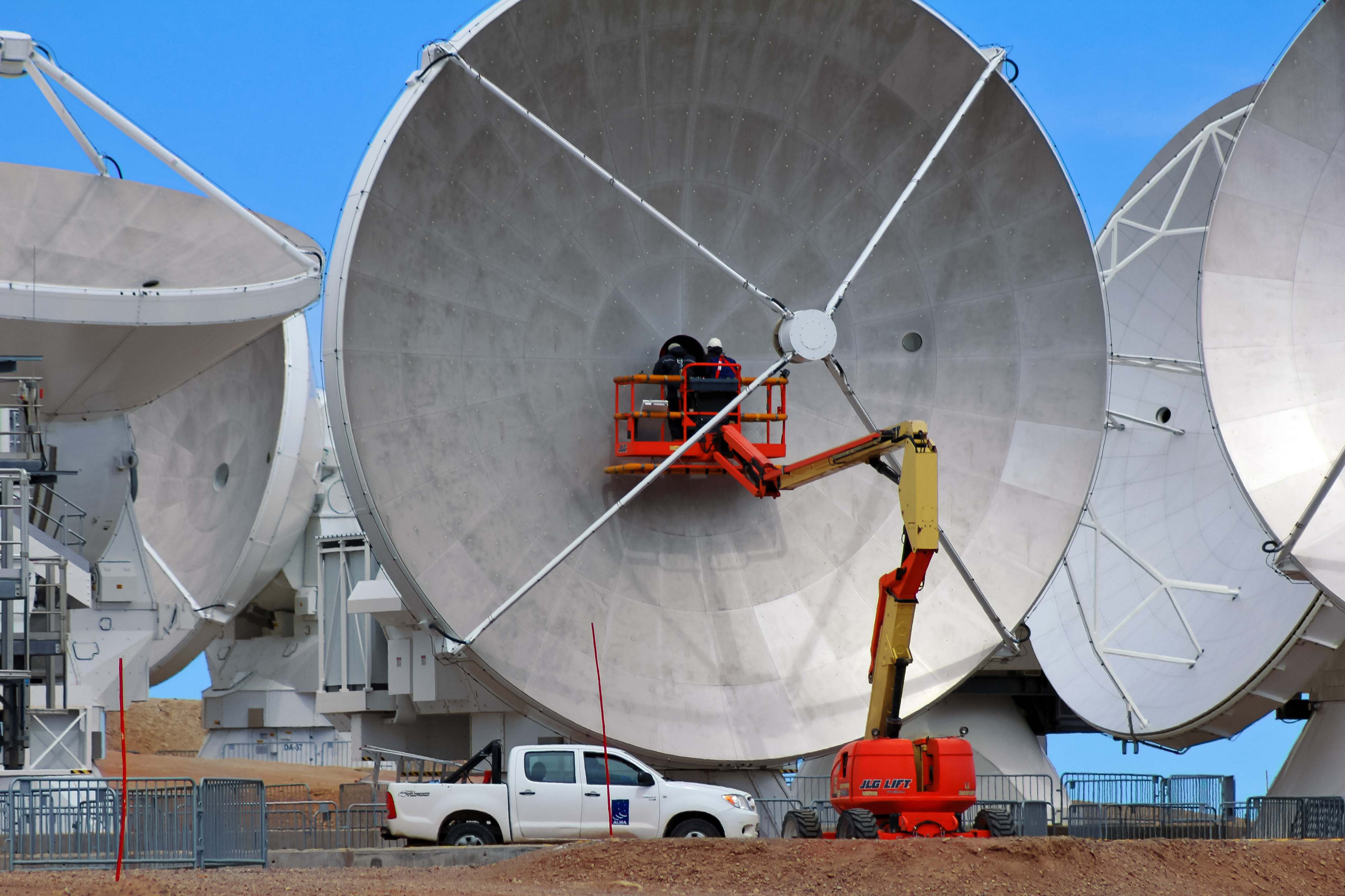 The mighty dish of an Atacama Large Millimeter/submillimeter Array (ALMA) radio telescope is inspected in this shot from the Chajnantor Plateau in Chile. The true scale of the telescope and its 12-metre dish can be judged here, as it towers over the workmen, their truck and a small cherry picker!