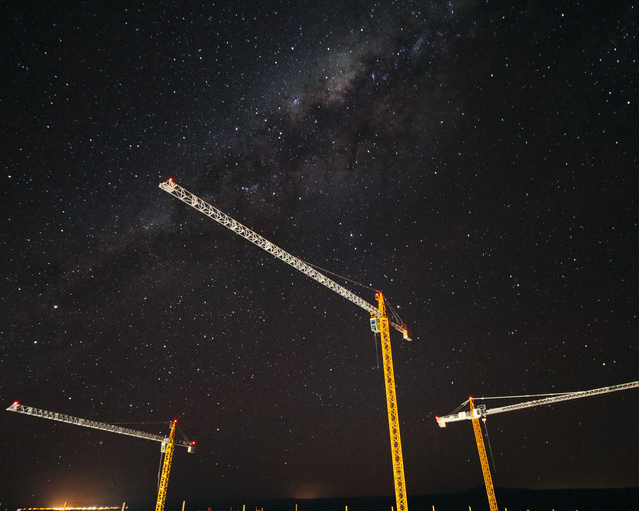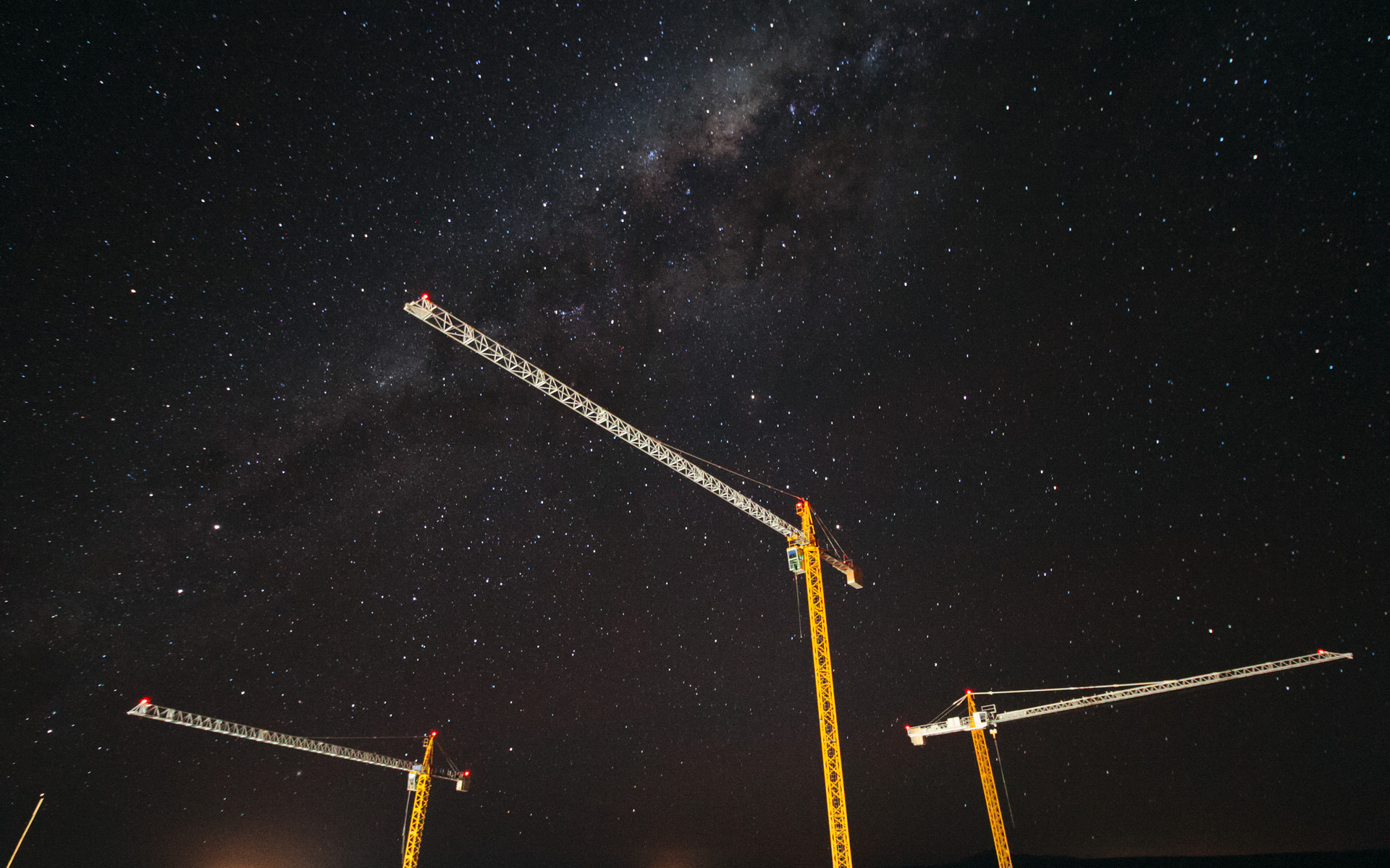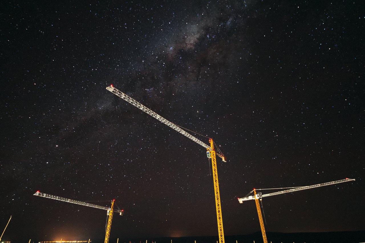 Three cranes working on the construction of the ALMA Residencia are backdropped by the stunning plane of our home galaxy, the Milky Way, in this shot from the ALMA Operations Support Facility, close to San Pedro de Atacama in northern Chile.