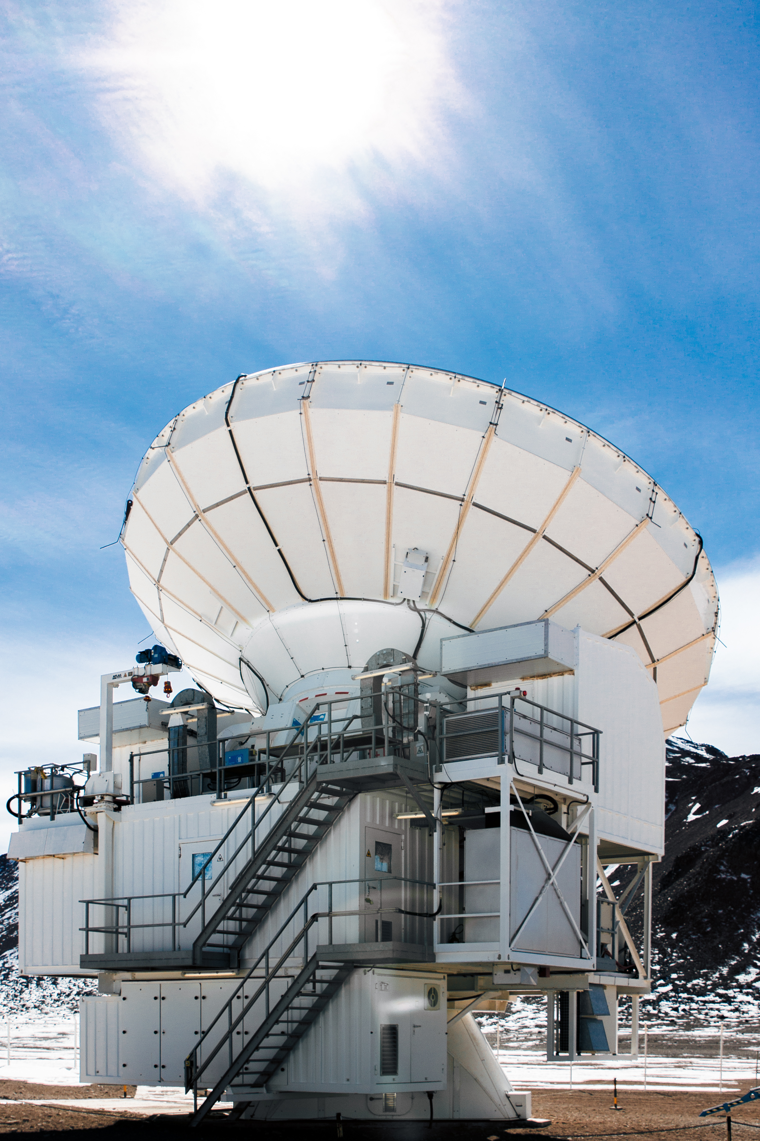 Hugging instrument enclosures attached to the ESO operated Atacama Pathfinder Experiment (APEX) telescope are seen in the foreground of a snowy scene on Chajnantor Plateau in northern Chile.