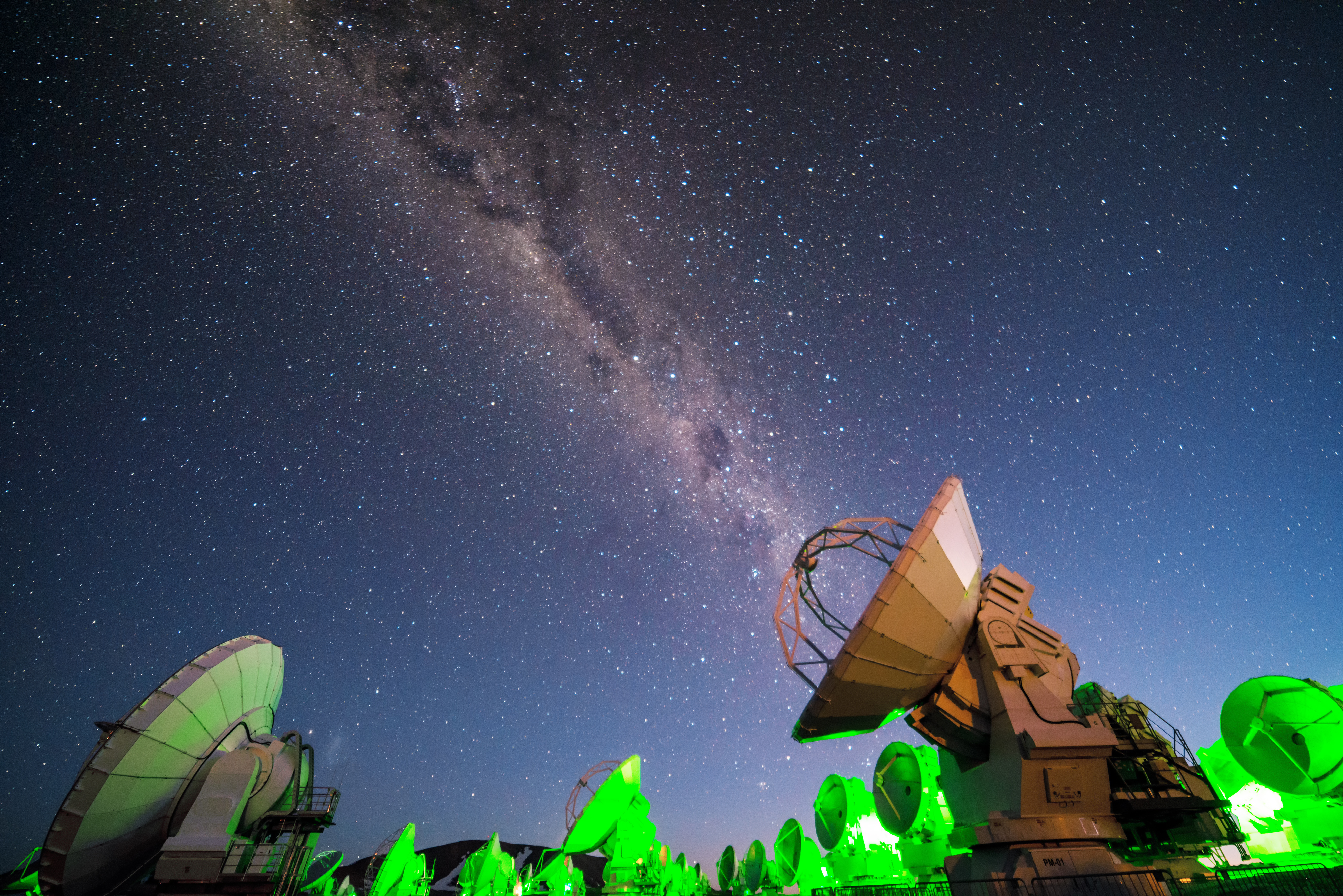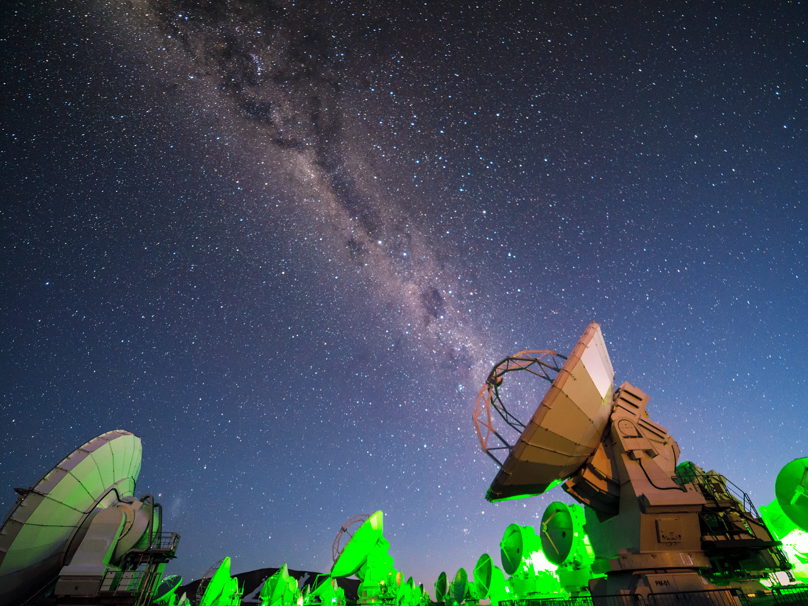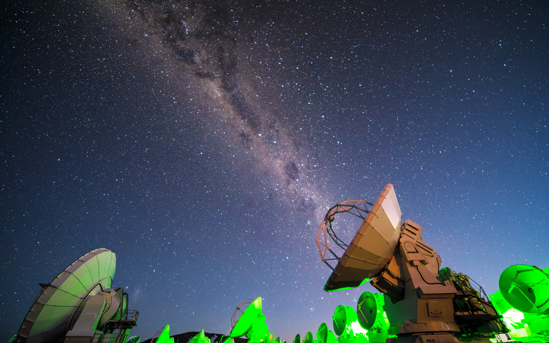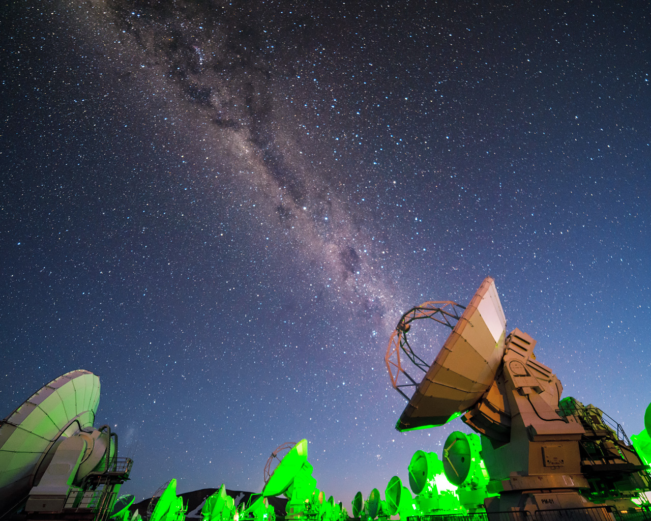 Bathed in an artificial green glow, the Atacama Large Millimeter/submillimeter Array (ALMA) radio telescopes observe the natural luminescence of the Milky Way.