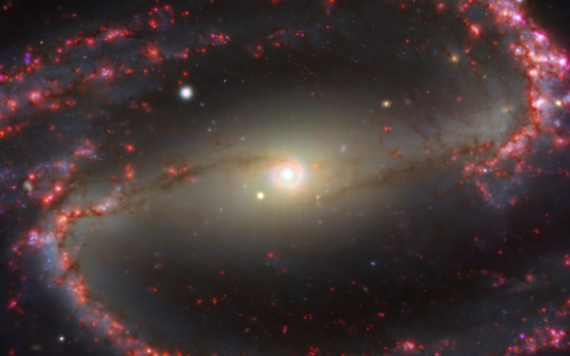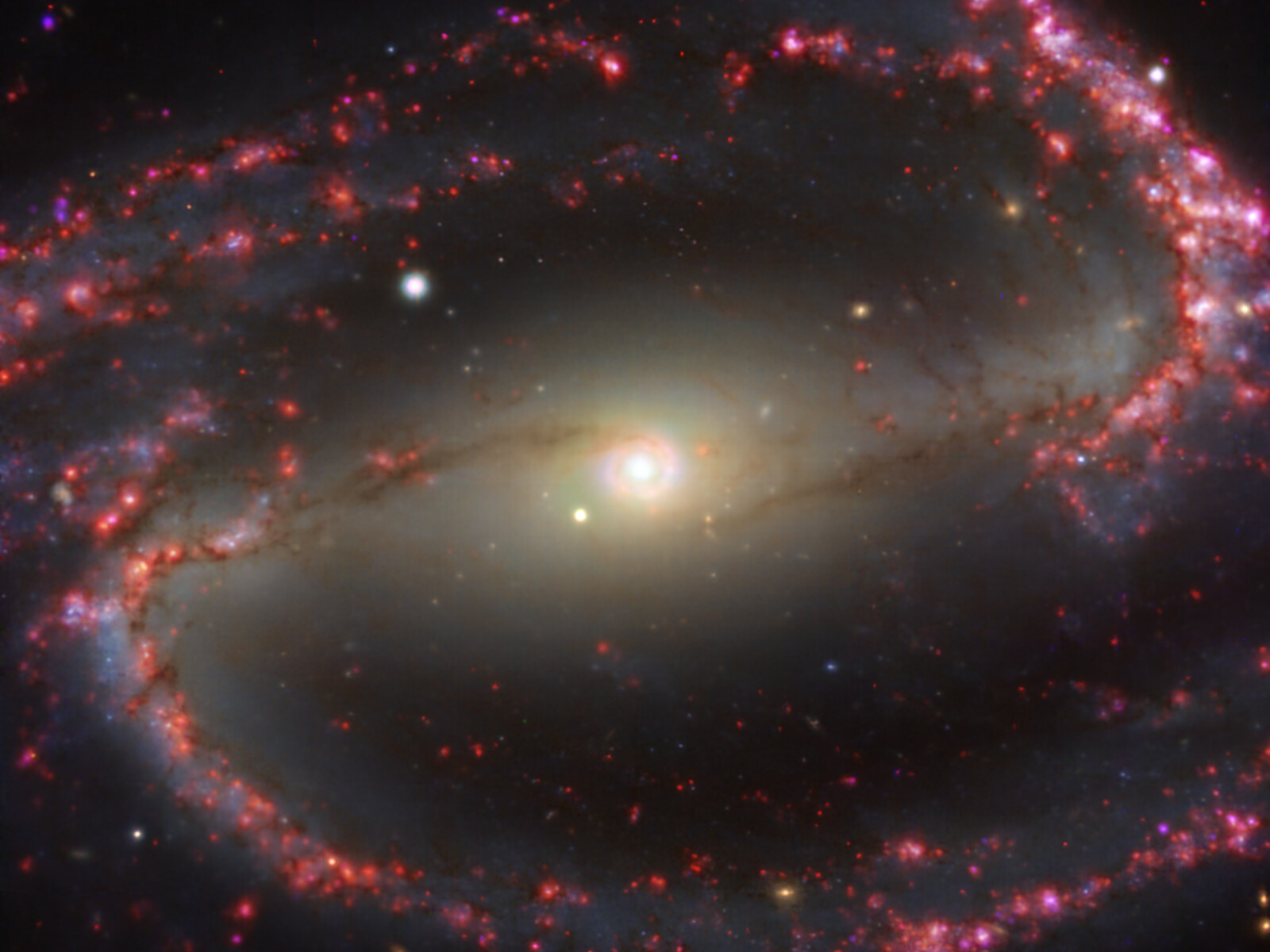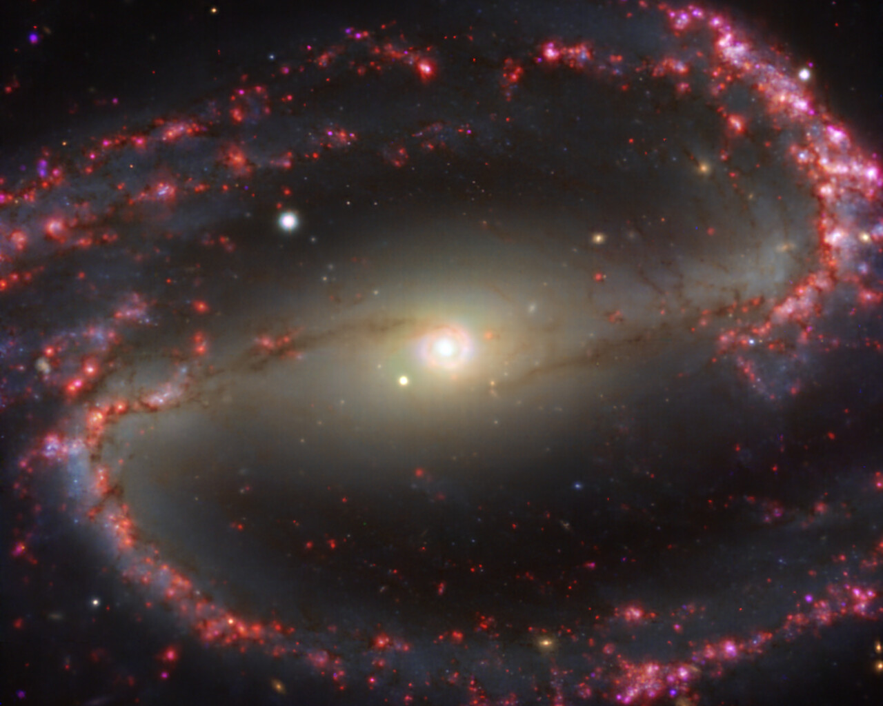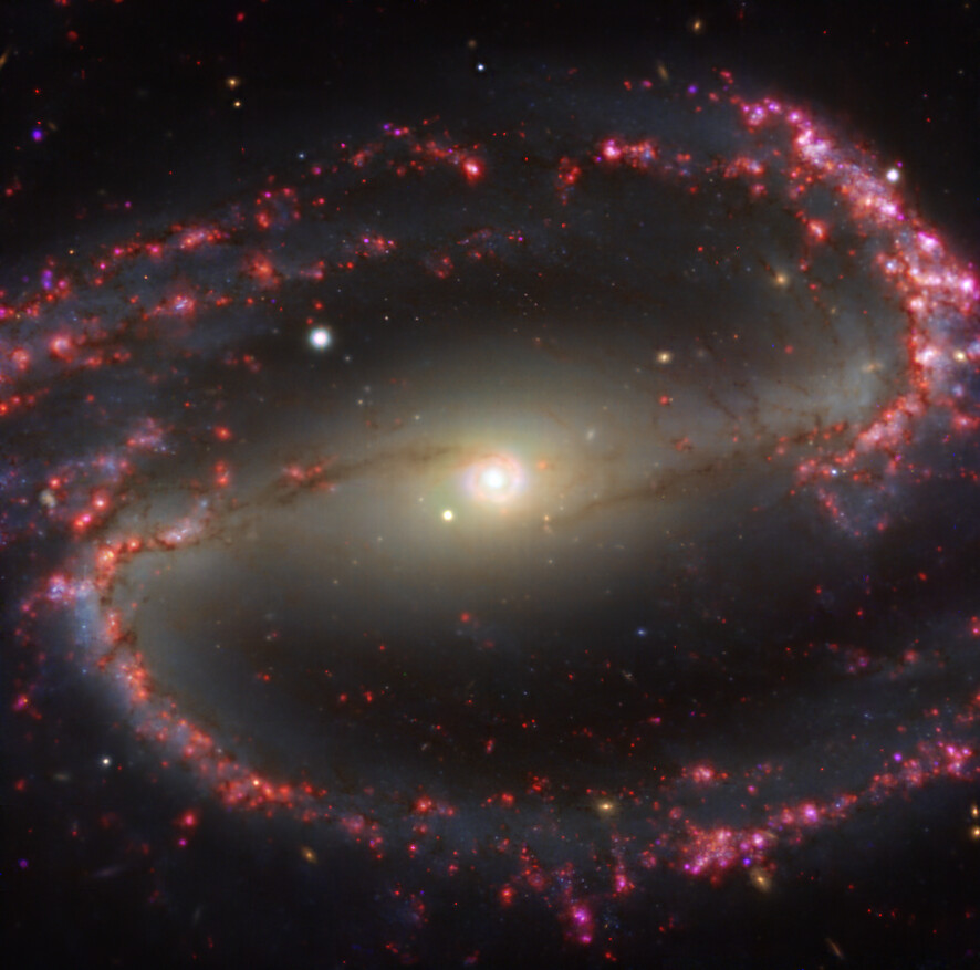 This image of the nearby galaxy NGC 1300 was taken with the Multi-Unit Spectroscopic Explorer (MUSE) on ESO’s Very Large Telescope (VLT). The bright reddish glows map warm clouds of hydrogen (Hα), marking the presence of newly born stars, while the bluish regions (a combination of green, red and infrared filters) reveal the distribution of slightly older stars.
