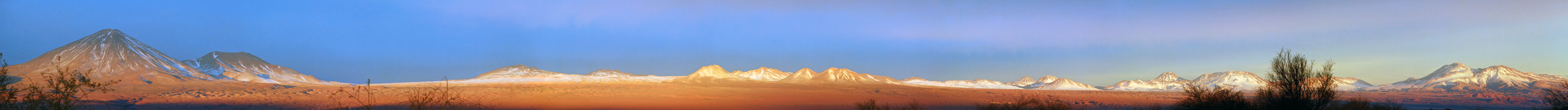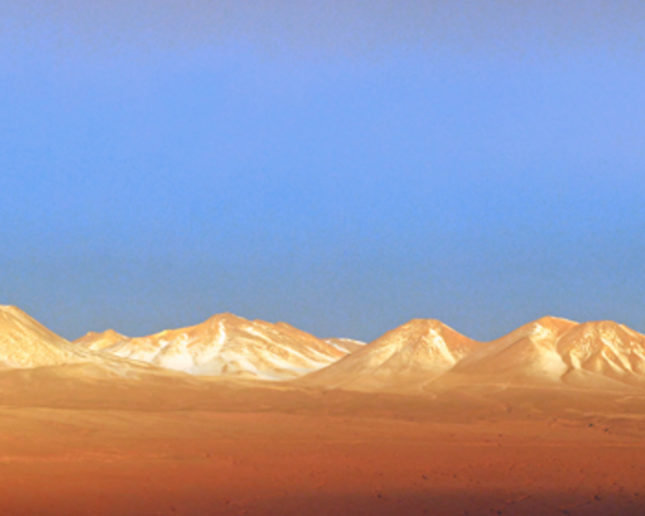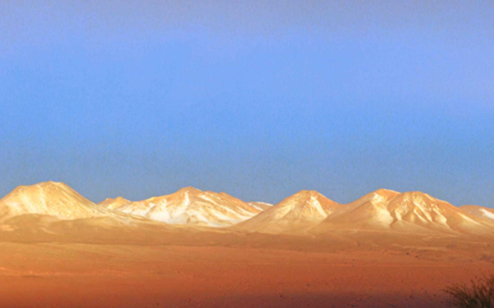 A view of the desert on the way to the ALMA. The Licancabur volcano can be seen to the left. The road from the "highway" can be seen, up to Operations Support Facility (OSF) lower right, and further up to the Array Operations Site (AOS).