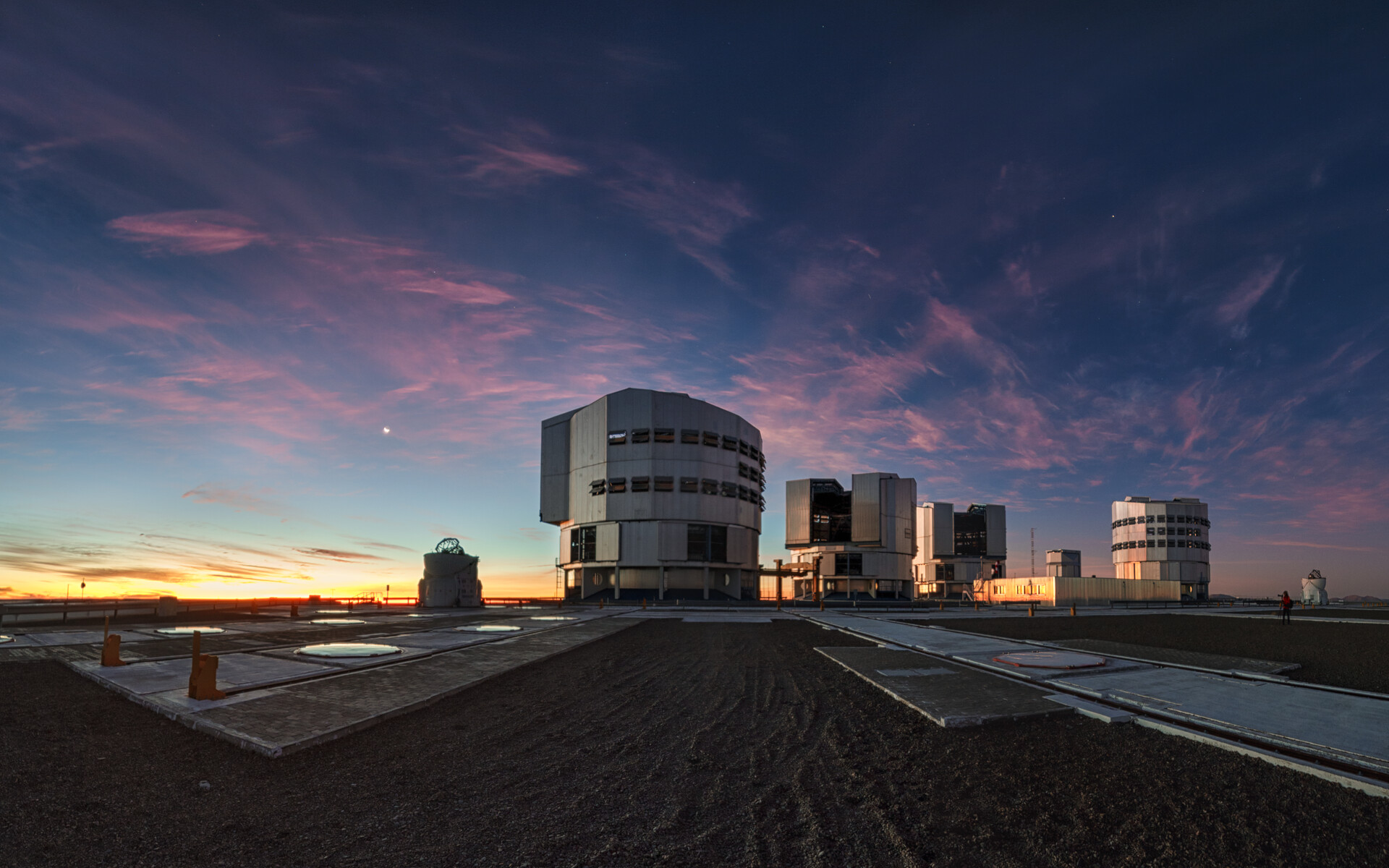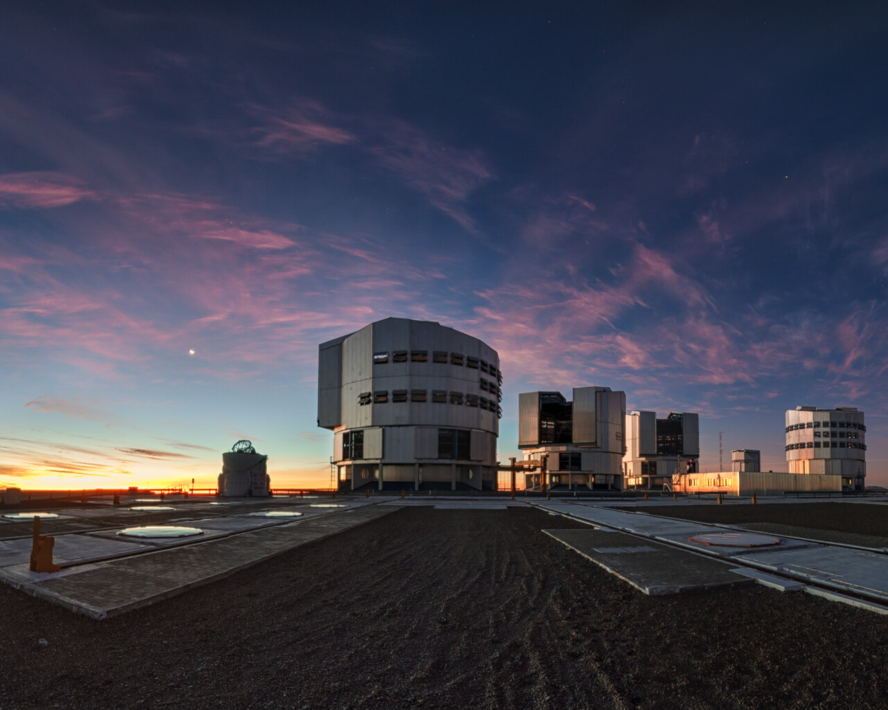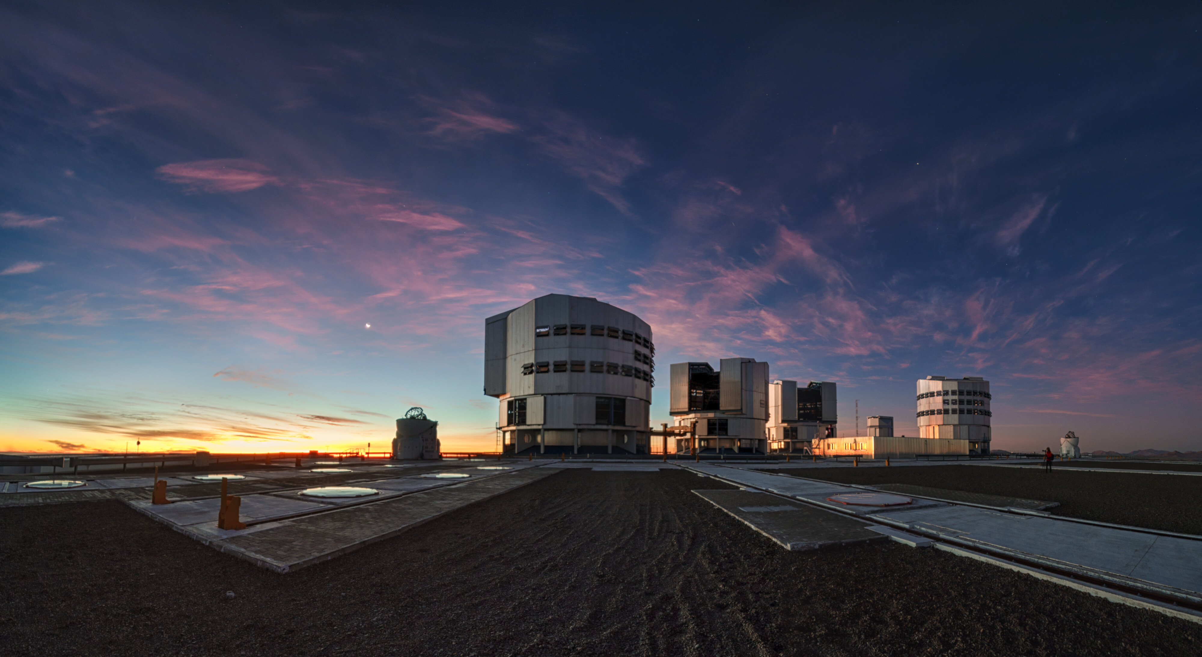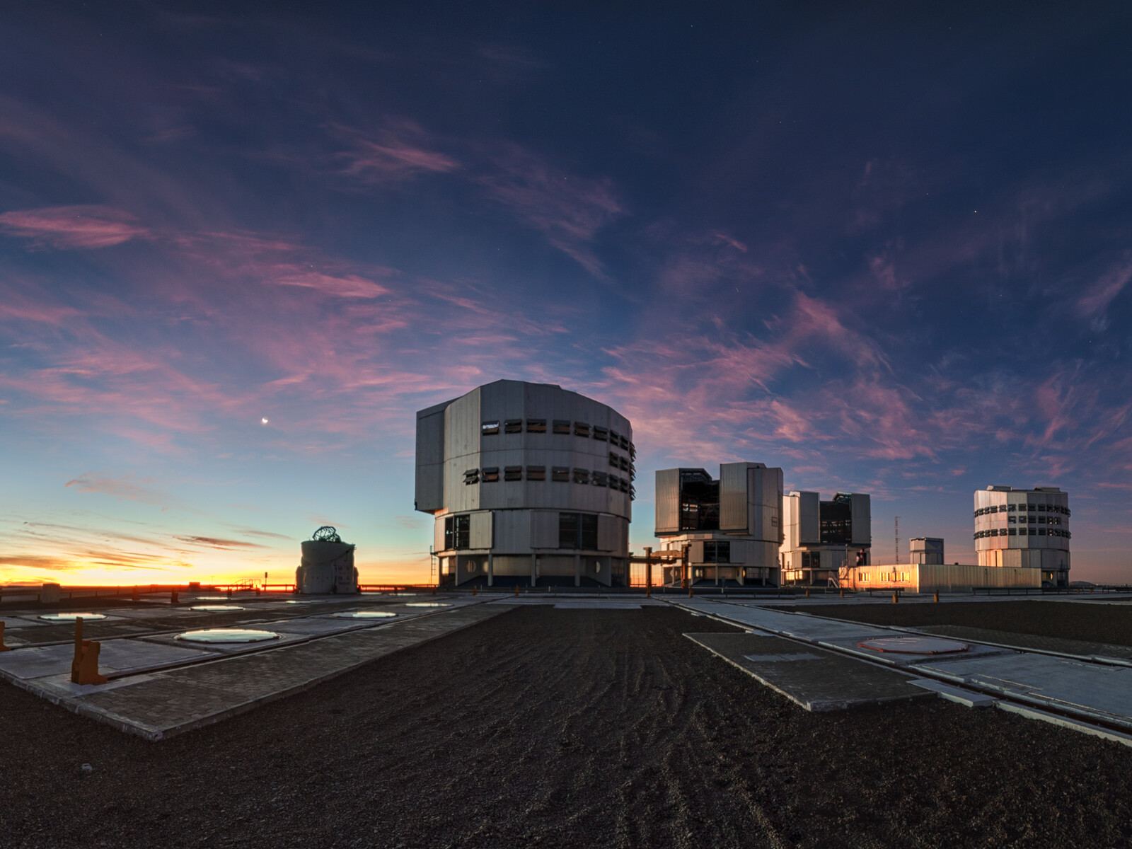 Dramatic dusk with dissipating thin clouds over ESO Paranal Observatory captured on 4 July 2019 (just 2 days after the total solar eclipse at La Silla). The crescent Moon can be seen on left.