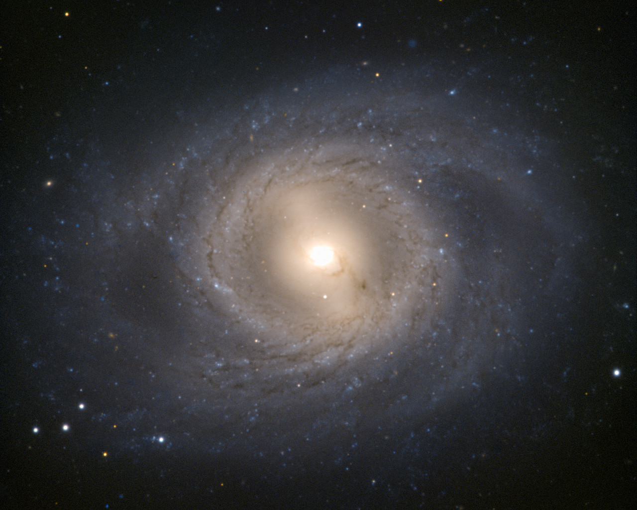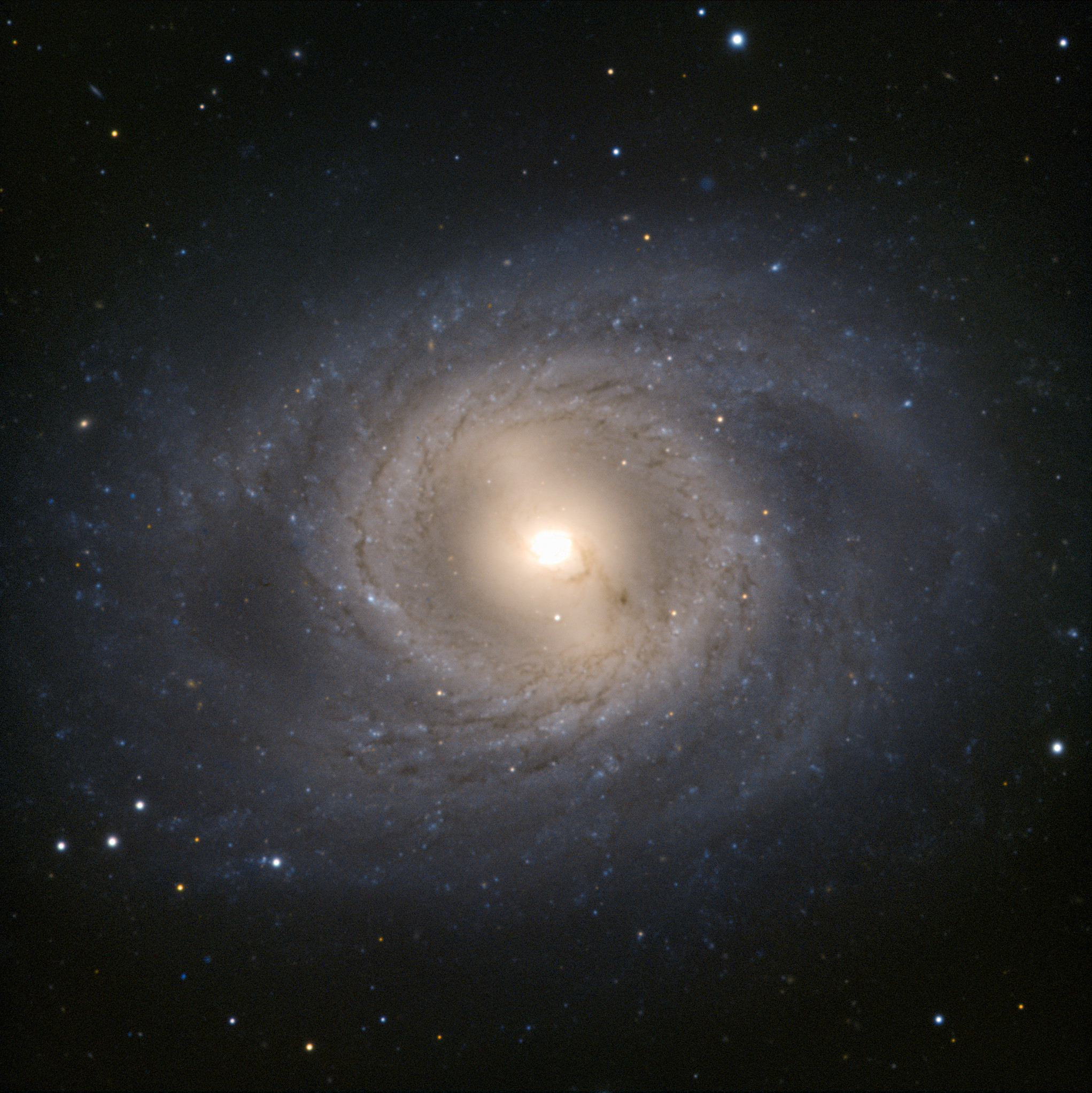 Stop press! By coincidence Messier 95 is the host of a probable supernova that was first spotted on 17 March 2012. Discovery details are here. And as another coincidence both supernova and galaxy are currently very close to the brilliant planet Mars amongst the stars of Leo. Please note that the observations used to make this Picture of the Week were taken before the supernova occurred, and therefore the supernova itself does not appear in this image.